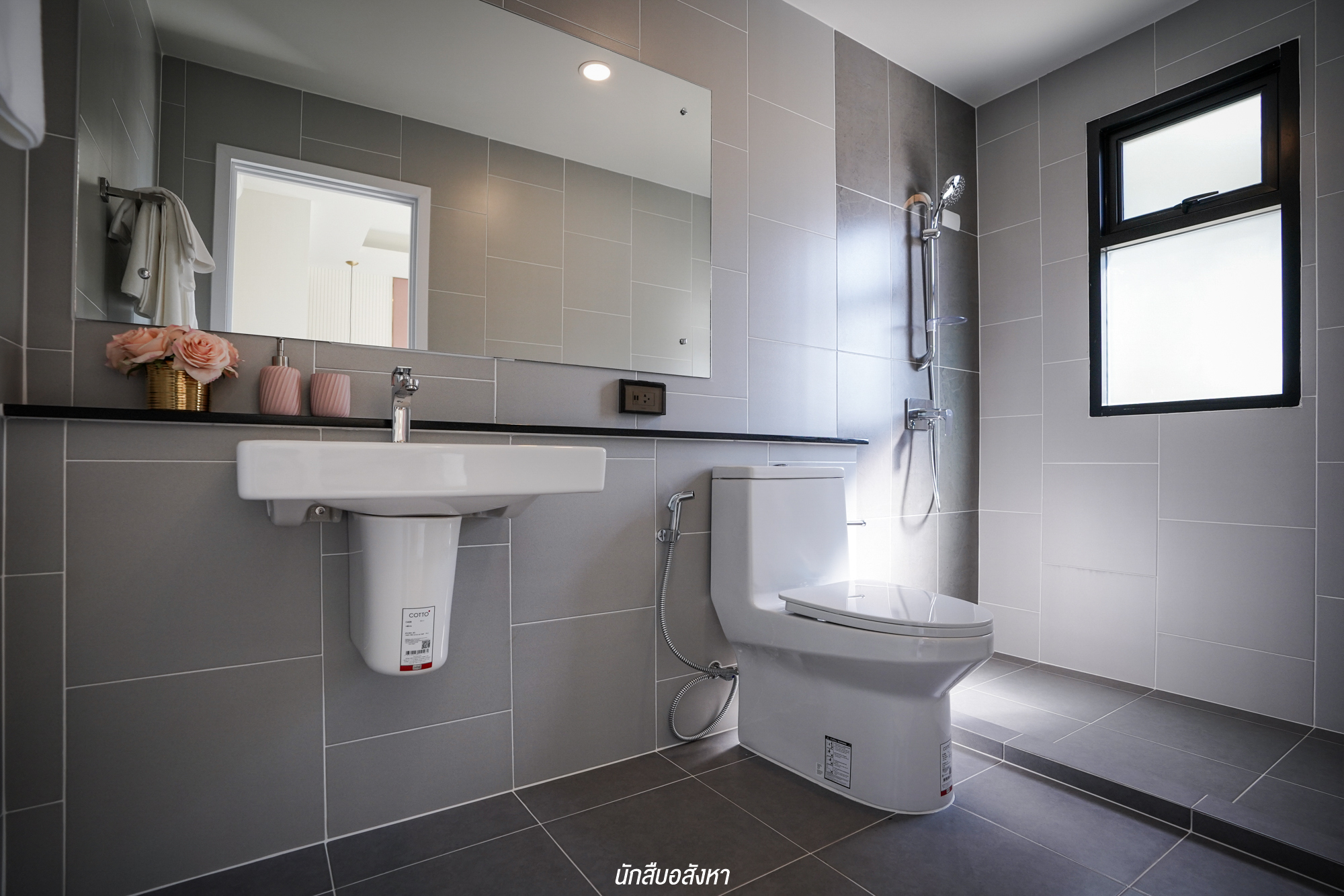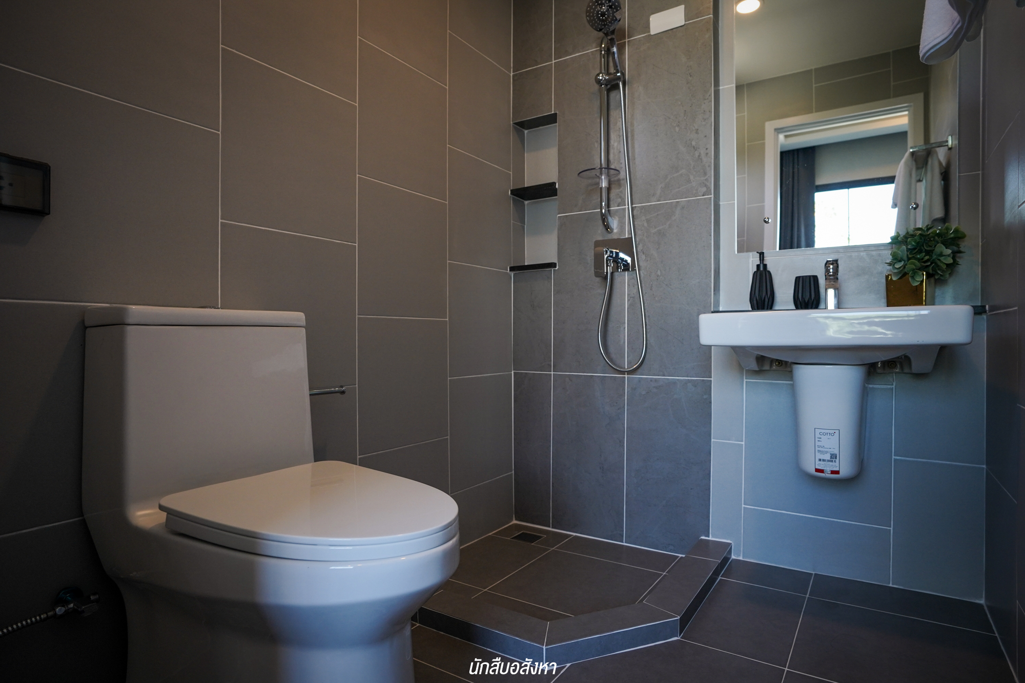 อย่างที่บอกไปครับว่า ห้องนอนชั้นบนจะมาพร้อมกับห้องน้ำในตัว เพิ่มความเป็นส่วนตัวและความสะดวกในกาารใช้งาน โดยภายในมีการแบ่งโซนเปียก โซนแห่ อย่างเป็นสัดส่วน พร้อมขนาดห้องที่พอเหมาะสำหรับการใช้งานครับ