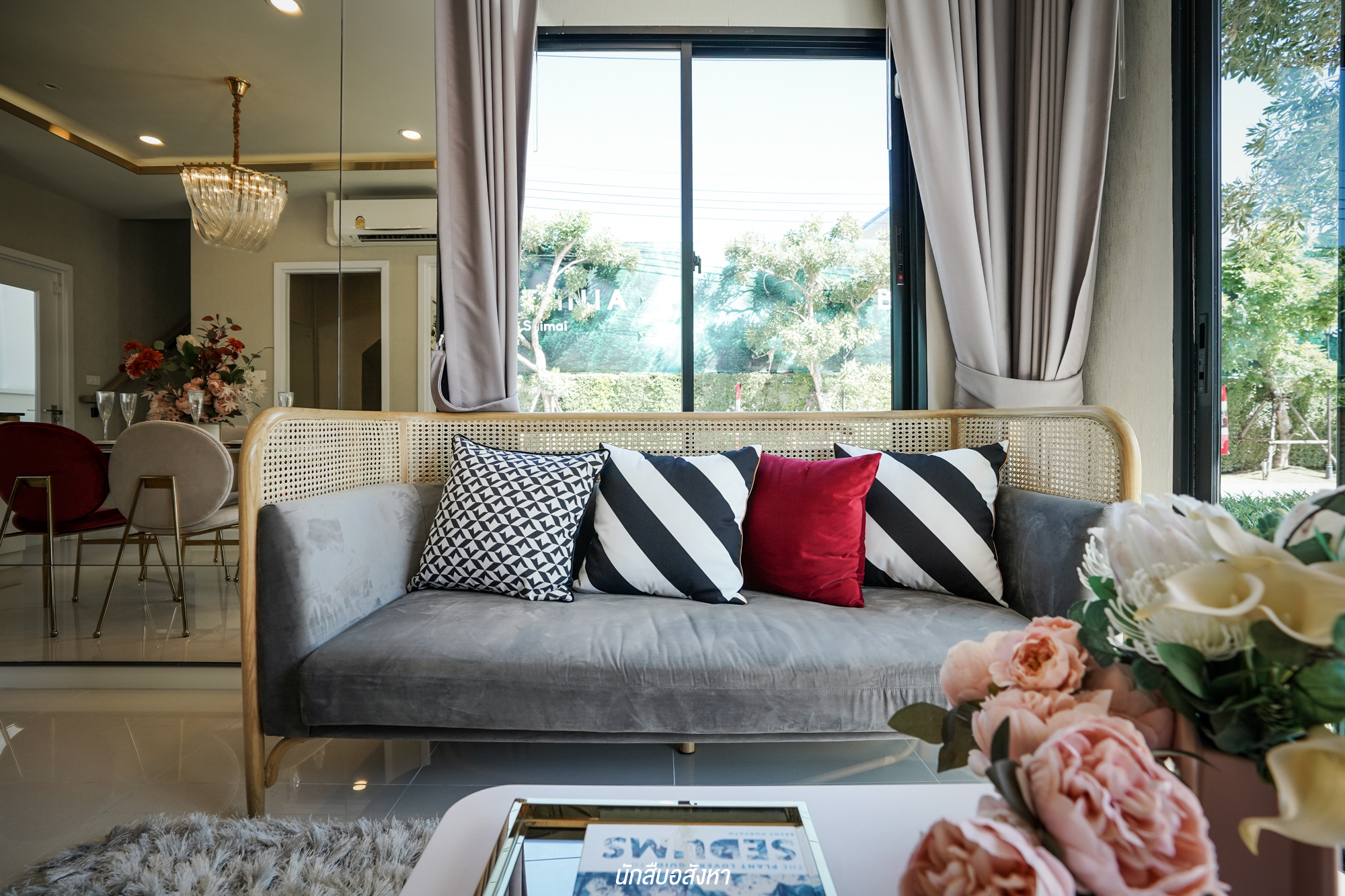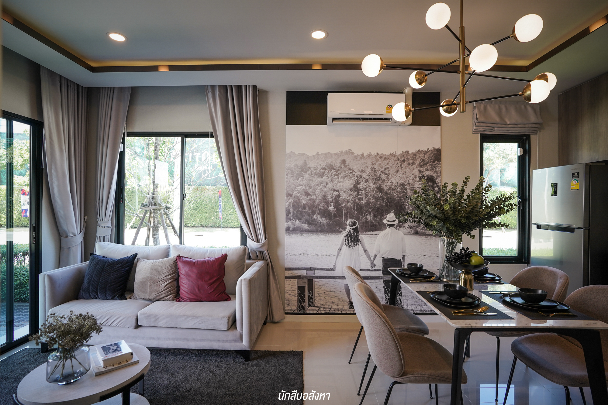 เข้ามาภายในบ้านเราจะเจอกับ Common Area พร้อมฝ้าเพดานสูง 2.6 เมตร โดยจัดสรรพื้นที่เป็น Living Area และ Dining Area เชื่อมต่อกัน ซึ่ง Living Area พื้นที่สำหรับการพักผ่อน พร้อมกระจกบานใหญ่ ช่วยให้บ้านโปร่ง และชมวิวสวนข้างบ้านและหน้าด้านได้อย่างเต็มที่ครับ