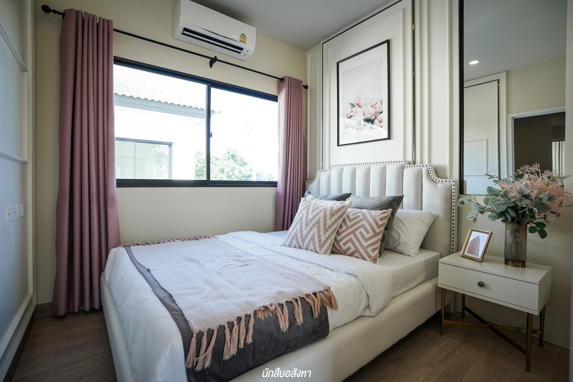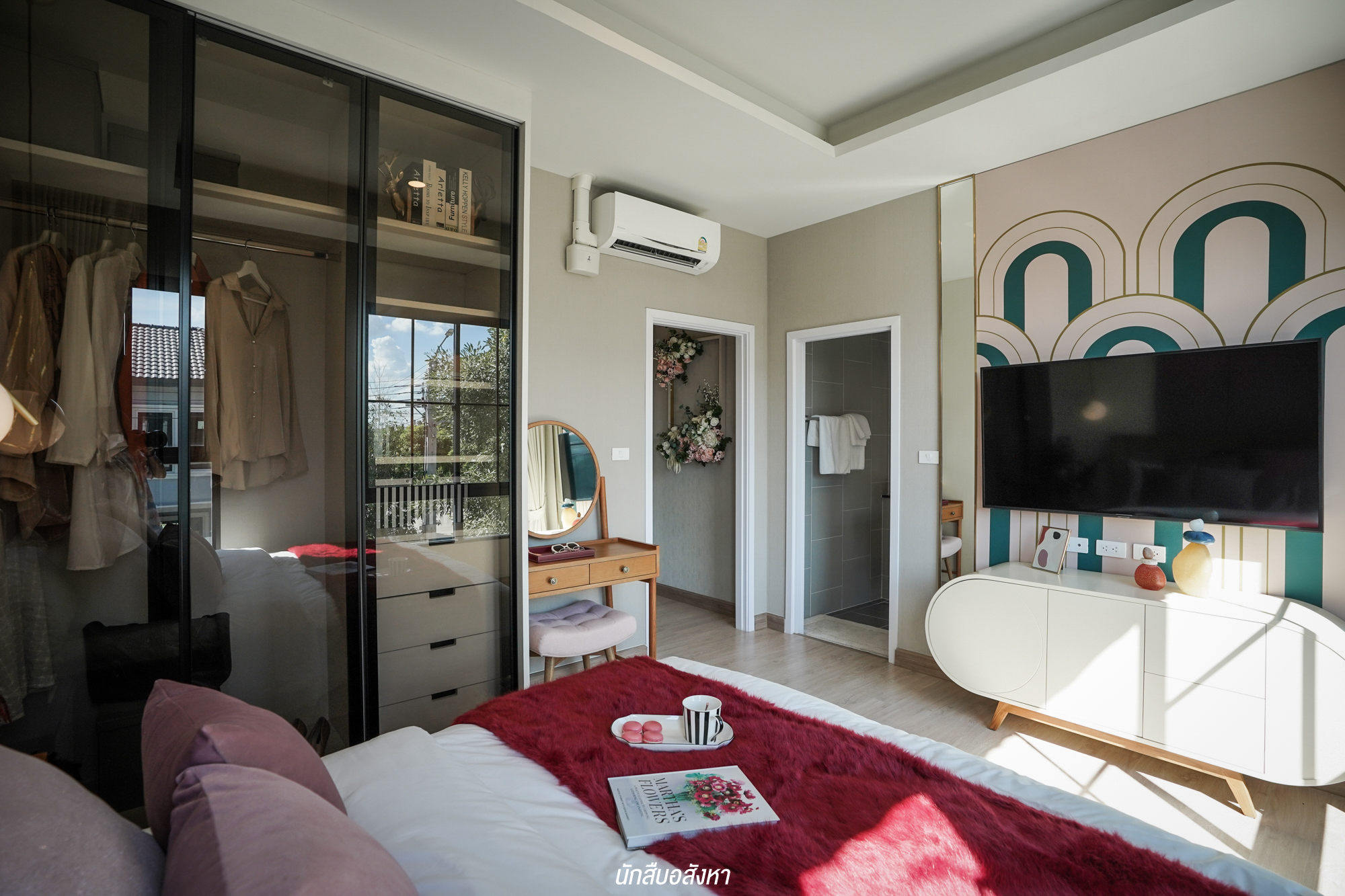 เมื่อขึ้นมาบริเวณชั้นสองจะประกอบด้วยห้องนอน 2 ห้อง พร้อมห้องน้ำส่วนตัวทุกห้องครับ โดย Master Bedroom ทางฝั่งหน้าบ้าน ภายในกว้าง สามารถวางเตียง 5 ฟุต ได้สบาย ๆ และยังคงเหลือพื้นที่สำหรับวางโต๊ะเครื่องแป้งและตู้เสื้อผ้าบิวท์อินขนาดใหญ่อีกด้วยครับ พร้อมฝ้าเพดานสูง 2.9 เมตร และช่องแสงขนาดใหญ่ 2 บาน ทำให้ห้องดูโปร่ง สบาย