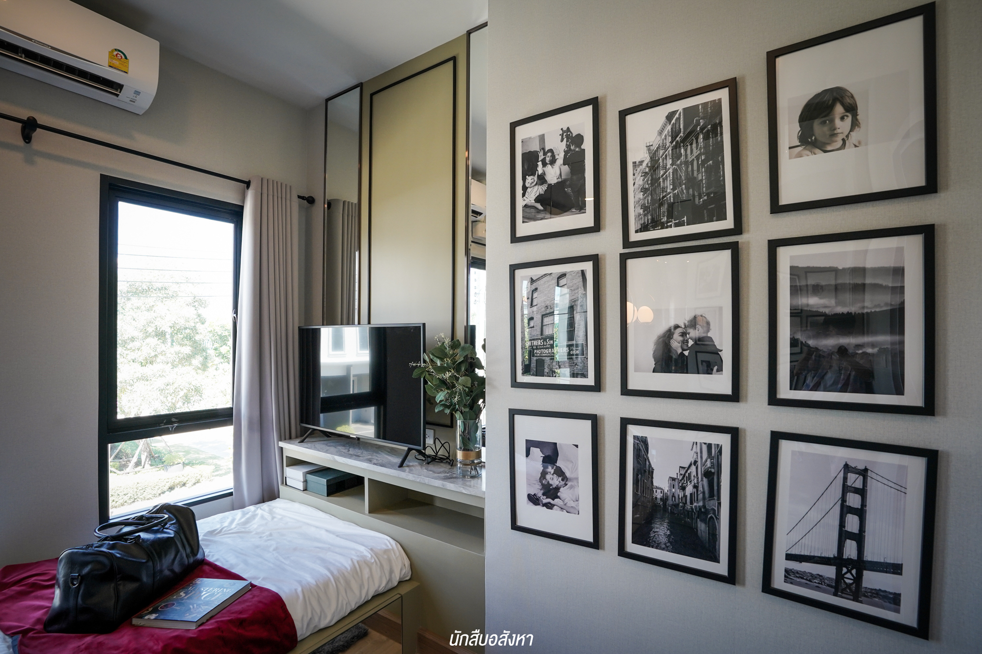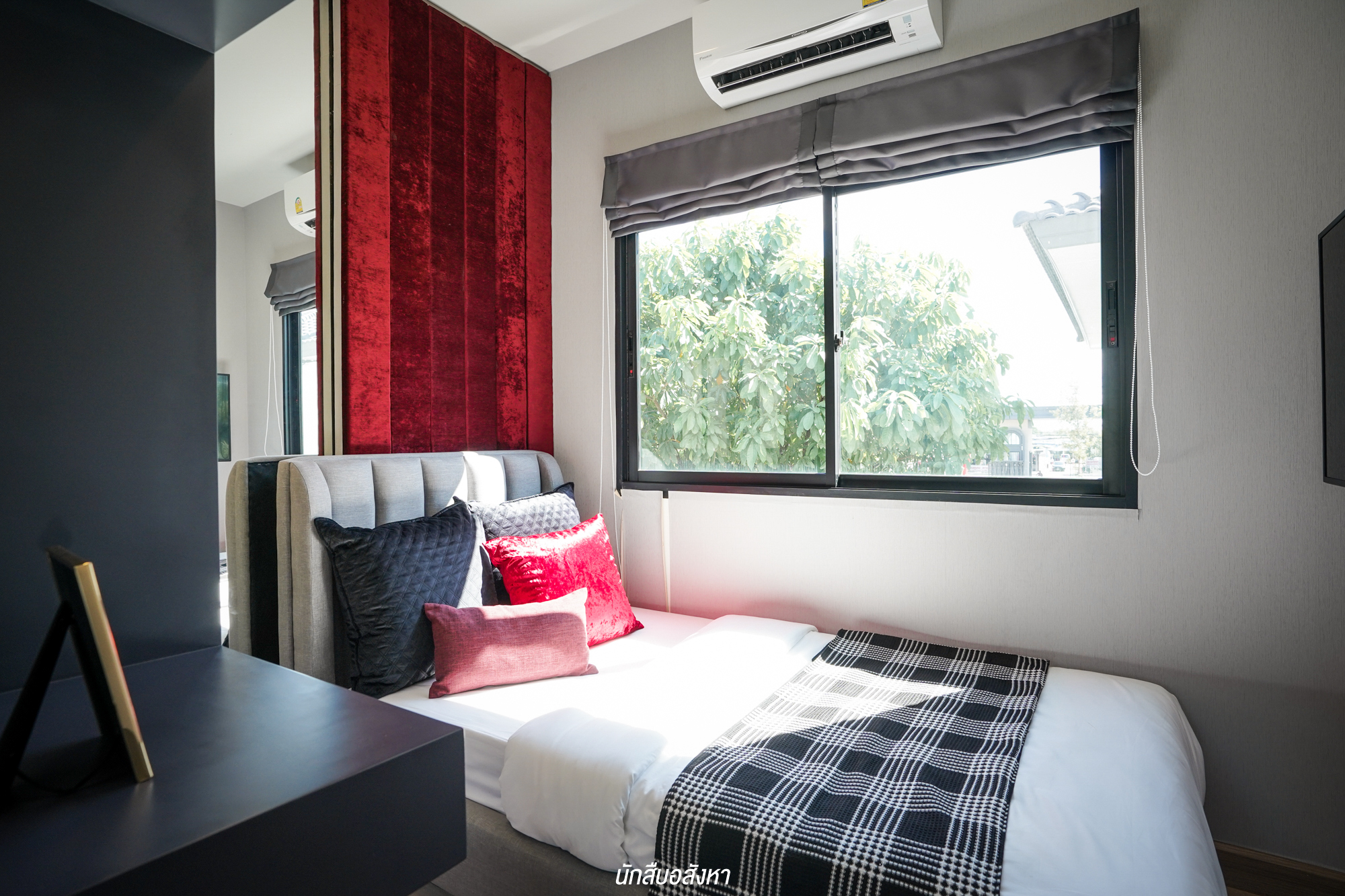 มาดูที่ห้องนอน 2 ฝั่งหน้าบ้านกันบ้างครับ ภายในห้องมีพื้นที่กว้างมากพอให้วางเตียงขนาด 3.5 ฟุต และเฟอร์นิเจอร์เพิ่มเติม เช่น ตู้เสื้อผ้า, ชั้นวางของ และโคมไฟ โดยพื้นที่ฝั่งปลายเตียงจะเว้าผนังเข้าไป พอดีกับการทำ Built-in ชั้นวางของ และชั้นวางทีวีครับ