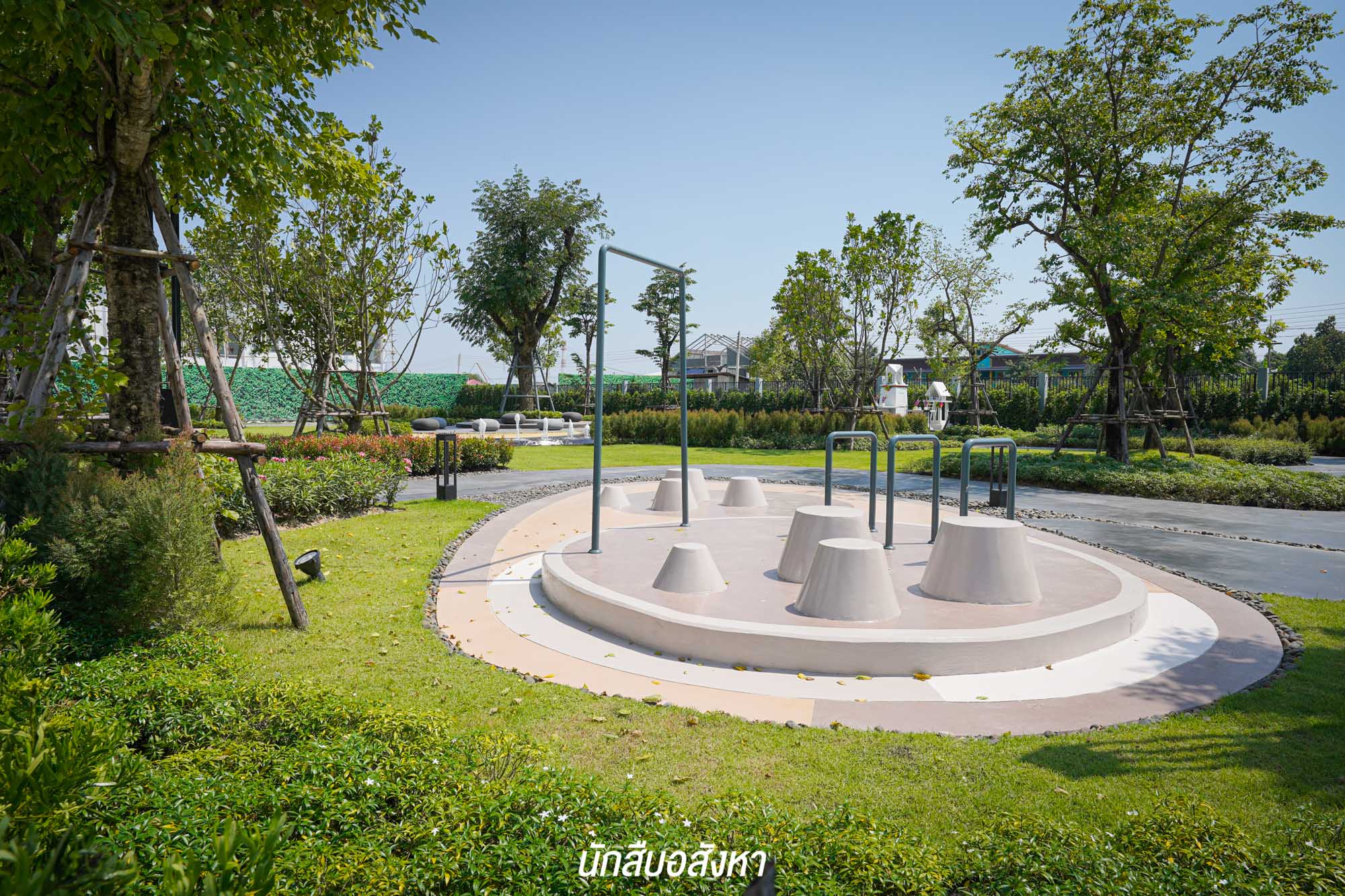 ถัดมาดูในส่วนของสวนส่วนกลางกันบ้าง Venue168 มีการจัด Landscape ที่ให้อารมณ์แตกต่างกันออกไป ไม่เหมือนกันสักโครงการครับ อย่างสวนที่นี่จะนำเอาเส้นสายของสายน้ำในลำคลองย่านคูคต-ลำลูกกา มาเป็นแรงบันดาลใจออกแบบให้ลู่วิ่งและทางเดินมีรูปแบบที่คดเคี้ยวไปตามแมกไม้ และมีที่นั่งพักผ่อนภายในสวน