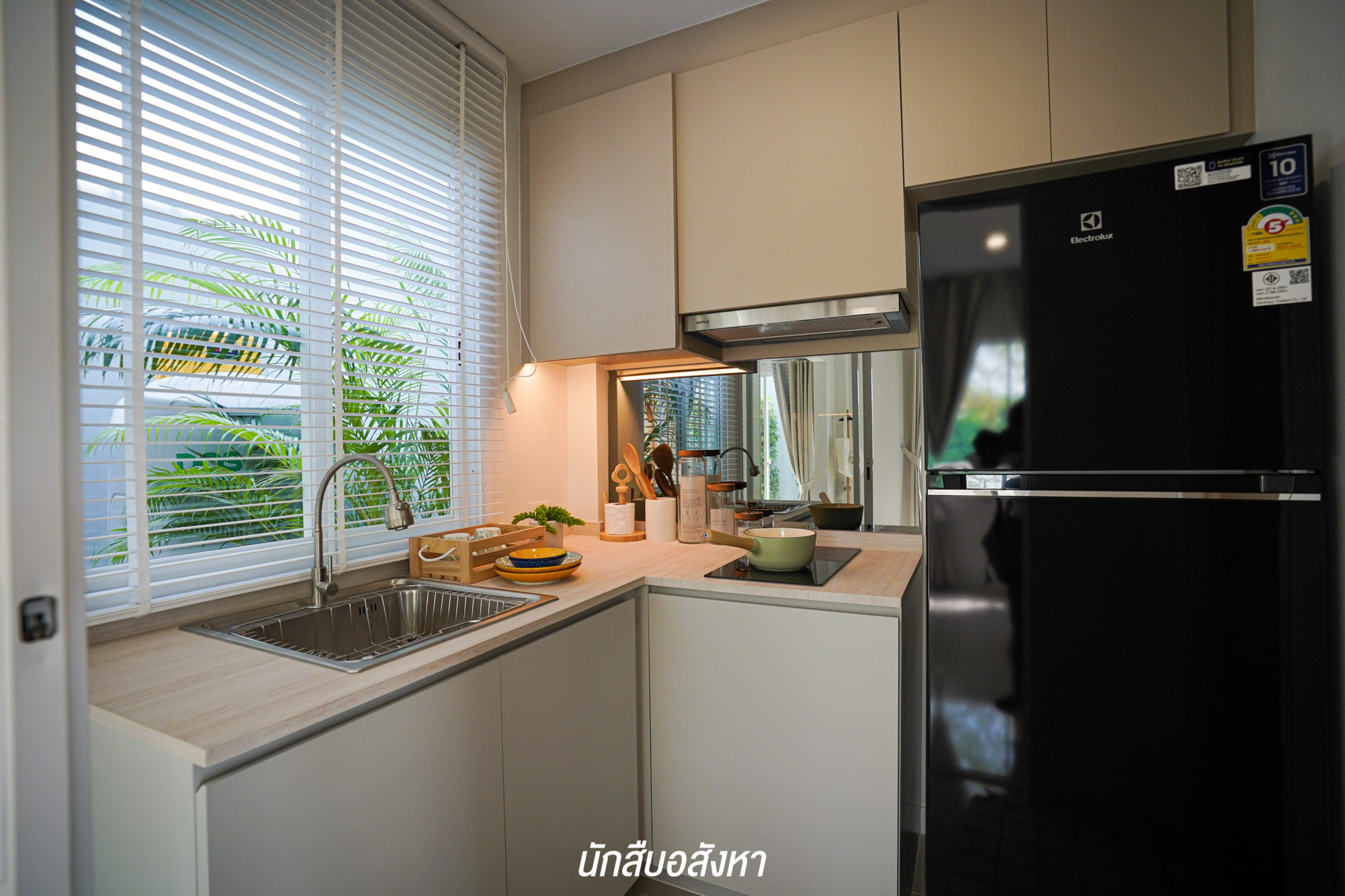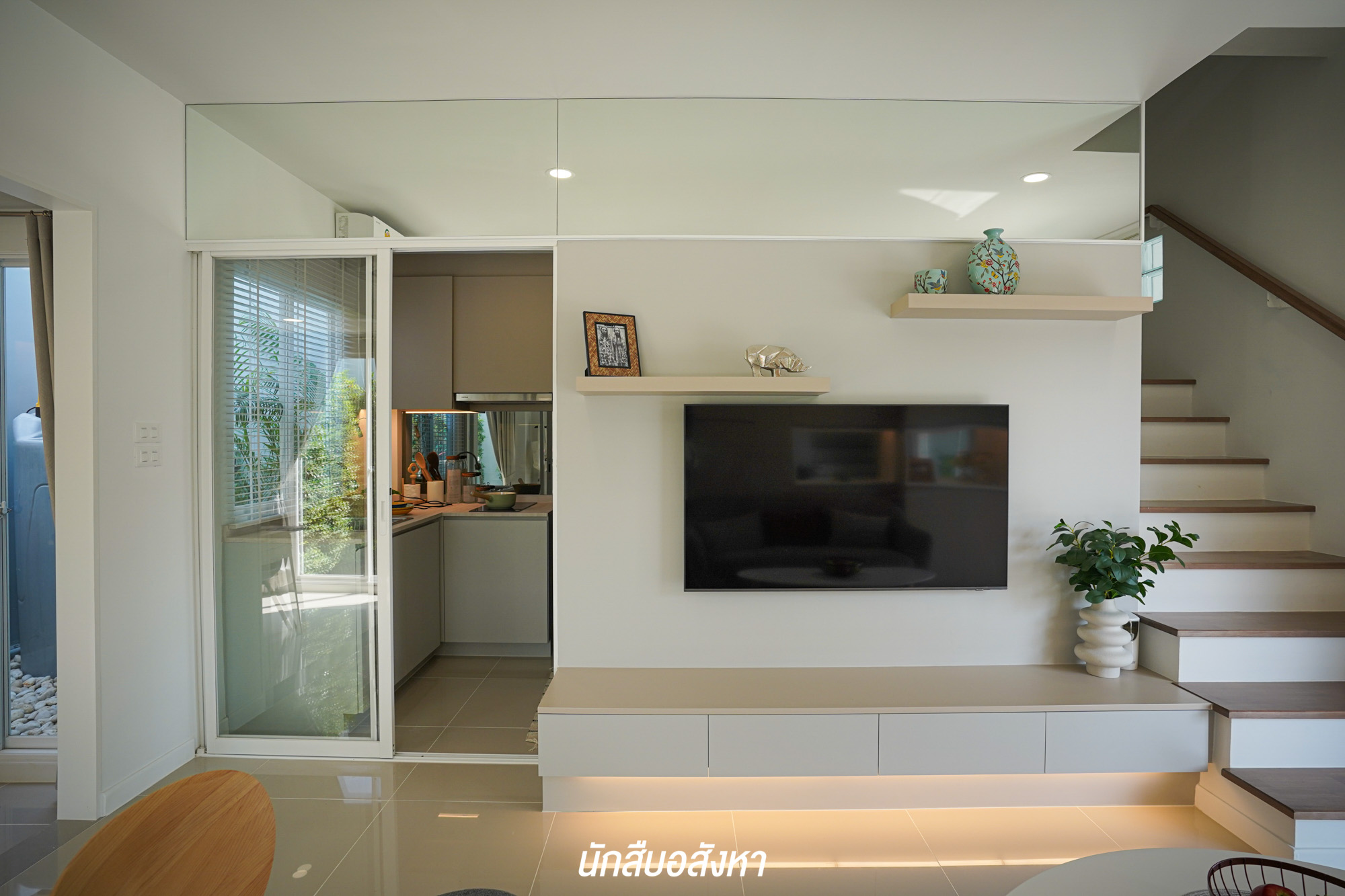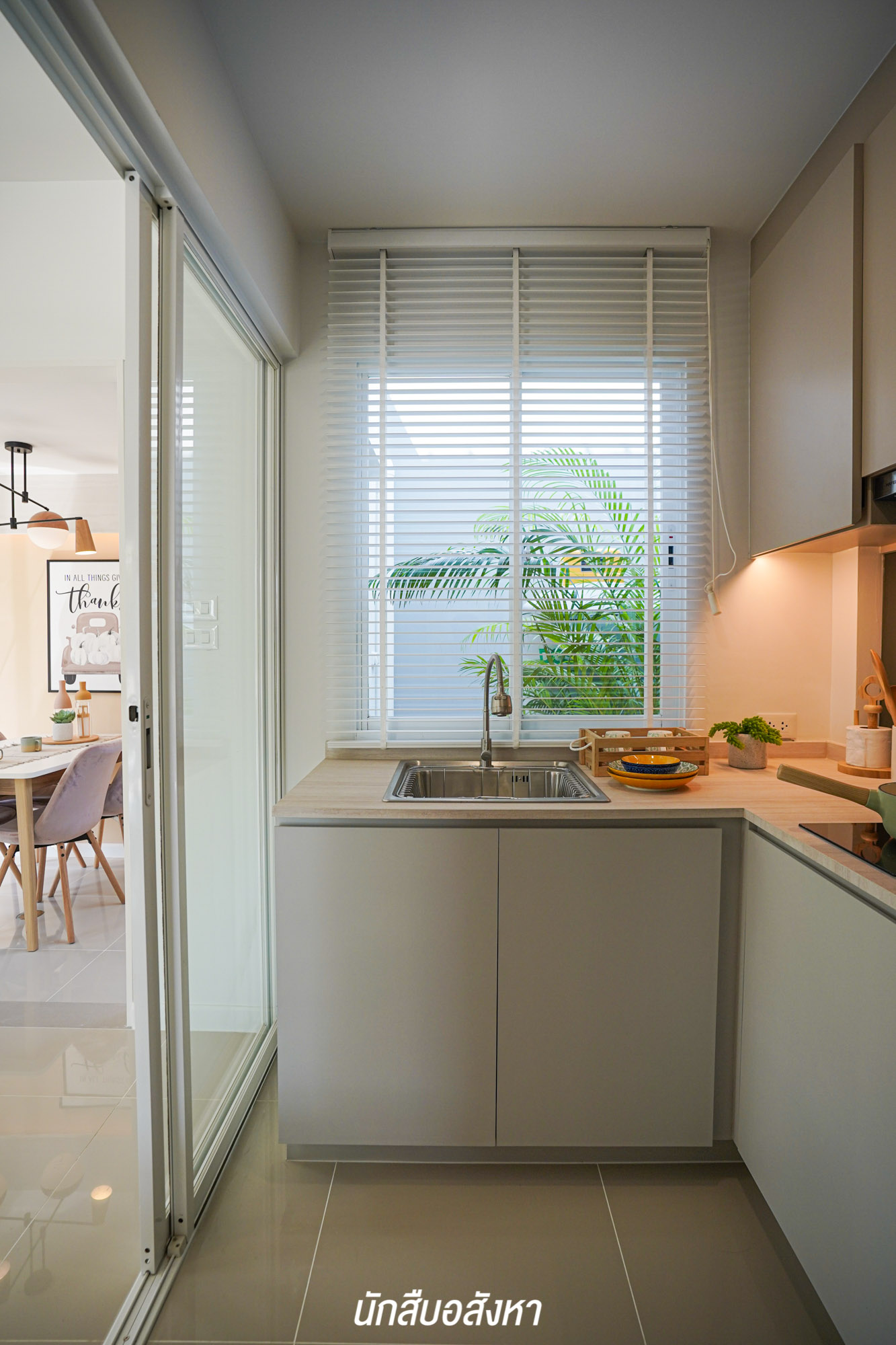 ถัดมาจะเห็นว่าโครงการวางแปลนเป็นรูปตัวแอล สามารถติดตั้งบานประตูเลื่อนกั้นโซนตามตัวอย่างนี้ได้เลย ทำให้ได้ฟังก์ชันครัวปิดครับ
