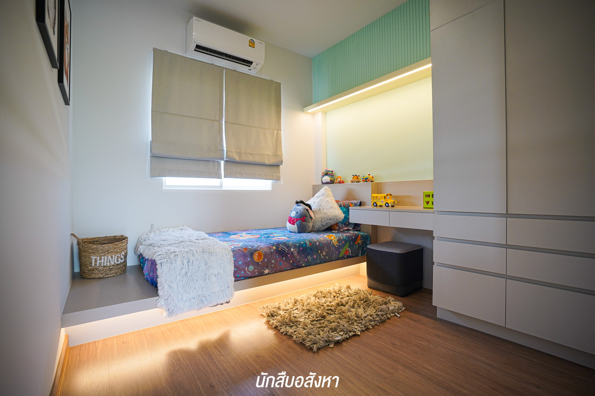 สำหรับห้องนอนที่ 2 ห้องนี้จะตกแต่งห้องให้เป็นห้องนอนของลูก สำหรับพื้นที่ใช้สอยผมมองว่าค่อนข้างพอเพียงสำหรับให้น้องอยู่ได้จนถึงตอนโต เพราะจากการจัดฟังก์ชันแล้วค่อนข้างครบและตอบโจทย์