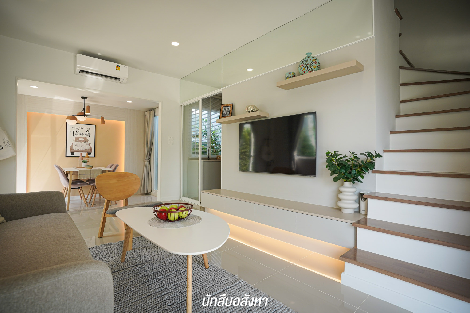 เข้ามาด้านใน โครงการตกแต่งโซนแรกเป็นที่นั่งดูทีวี นั่งเล่นพักผ่อนได้ ระยะดูทีวีก็พอควรครับ มีการเว้นระยะทางเดินให้เข้า-ออกสบายๆ ไม่รบกวนคนที่นั่งเล่นบนโซฟา
