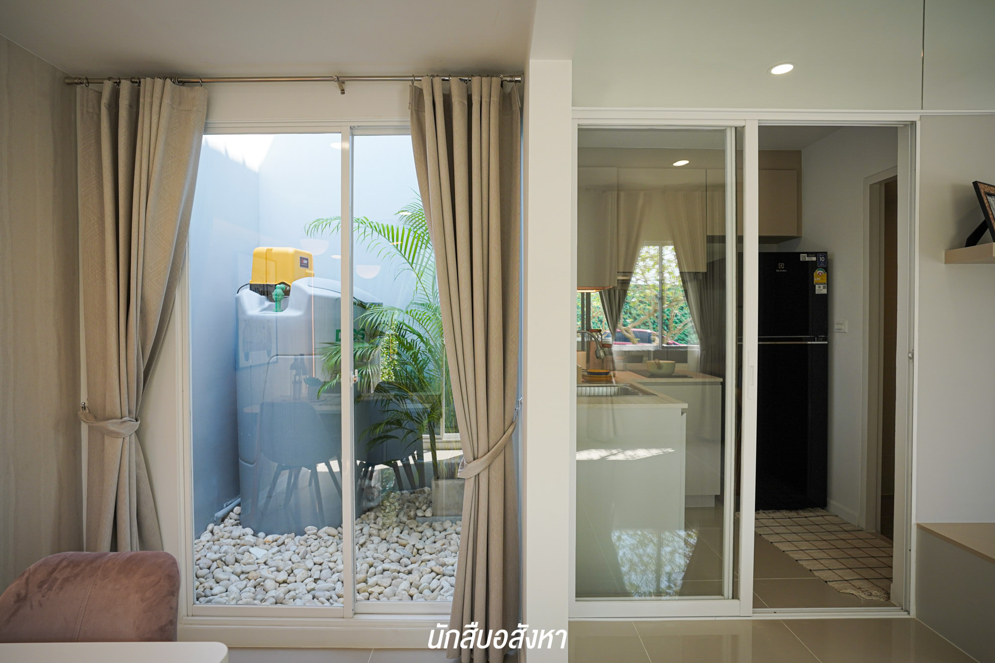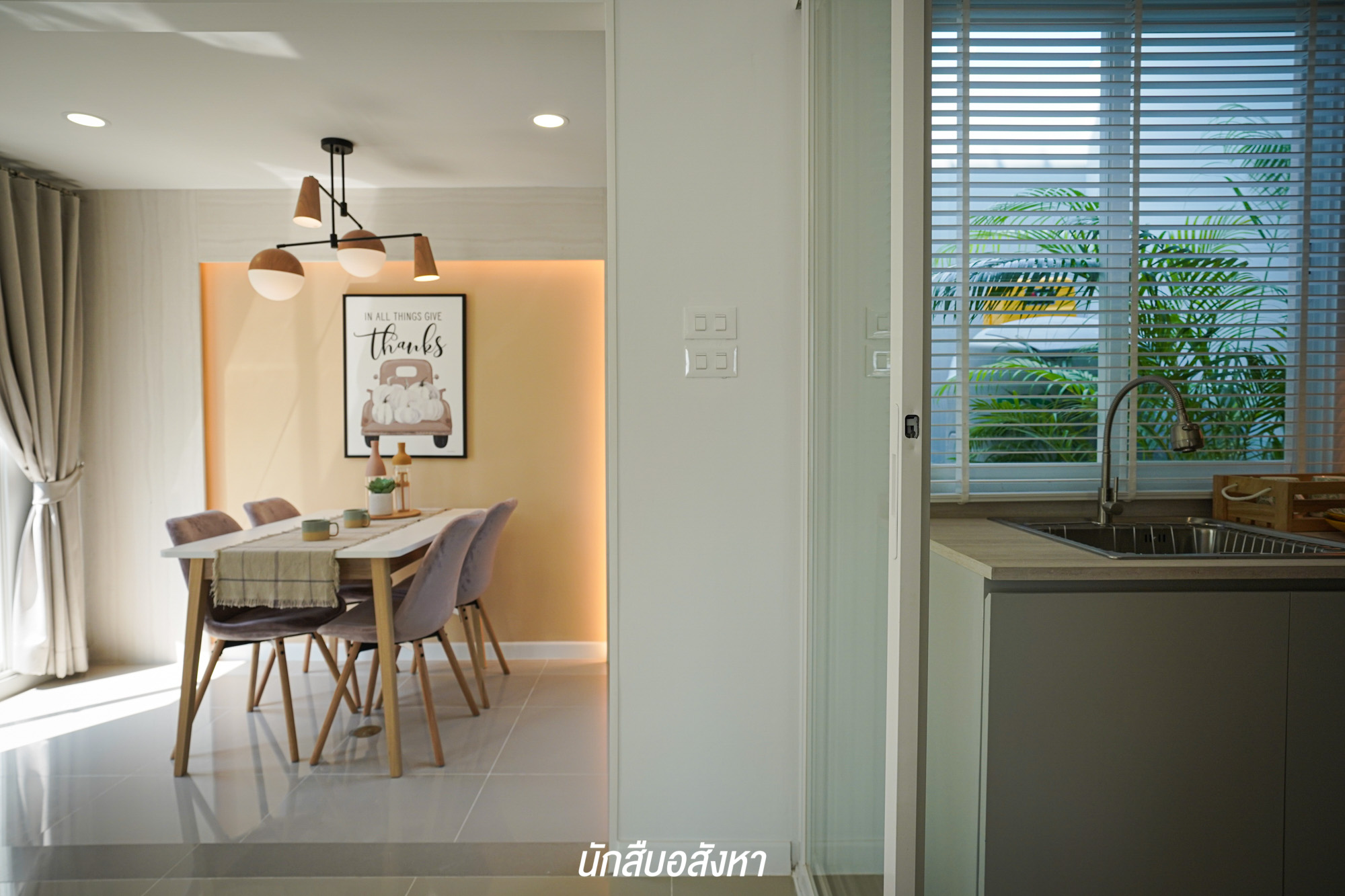 ถัดมาจะเห็นว่าโครงการวางแปลนเป็นรูปตัวแอล สามารถติดตั้งบานประตูเลื่อนกั้นโซนตามตัวอย่างนี้ได้เลย ทำให้ได้ฟังก์ชันครัวปิดครับ