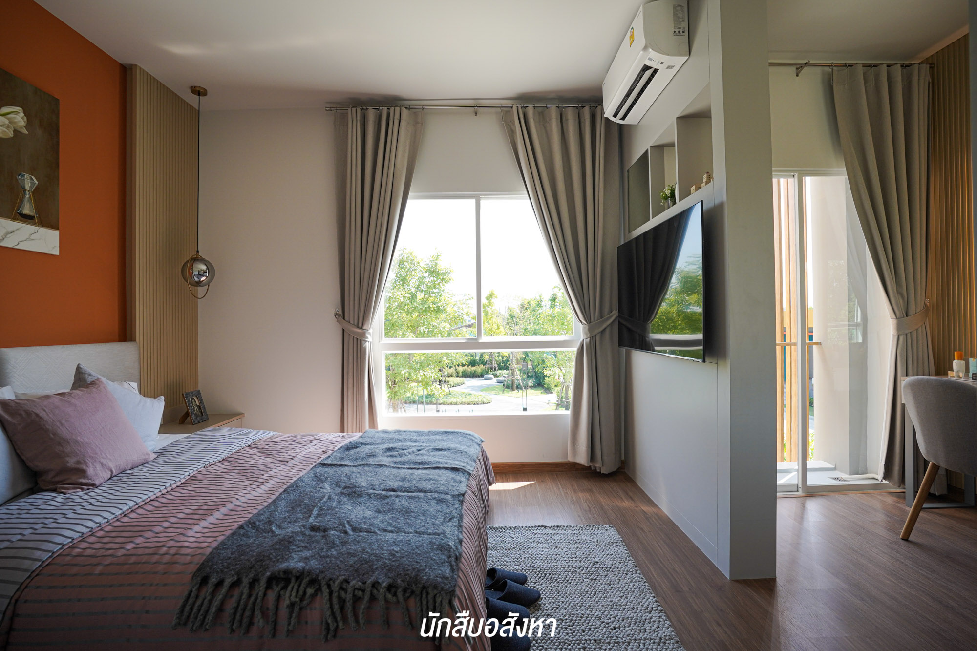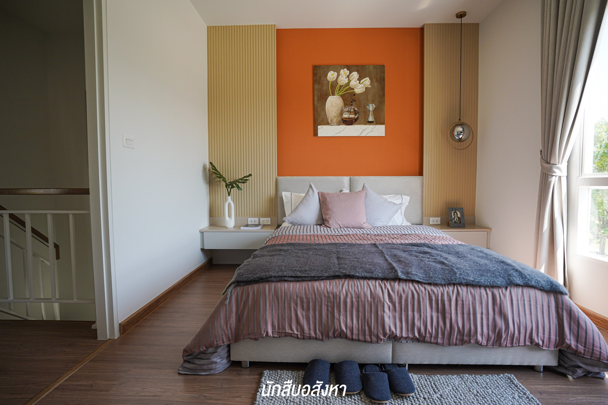 สำหรับห้องนอนหลักหรือ Master Bedroom ห้องนี้ถือเป็นไฮไลท์เลยก็ได้สำหรับชั้นบน เพราะการจัดฟังก์ชันค่อนข้างครบเหมาะที่จะอยู่เป็นคู่รัก ฝั่งหนึ่งวางเตียงนอน ขนาดใหญ่และยังมีที่ว่างข้างซ้ายและขวาไว้สำหรับวางโต๊ะข้างเตียงได้