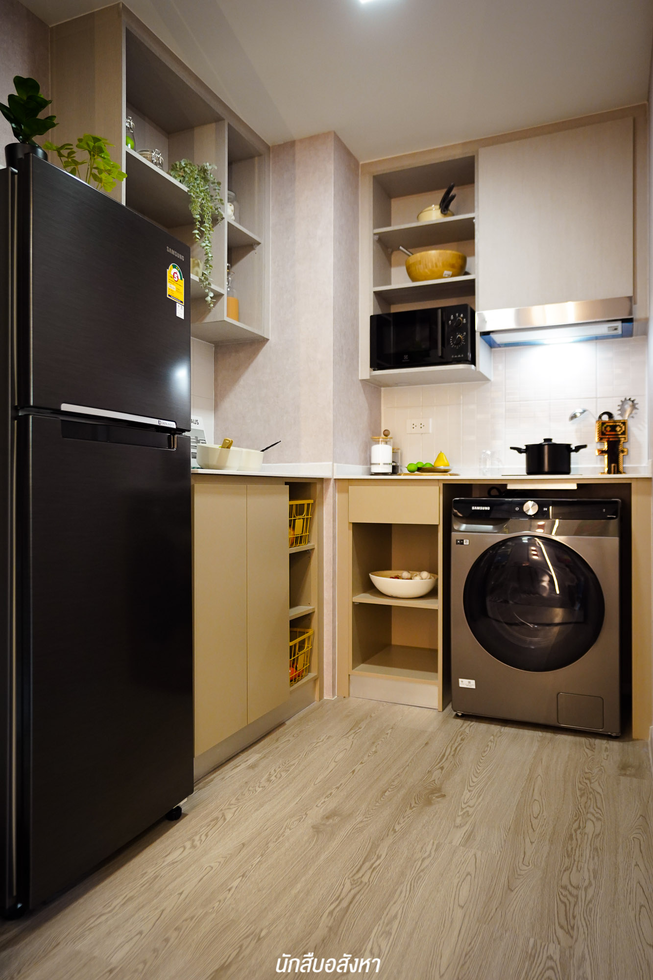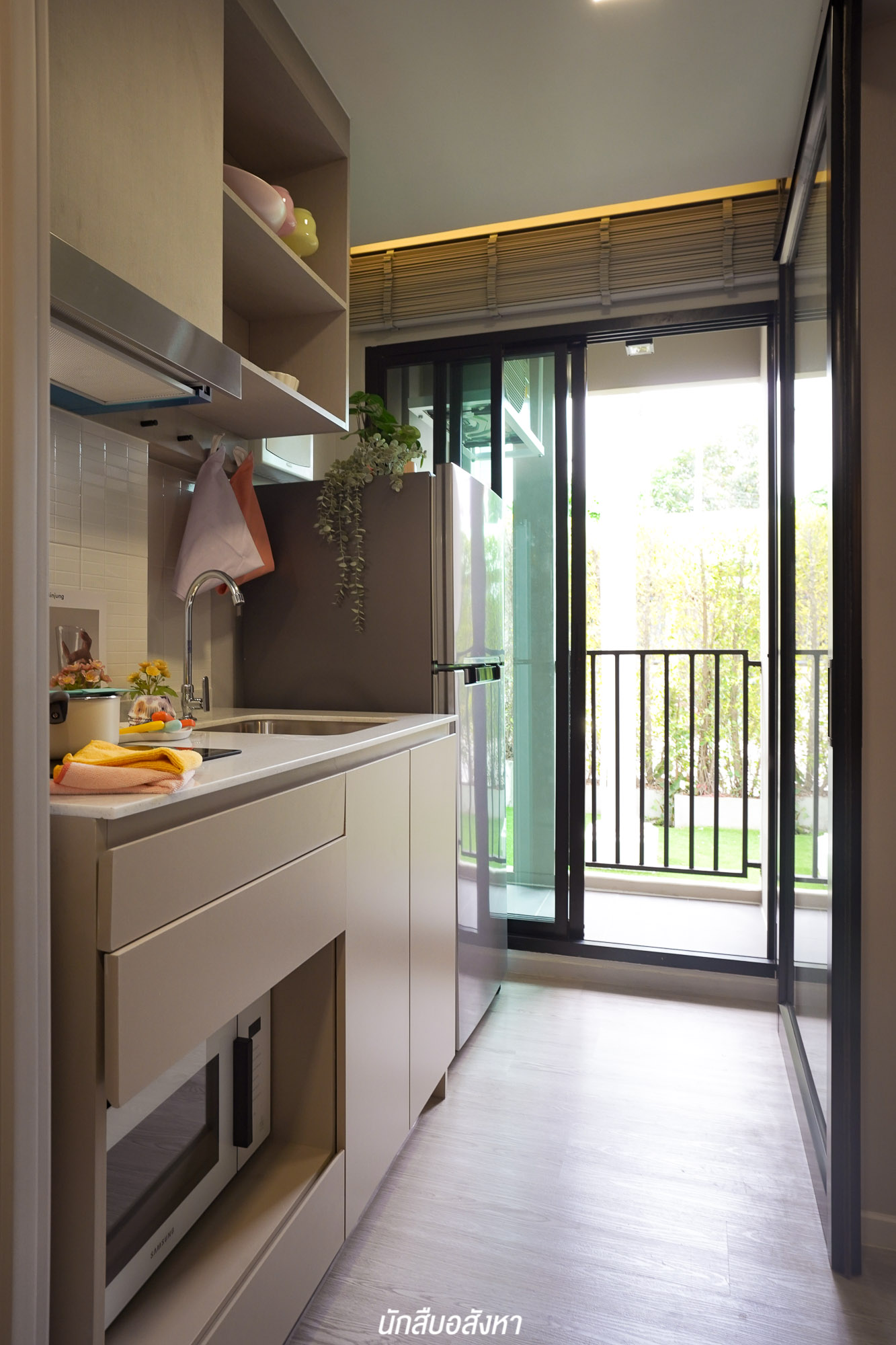 ถัดมาที่ห้องครัว ครัวจะมาพร้อมประตูกระจกบานเลื่อนที่มีไว้สำหรับกั้นโซน นอกจากนี้ก็ยังมีระเบียงซึ่งอยู่ติดกัน เวลาทำอาหารสามารถเปิดประตูระเบียงเพื่อระบายกลิ่นได้ สามารถใช้งานได้จริง ส่วนห้องน้ำออกแบบได้อย่างลงตัว กว้างกว่าที่คิด และโครงการได้เดินระบบท่อน้ำ ก็อกน้ำไว้สำหรับใครที่จะนำเครื่องซักผ้ามาไว้บริเวณระเบียงได้ เราลองไปดูห้องต่อไปกันครับ