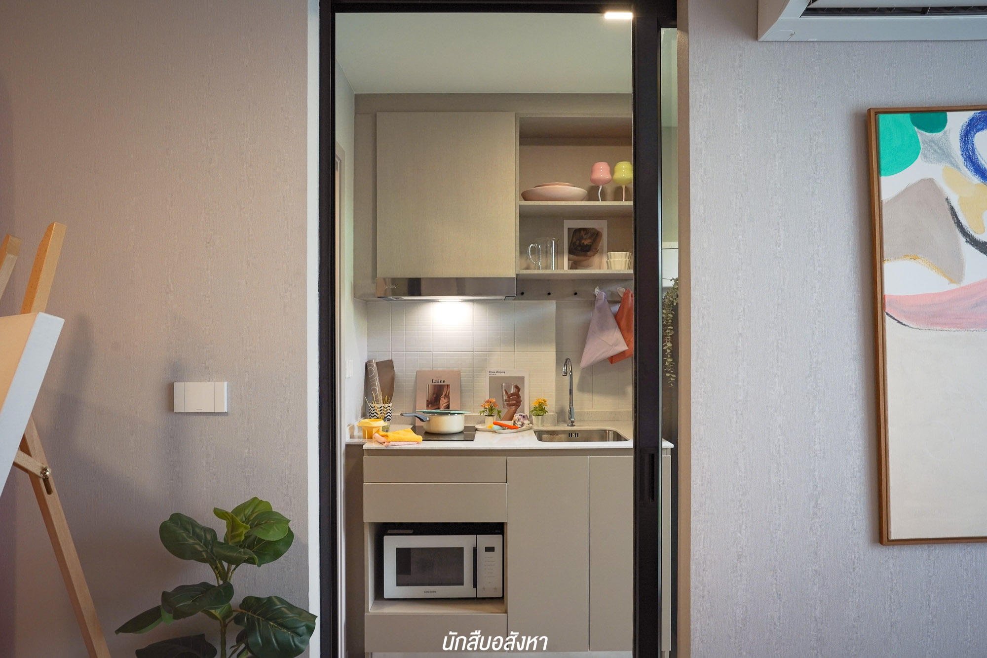 รูปแบบห้องแรกนี้ มีจุดเด่นของห้องนี้คือ เป็นห้องที่มีครัวปิดติดระเบียง ค่อนข้างเหมาะกับคนที่ชื่นชอบในการทำอาหาร ด้วยขนาดของพื้นที่ที่มีความลงตัว ห้องนี้จึงเหมาะที่ผู้ปกครองจะซื้อให้ลูก ๆ อยู่ในช่วงเรียน หรือจะซื้อไว้ปล่อยเช่าให้กับบุคลากรที่ทำงานในมอ ก็ได้ครับ เพราะมีครบทั้งมุมทำอาหาร มุมพักผ่อน