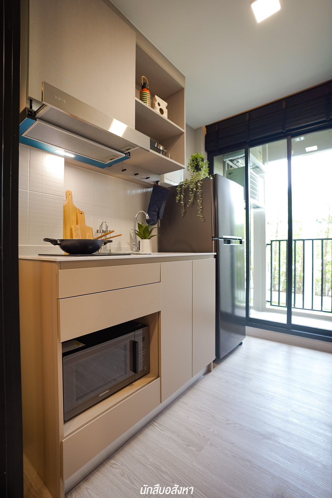 สำหรับครัวจะเป็นครัวปิดติดระเบียงเช่นกันครับ โครงการบิวท์อิน และมีเตาไฟฟ้า เครื่องดูดควัน และซิงค์ให้พร้อมใช้งานเรียบร้อยแล้ว