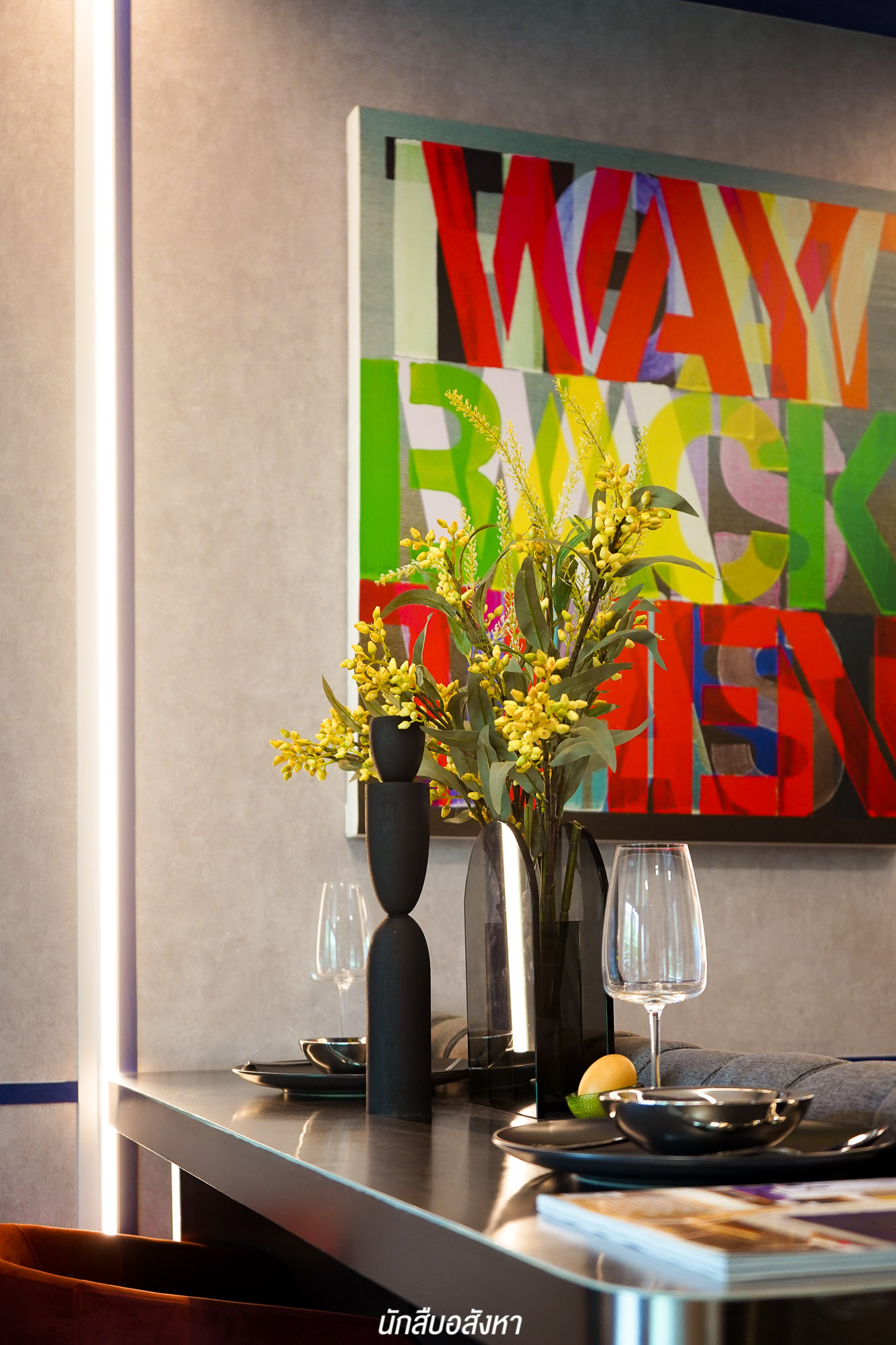 ส่วนมุมพักผ่อน มีขนาดค่อนข้างกว้าง และระยะดูทีวีกว้างพอสมควร สามารถวางทีวีขนาด 40-50 นิ้ว ได้สบาย ซึ่งติดกันเลยจะเป็นโซนรับประทานอาหาร โครงการออกแบบเป็นมินิบาร์บิวท์อินให้ชม สามารถปรับเปลี่ยนได้ตามไลฟ์สไตล์