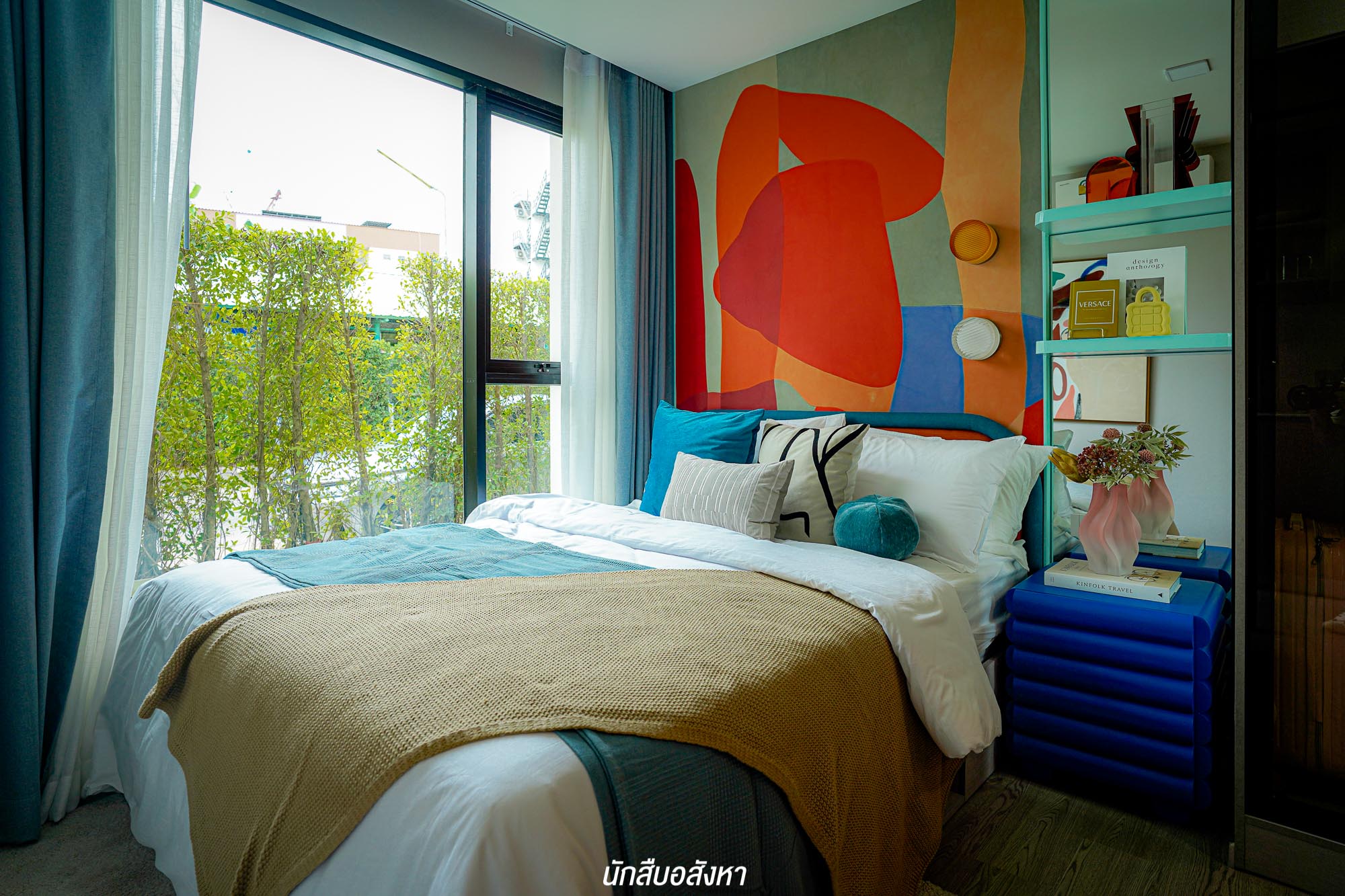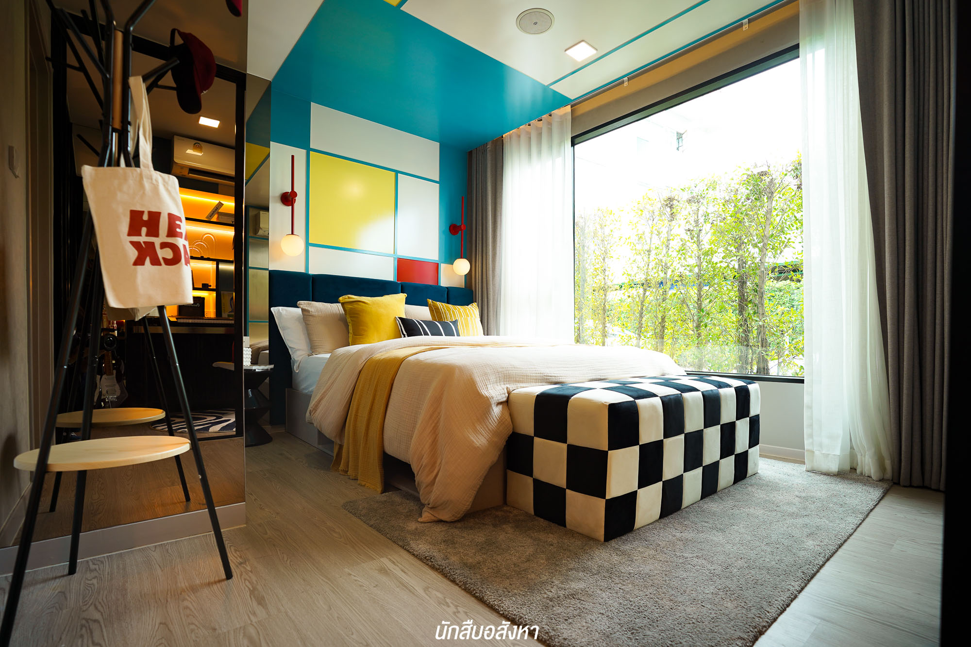 ความน่าสนใจอีกหนึ่งอย่างของห้องนี้คือ โครงการให้หน้าต่างบานใหญ่ติดกันกับบริเวณเตียงนอน ทำให้สามารถมองเห็นวิวได้แบบพาโนรามา เพิ่มความโปร่งรับแสงธรรมชาติ