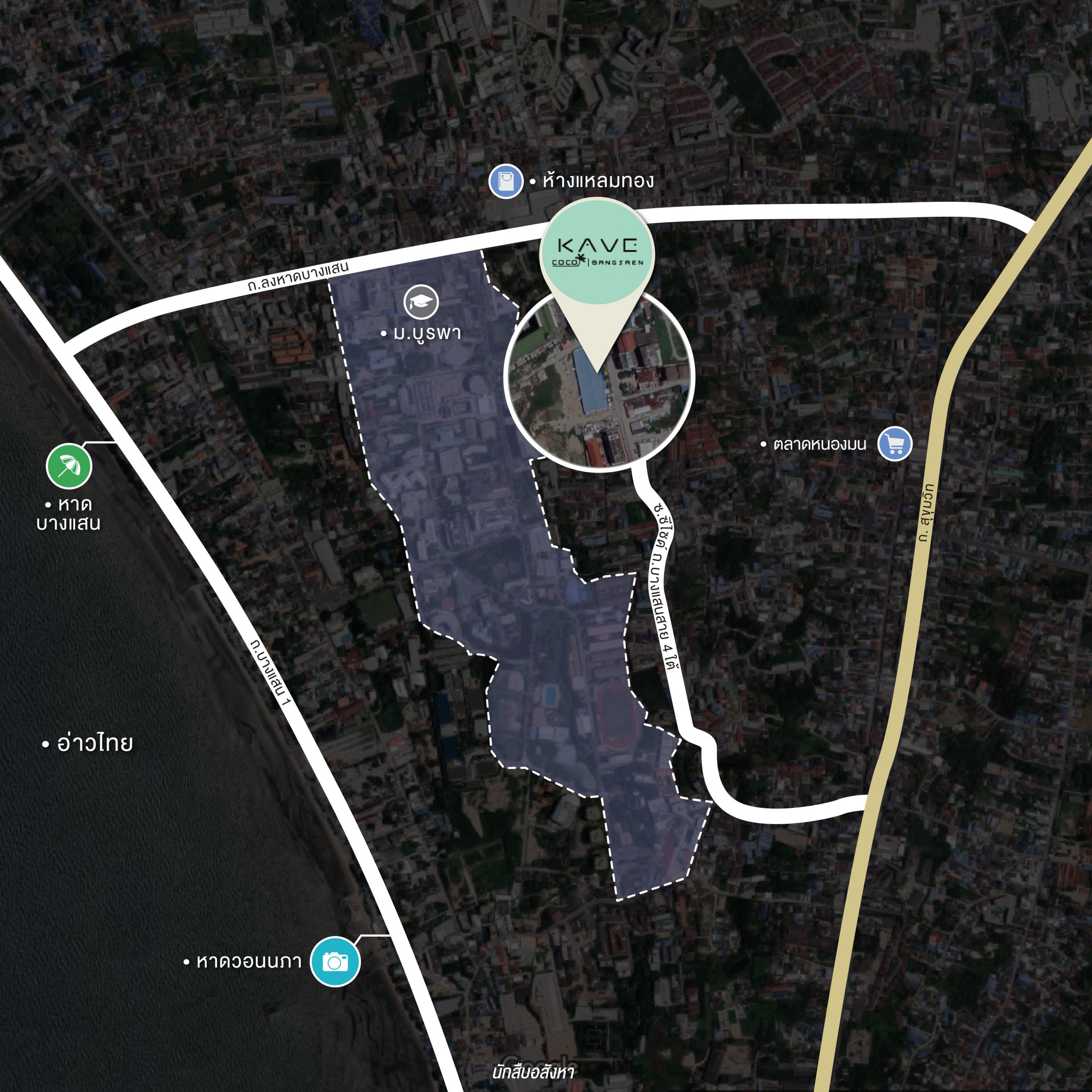 โครงการ Kave COCO Bangsaen (เคฟ โคโค่ บางแสน) คอนโดฯ Low-Rise สูง 8 ชั้น 4 อาคาร บนพื้นที่กว่า 8 ไร่ ตั้งอยู่บน ถ.บางแสนสาย 4 ใต้ ต.แสนสุข อ.เมืองชลบุรี จ.ชลบุรี ติด ม.บูรพา จำนวนห้องจะอยู่ที่ 974 ยูนิต ที่จอดรถประมาณ 35.9% ซึ่งยังไม่รวมที่จอด Motocycle และ EV พร้อมกับสิ่งอำนวยความสะดวกกว่า 50 รายการ ต่อมาเรามาดูเรื่องทำเลกันครับ