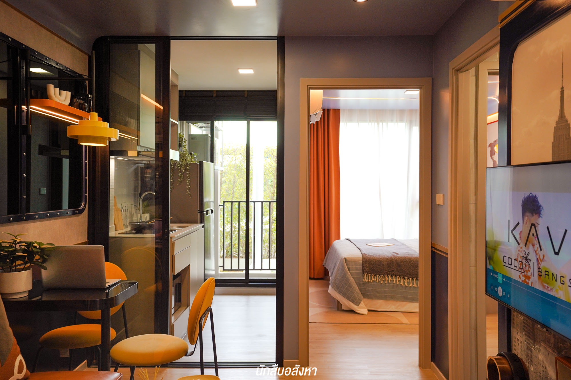 รูปแบบห้องแรกนี้ มีจุดเด่นของห้องนี้คือ เป็นห้องที่มีครัวปิดติดระเบียง ค่อนข้างเหมาะกับคนที่ชื่นชอบในการทำอาหาร ด้วยขนาดของพื้นที่ที่มีความลงตัว ห้องนี้จึงเหมาะที่ผู้ปกครองจะซื้อให้ลูก ๆ อยู่ในช่วงเรียน หรือจะซื้อไว้ปล่อยเช่าให้กับบุคลากรที่ทำงานในมอ ก็ได้ครับ เพราะมีครบทั้งมุมทำอาหาร มุมพักผ่อน
