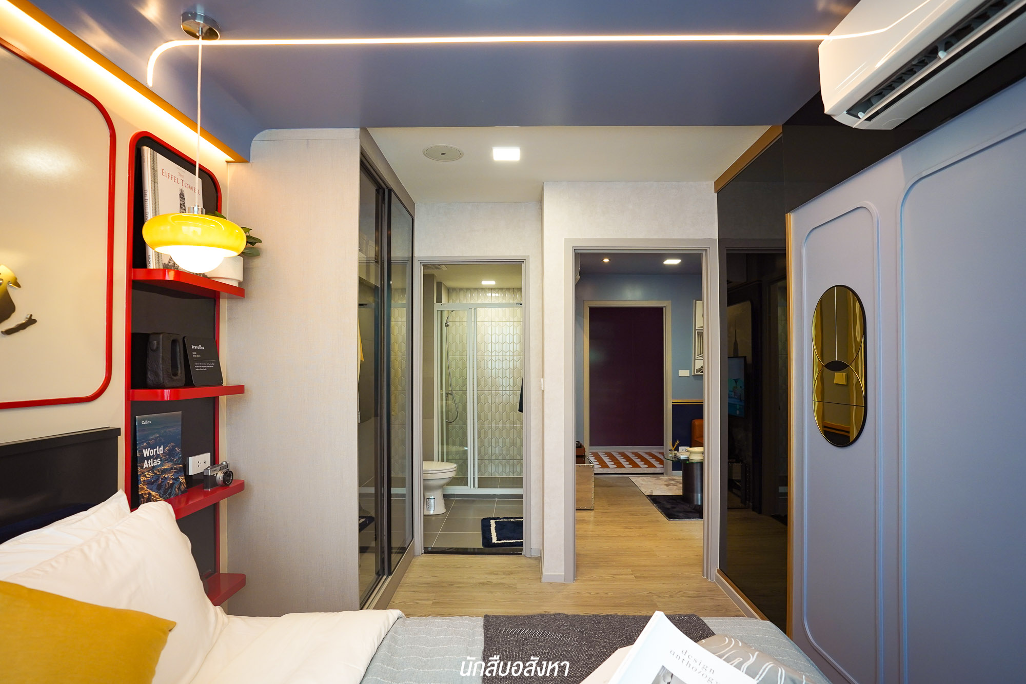 ถัดเข้าไปจะเป็นพื้นที่ของห้องนอน โดยห้องนอนจะถูกจัดวางไว้ครบทุกฟังก์ชัน มาพร้อมพื้นที่ Walk in Closet ที่บิวท์อินตู้เสื้อผ้าไว้ให้แล้วขนาดกำลังดี ส่วนห้องน้ำจะมีประตู 2 ด้าน จะเข้าทางโซนนั่งเล่นก็ได้ หรือจะเข้าจากห้องนอนก็ได้เช่นกัน จึงสะดวกสบายต่อการใช้งานมาก ๆ