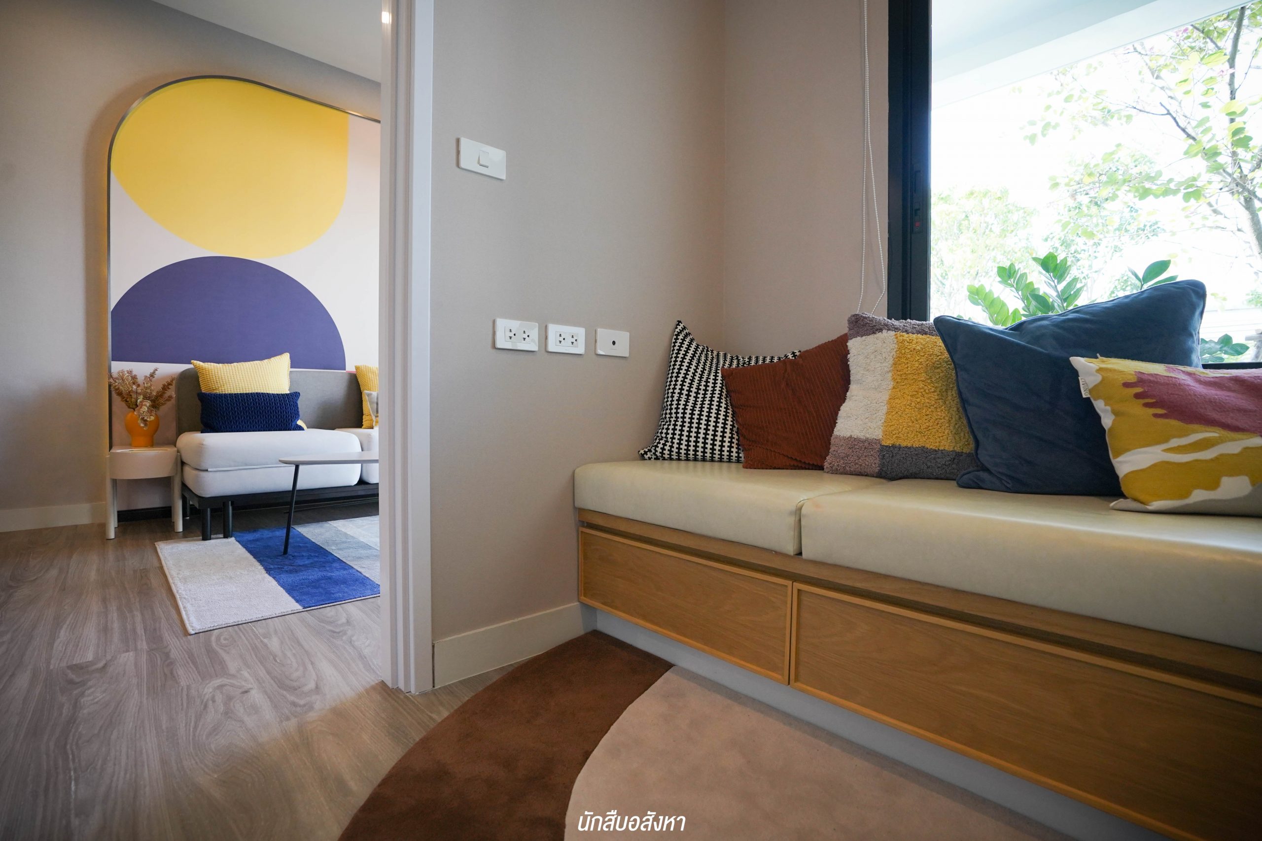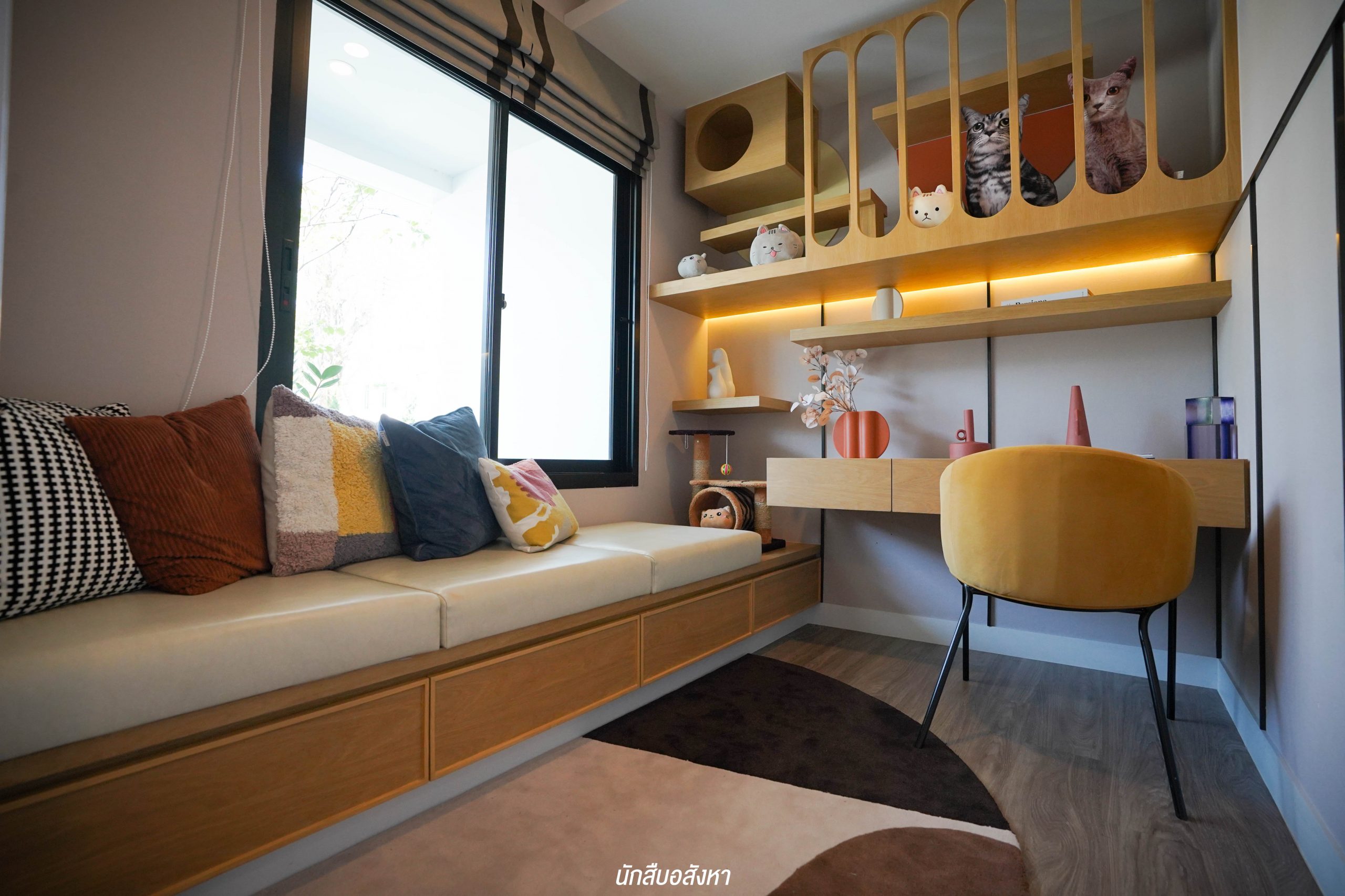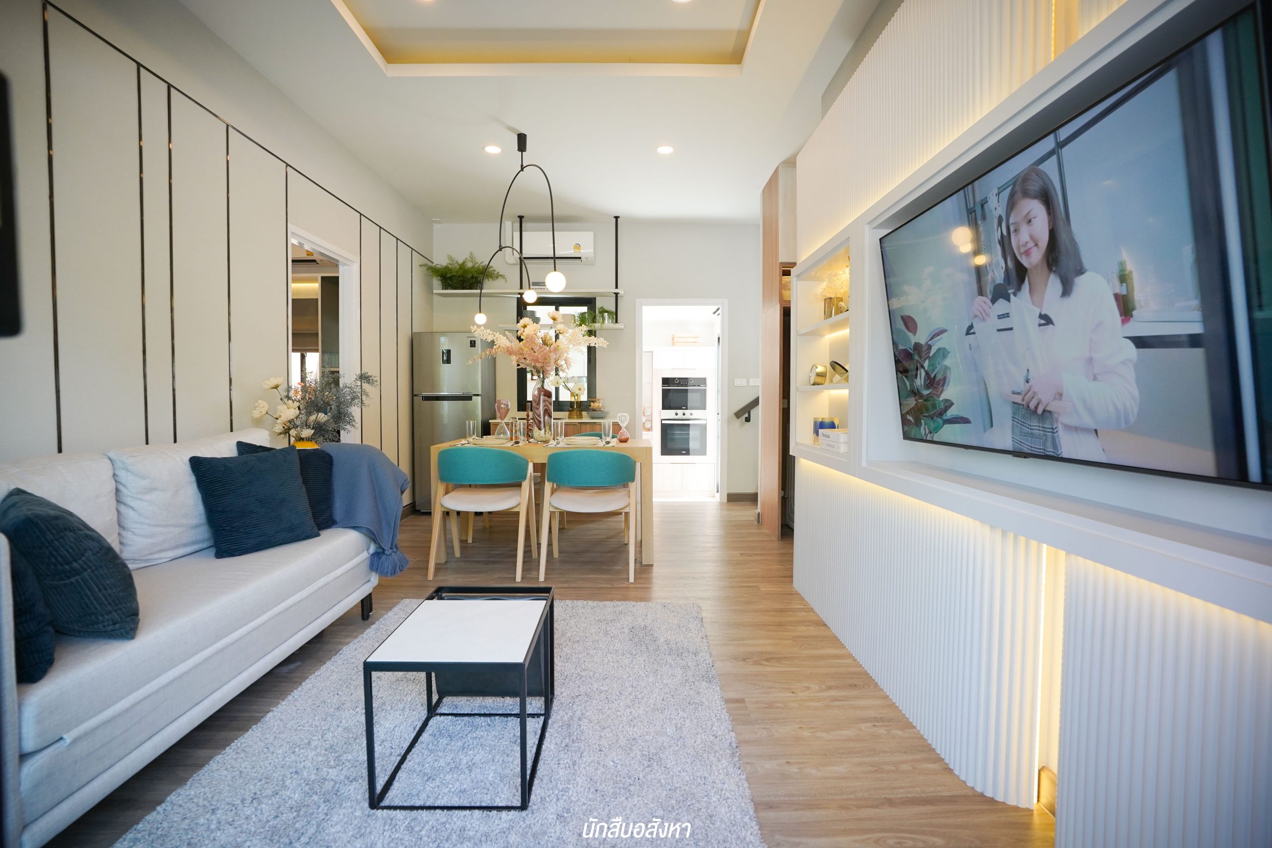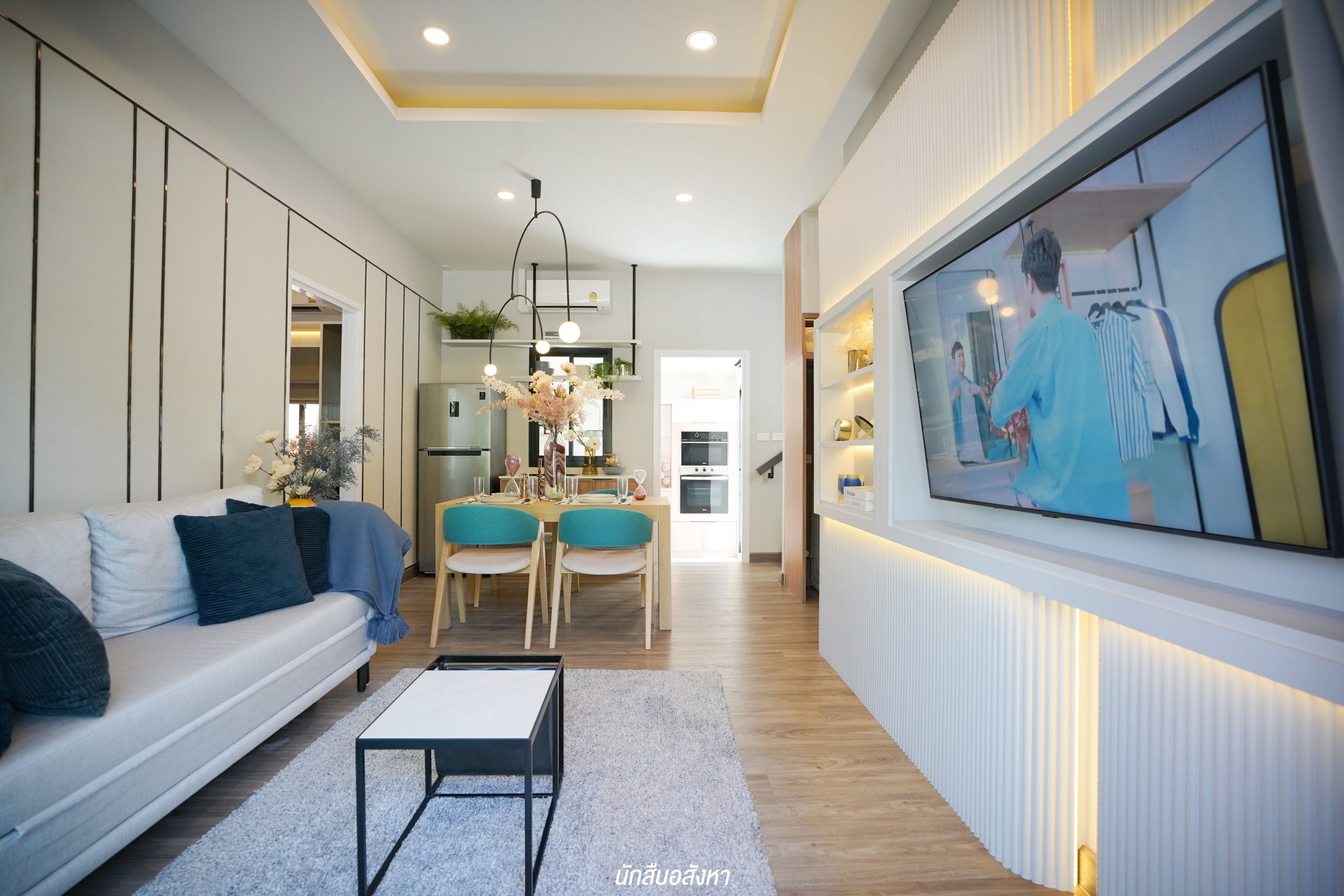 มุมนี้สามารถติดตั้งทีวีบิวท์อินและจัดวางโซฟาขนาด 3 ที่นั่งได้ ระยะห่างกำลังพอดีสายตา พื้นที่กว้าง ไม่ทำให้รู้สึกอึดอัดครับ