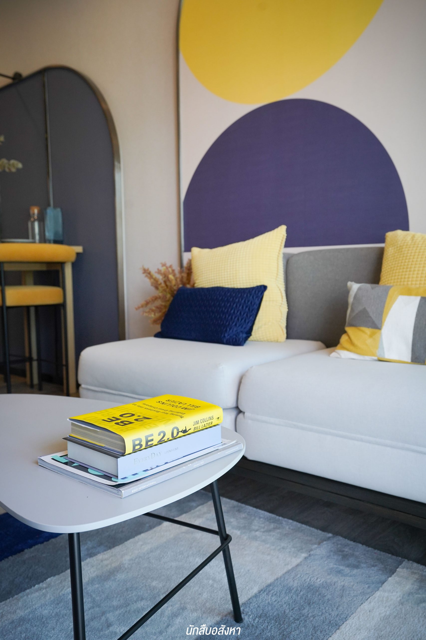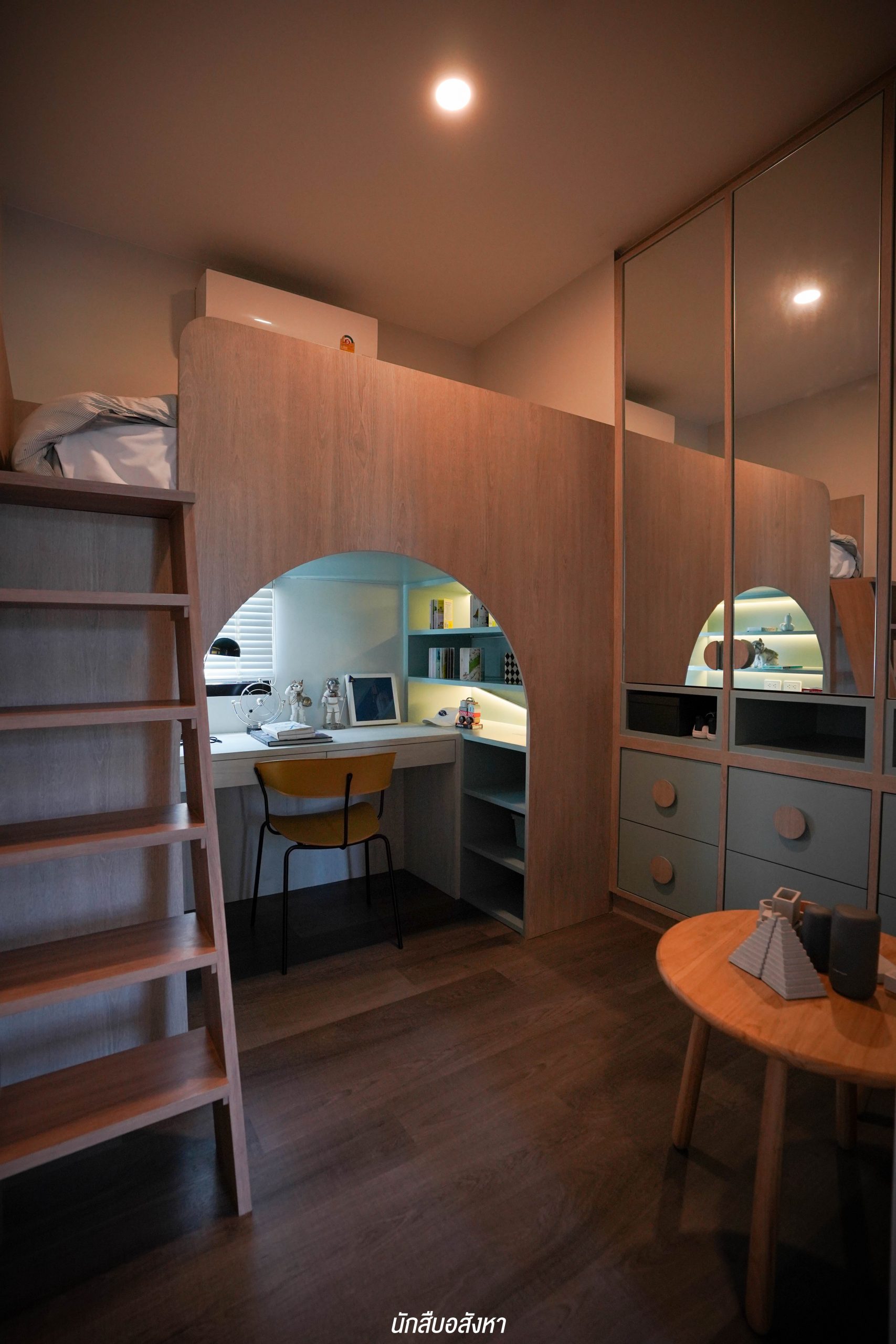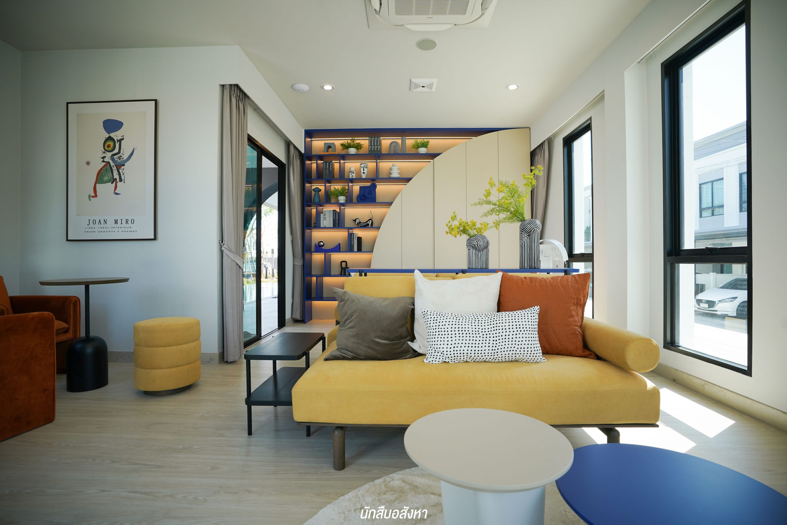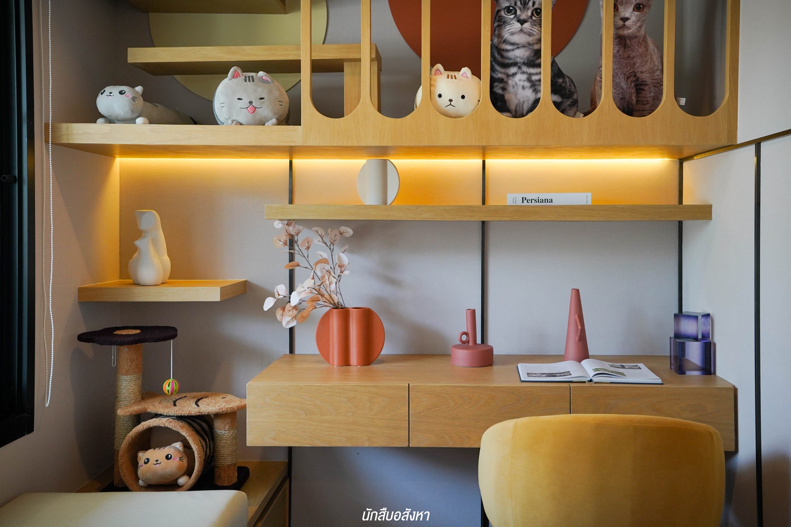 มุมนี้สามารถติดตั้งทีวีบิวท์อินและจัดวางโซฟาขนาด 3 ที่นั่งได้ ระยะห่างกำลังพอดีสายตา พื้นที่กว้าง ไม่ทำให้รู้สึกอึดอัดครับ