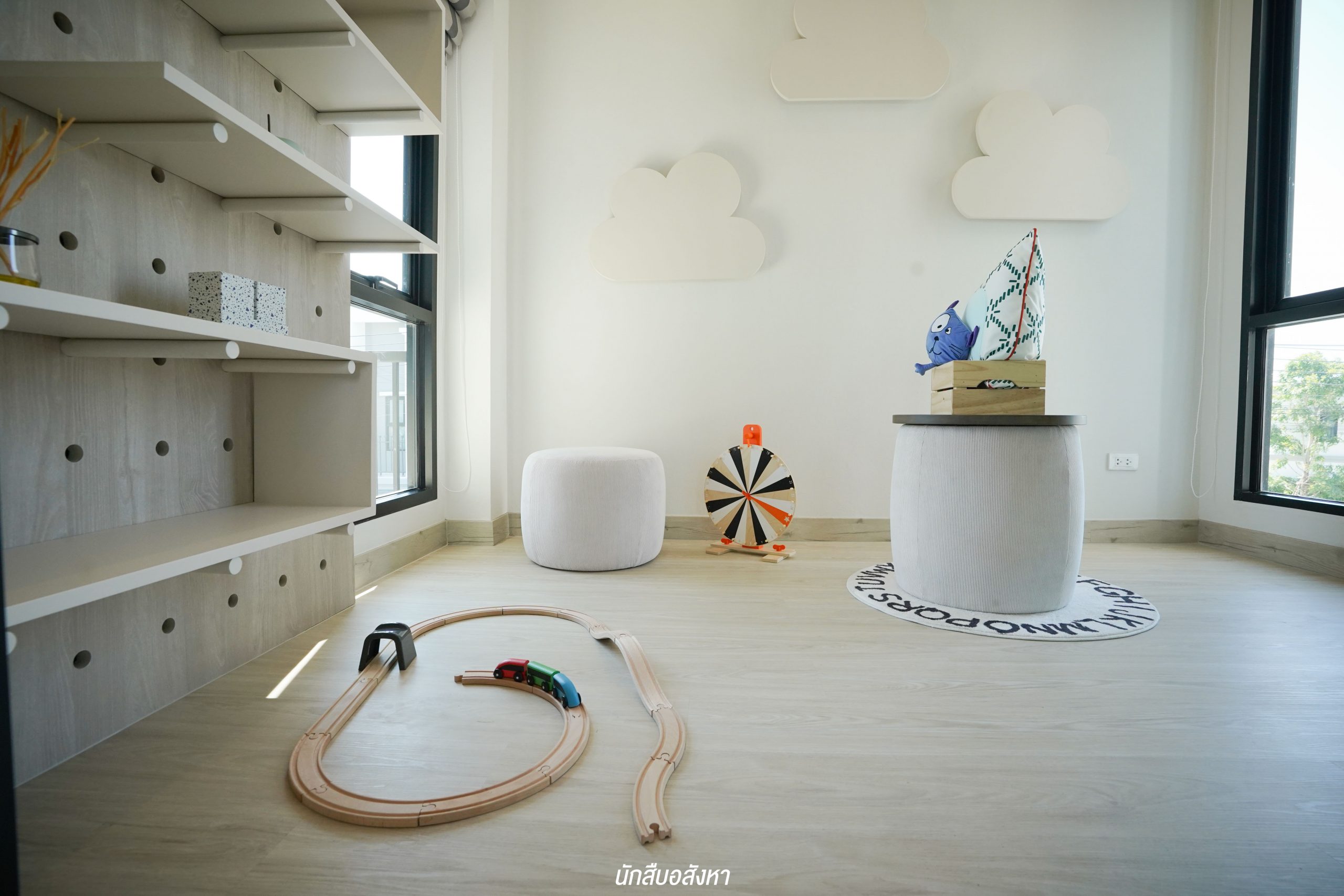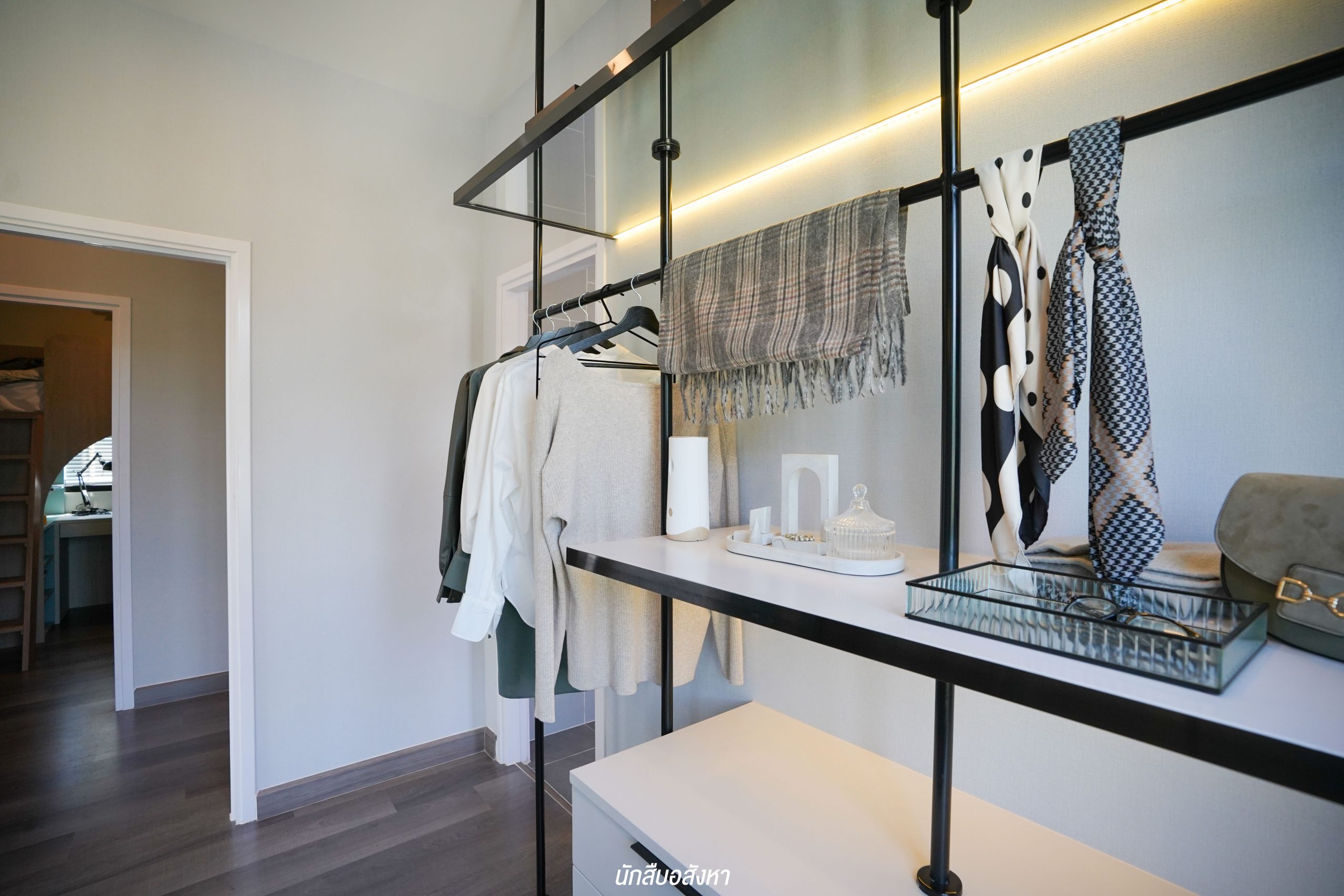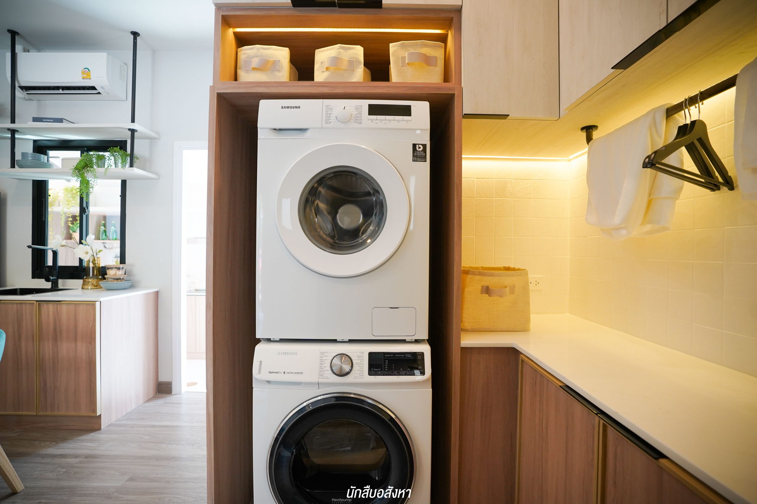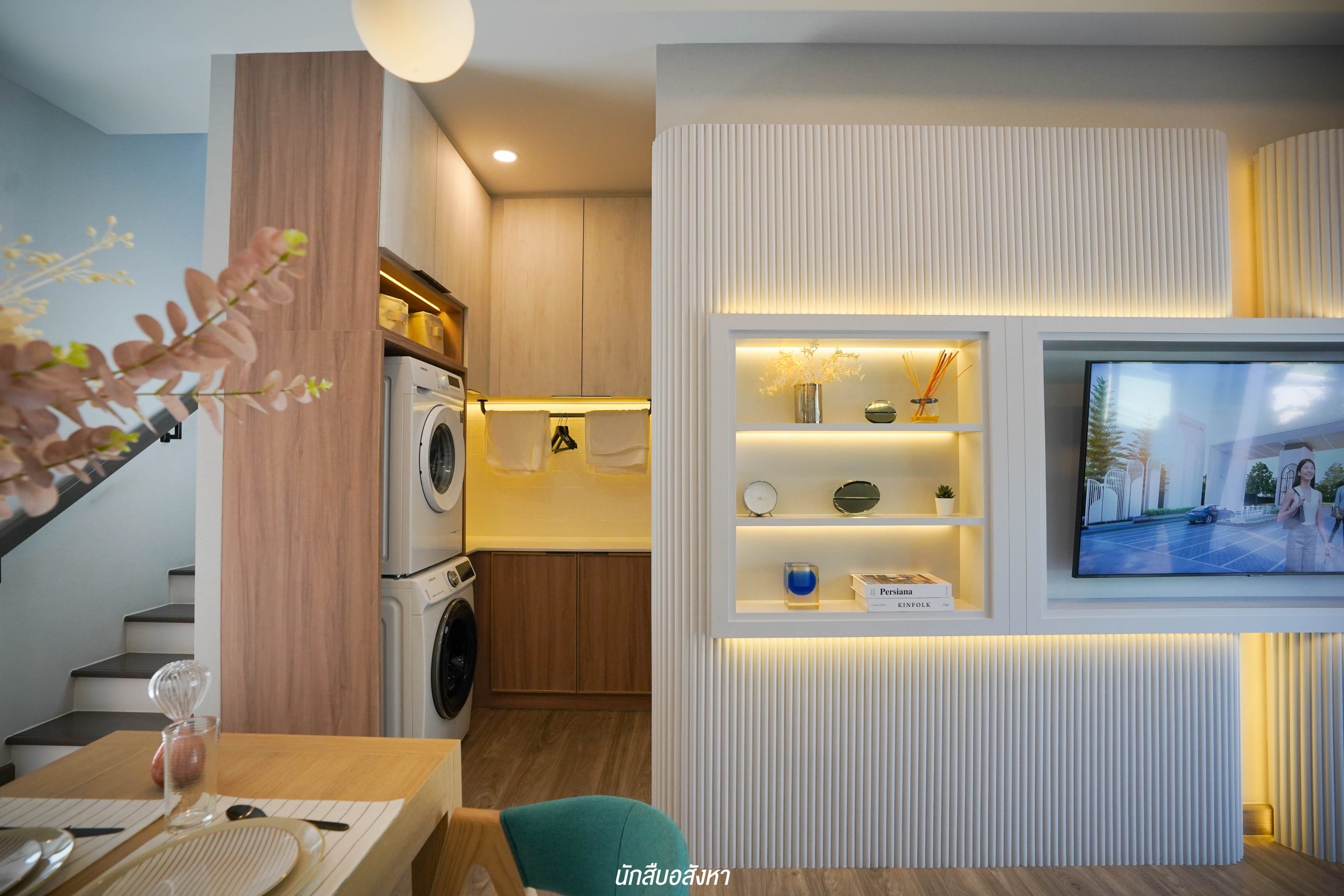 อีกหนึ่งไอเดียดี ๆ ที่บ้านตัวอย่างทำไว้ให้ดู บริเวณหน้าบันไดทำเป็นมุมซักรีด ทำให้เห็นได้ว่า โซนซักล้างไม่จำเป็นต้องอยู่บริเวณหลังบ้านเสมอไป
