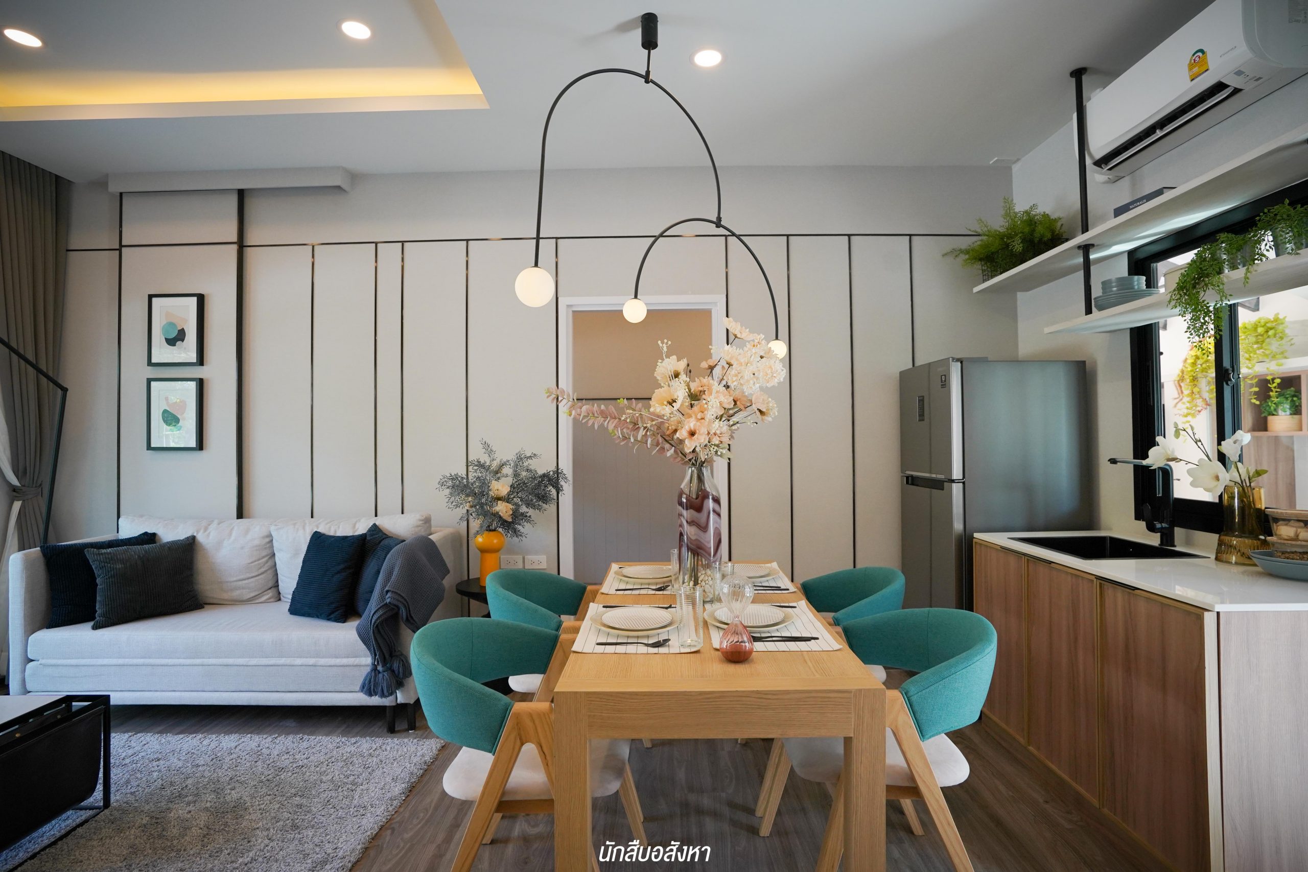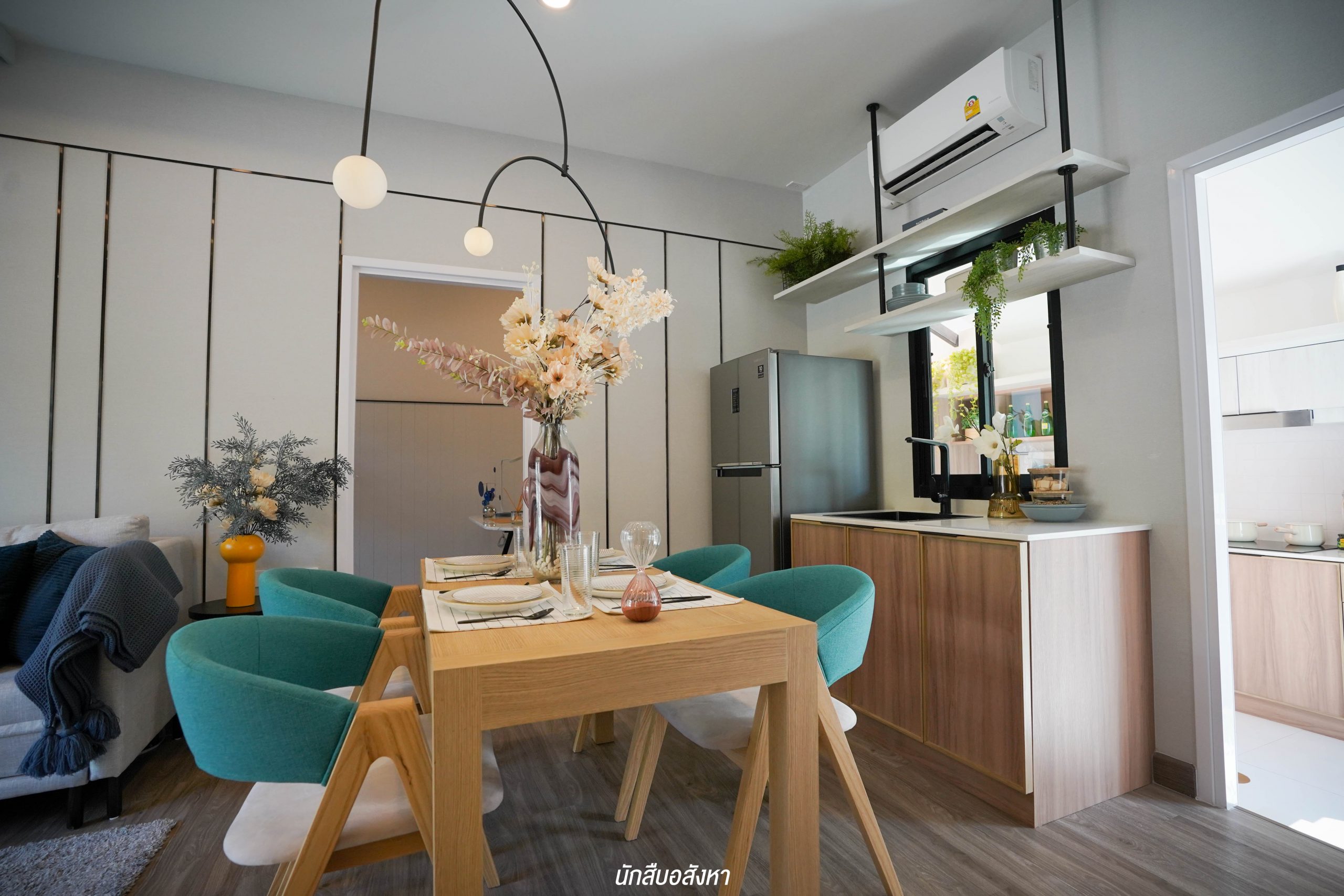ถัดเข้ามาเป็นส่วนรับประทานอาหารอยู่บริเวณกลางบ้าน สามารถวางโต๊ะขนาด 4 ที่นั่ง เคาน์เตอร์ล้างจานด้านหลัง หรือตู้เย็นก็ได้เช่นกันครับ