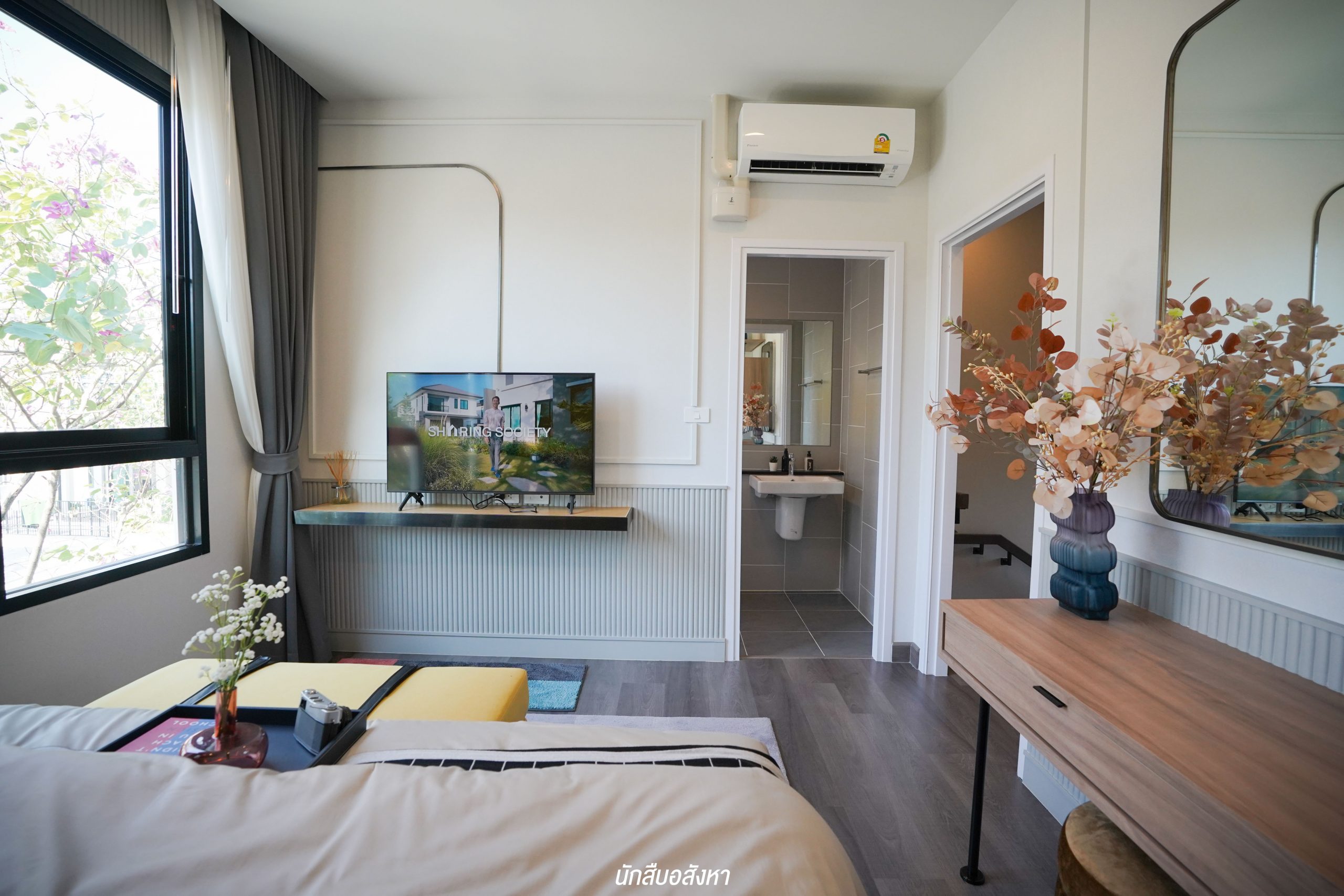 Master Bedroom ห้องนอนใหญ่ โปร่งสว่างจากบานหน้าต่าง สามารถวางเตียงคิงไซส์ ต่อเติม Walk-in Closet บริเวณหน้าห้องน้ำได้ครับ