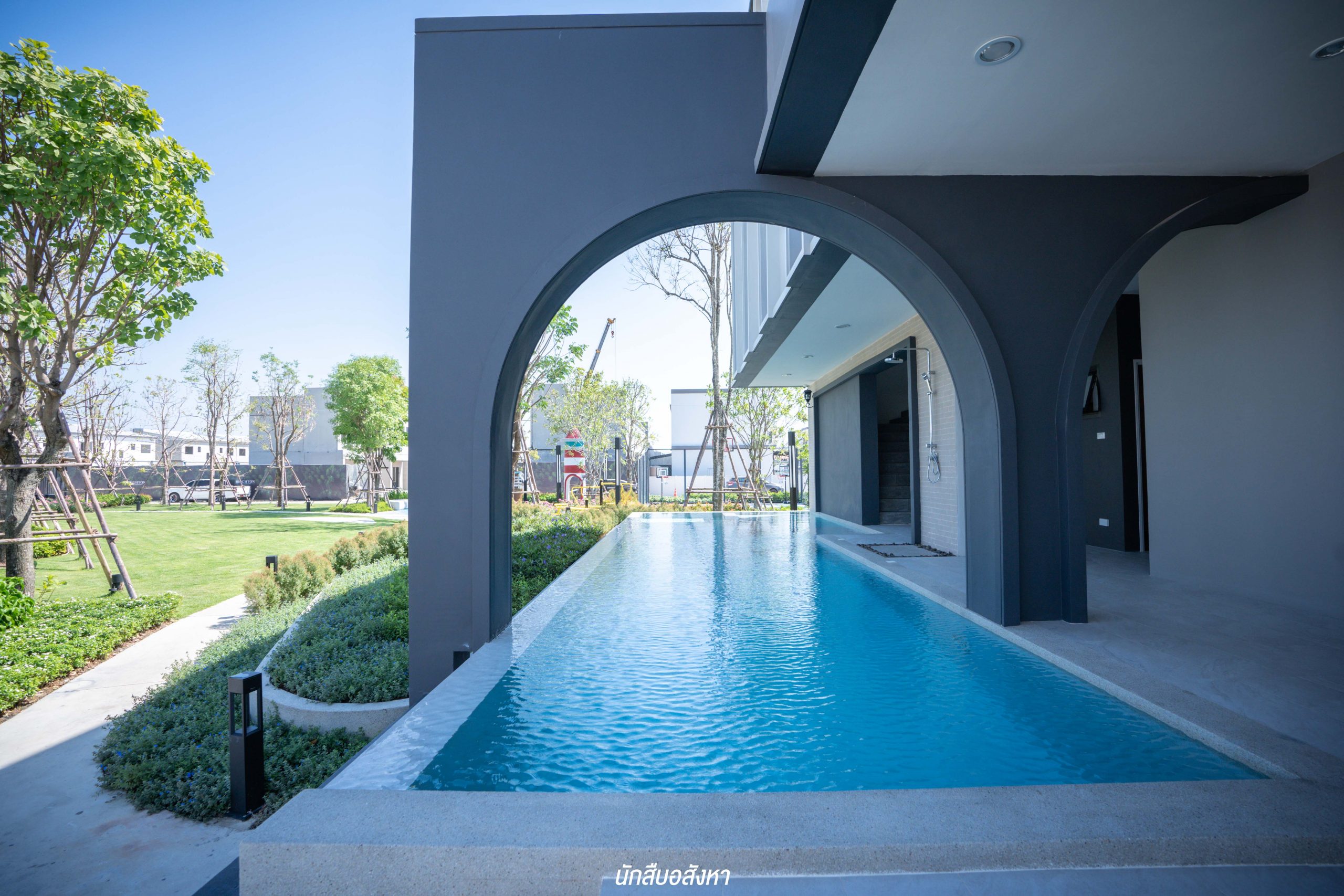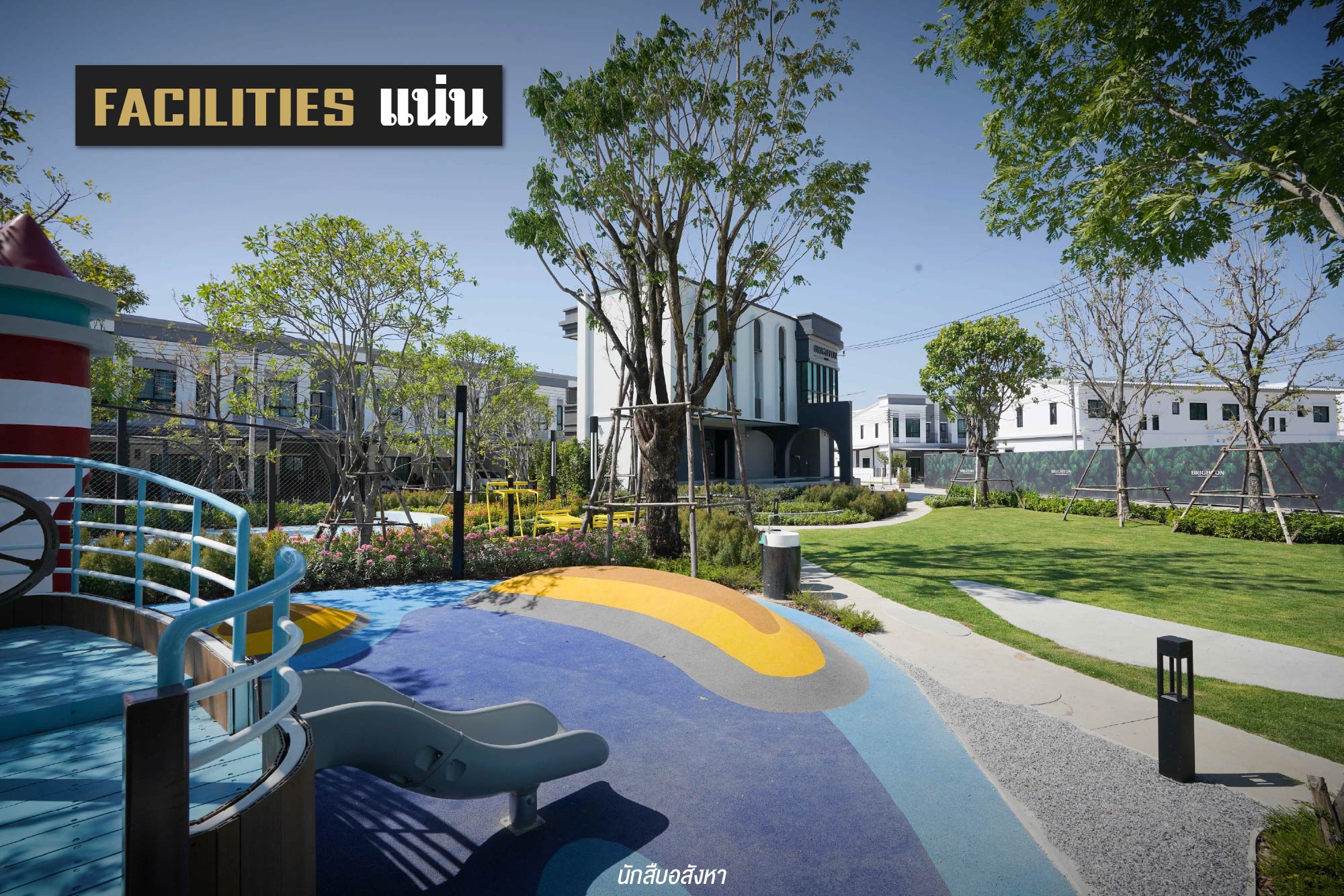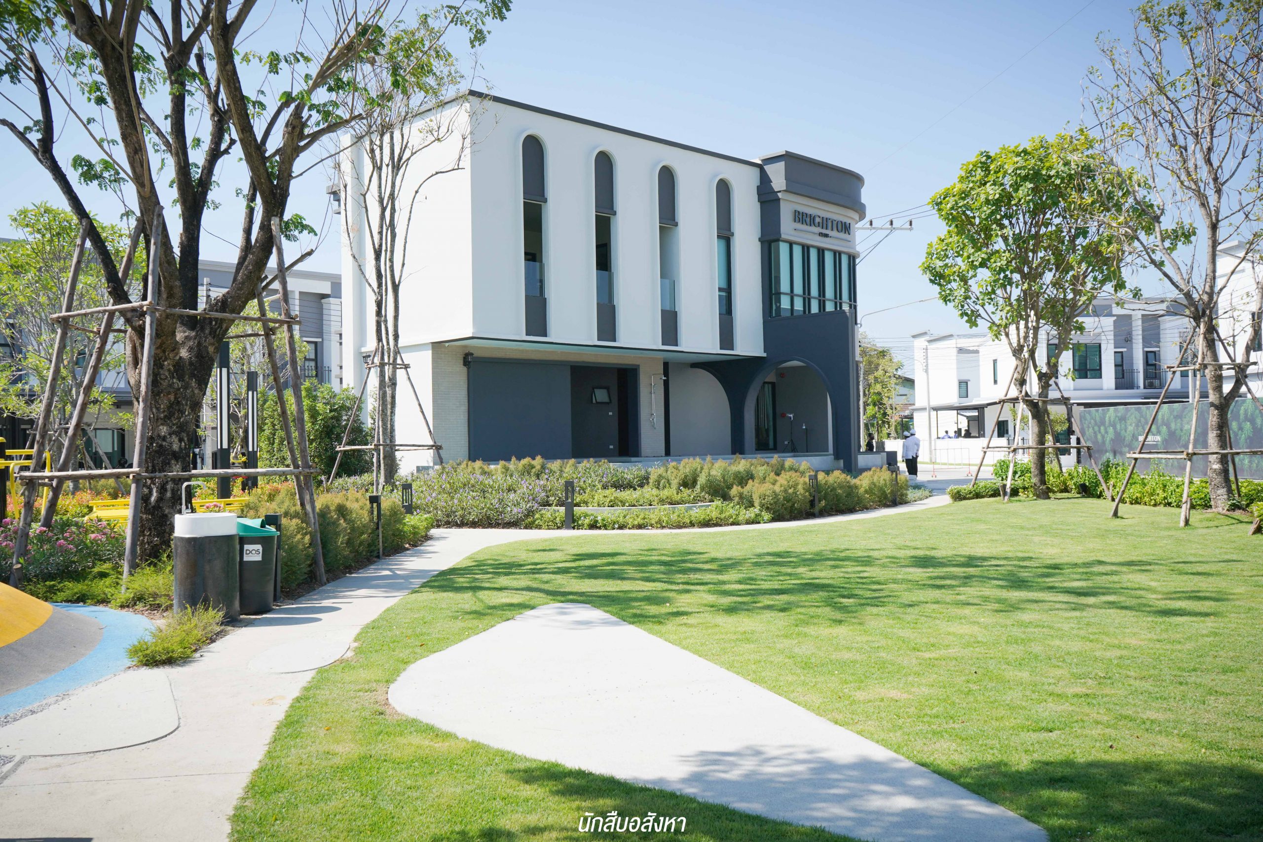 เมื่อผ่านซุ้มประตูโครงการเข้ามาแล้ว จะเป็นสิ่งอำนวยความสะดวกและพื้นที่ส่วนกลางที่อยู่บริเวณด้านหน้าครับ โดยคลับเฮ้าส์ถูกออกแบบภายใต้คอนเซ็ปต์ English Modern Style มาพร้อมกับฟังก์ชันมาตรฐานครบครัน ไม่ว่าจะเป็นสระว่ายน้ำระบบเกลือ, ฟิตเนส, Co-Working Space, Kids Room นอกจากนี้ ด้านนอกคลับเฮ้าส์ ยังมีสนามบาส และสวนส่วนกลาง ซึ่งเรียกได้ว่า Facilities แน่นมาก ๆ ครับ
