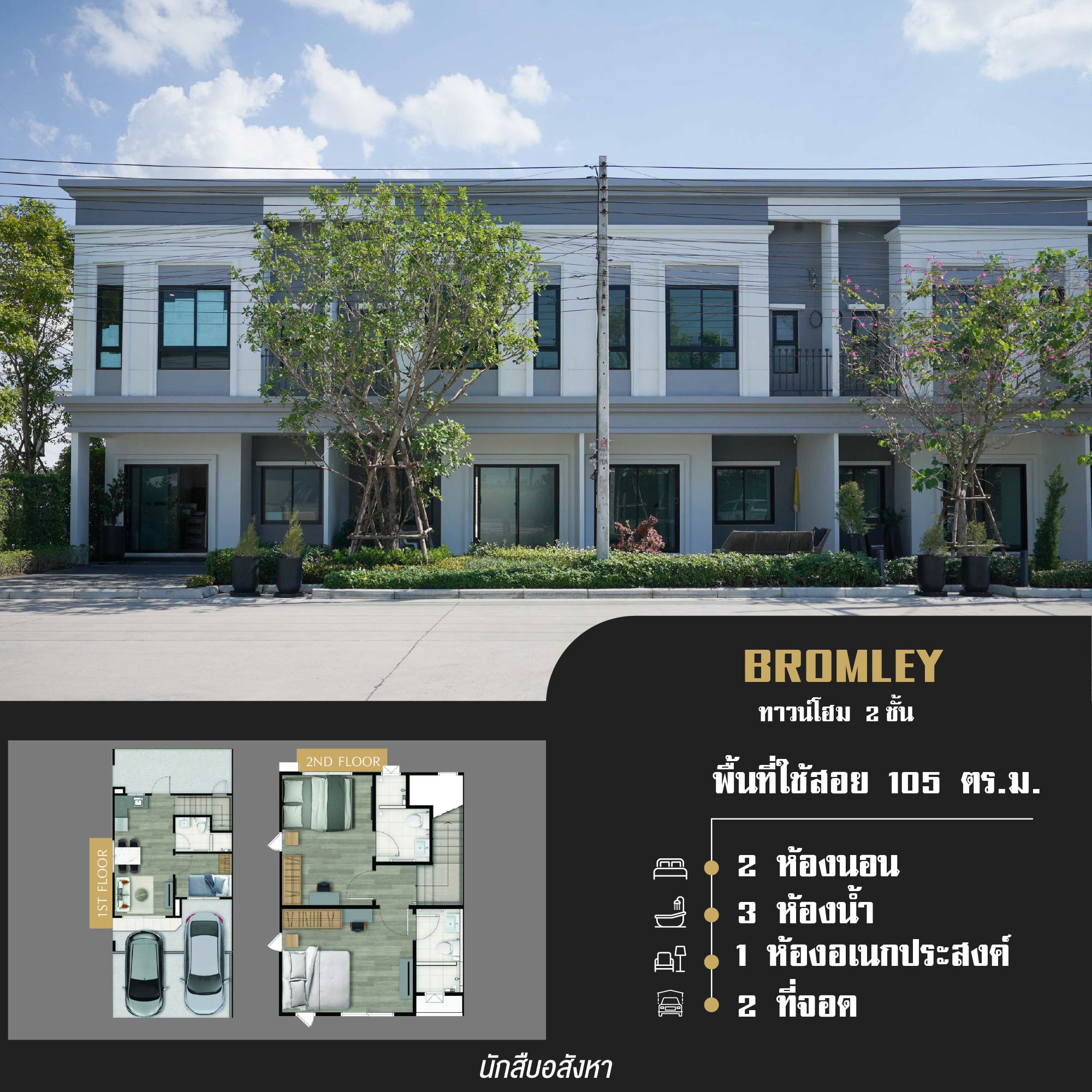 ▪ BROMLEY ทาวน์โฮม 2 ชั้น พื้นที่ใช้สอย 105 ตร.ม. ประกอบด้วย 2 ห้องนอน 1 ห้องอเนกประสงค์ 3 ห้องน้ำ 1 ห้องนั่งเล่น และ 2 ที่จอดรถ