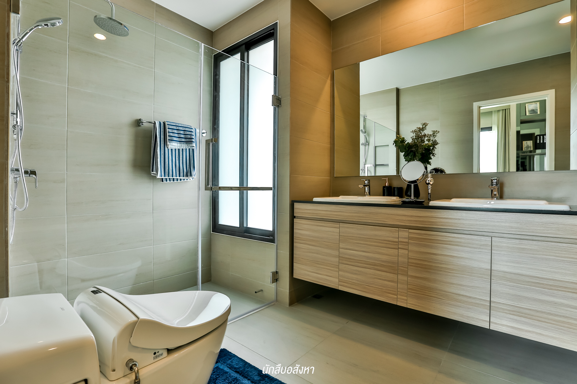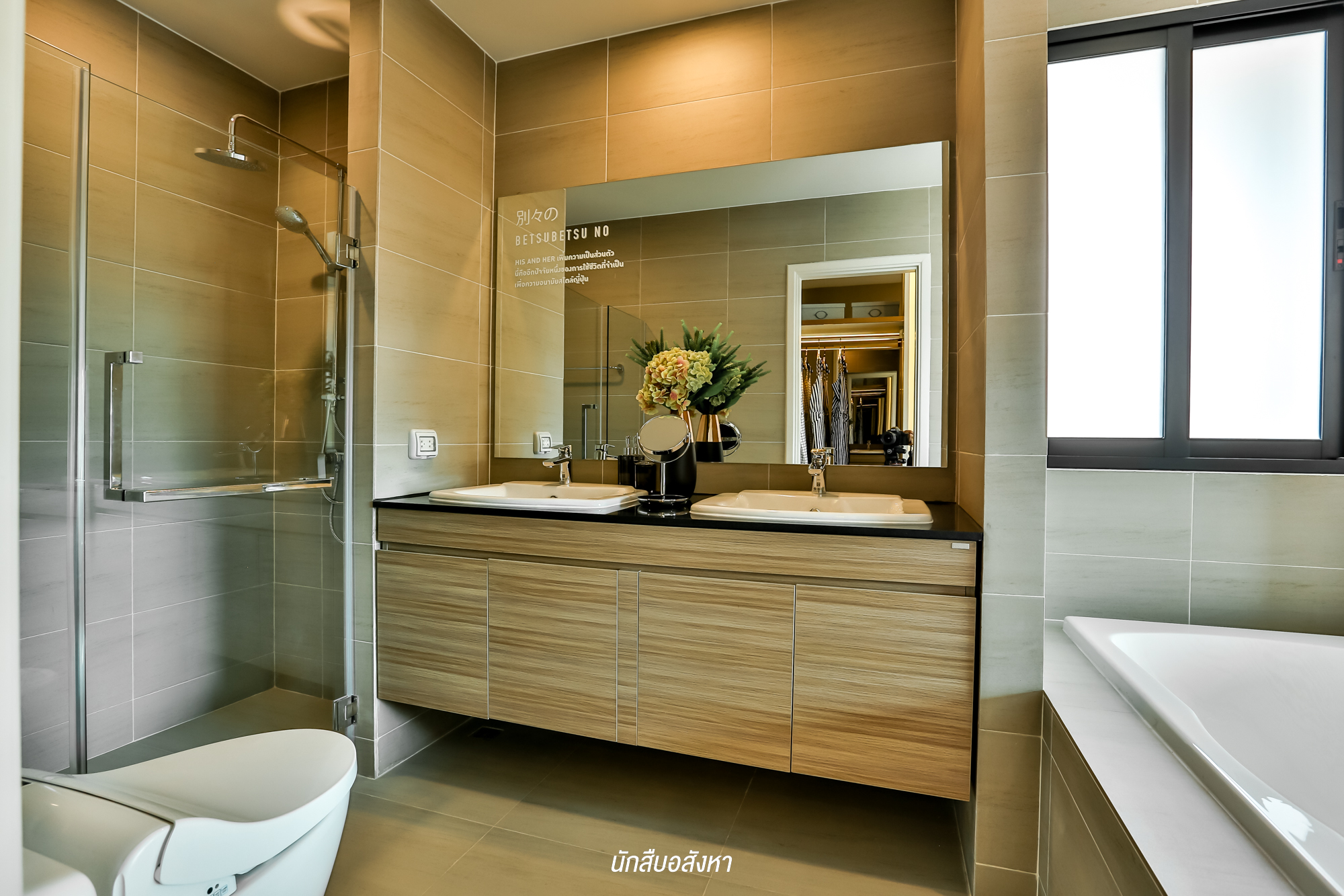 สำหรับพื้นที่ชั้น 2 โถงบันไดจะสูงประมาณ 3.9 ม. ซึ่งสูงกว่าบ้านขนาด 240 ตร.ม. ส่วนพื้นที่ Family Area ก็กว้างกว่า และความพิเศษยังคงอยู่ที่ Master Bedroom ที่มี Bathtub ส่วนตัวแบบ Sexy ซีทรู สามารถเทควิวผ่านกระจกออกไปได้เลย ซึ่งต่างจากบ้าน 240 ตร.ม. ที่เป็นแบบปกติ ส่วนสุขภัณฑ์จะเป็นแบบ Automatic ที่มีรีโมทคอนโทรลในการเปิด – ปิด ซึ่งห้องอื่นๆ จะเป็นแบบปกติครับ