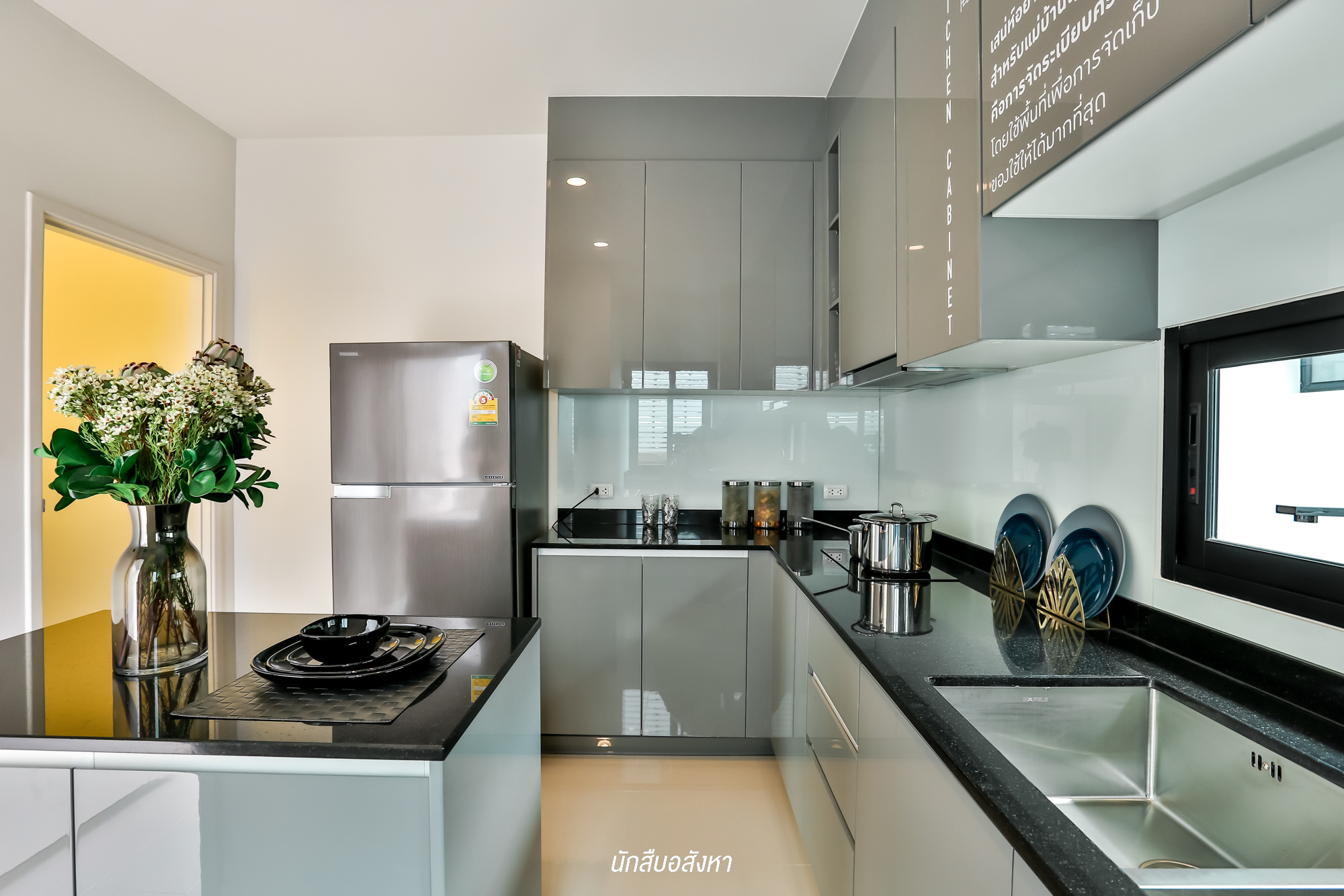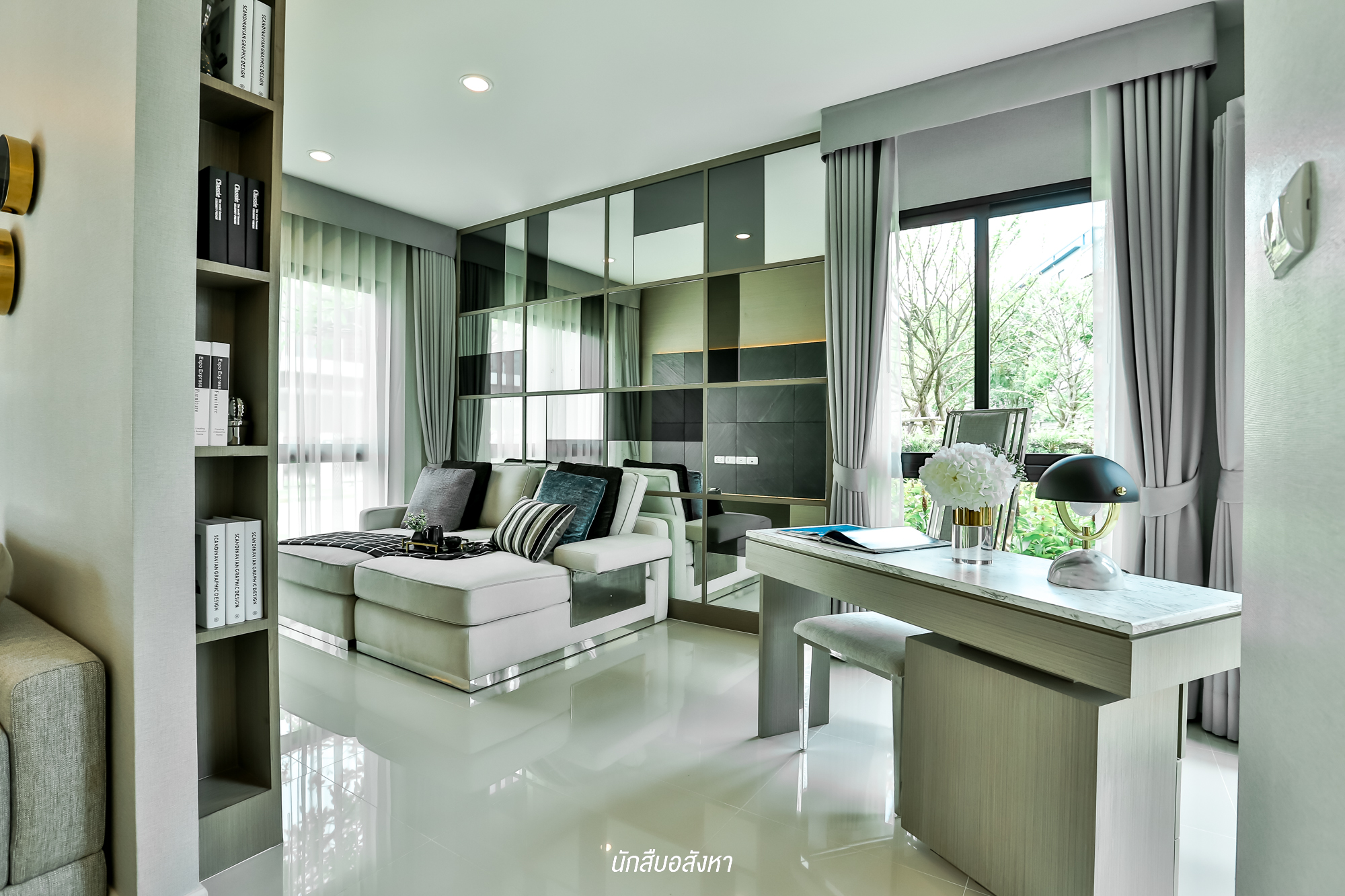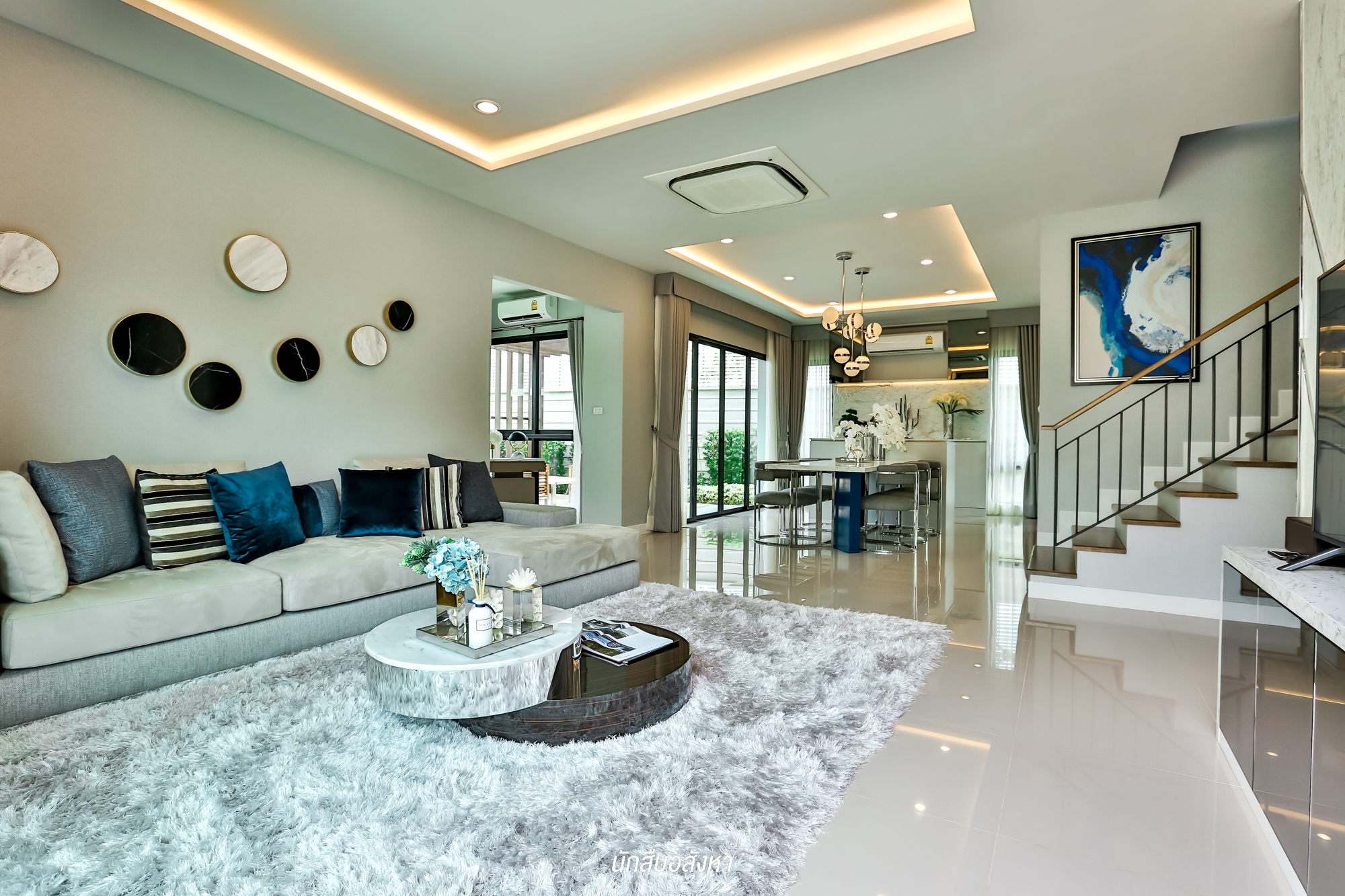 ส่วนภายในตัวบ้านนั้นชั้น 1 นั้น การตกแต่งจะเน้นเป็นโทนสีขาวซึ่งเริ่มจาก Living Area ขนาดใหญ่ และยังเชื่อมต่อกับ Dining Area ไปจนถึงครัว ซึ่งติดกันกับ Living Area นั้นจะเป็นห้องอเนกประสงค์ที่ทางโครงการตกแต่งให้เป็นห้องทำงานอีกมีมุมพักผ่อนไปในตัว ส่วนพื้นที่ห้องครัวนั้นตกแต่งเป็นแบบ U – Shape Kitchen และยังมีประตูเปิดไปบริเวณหลังบ้านอีกด้วยครับ