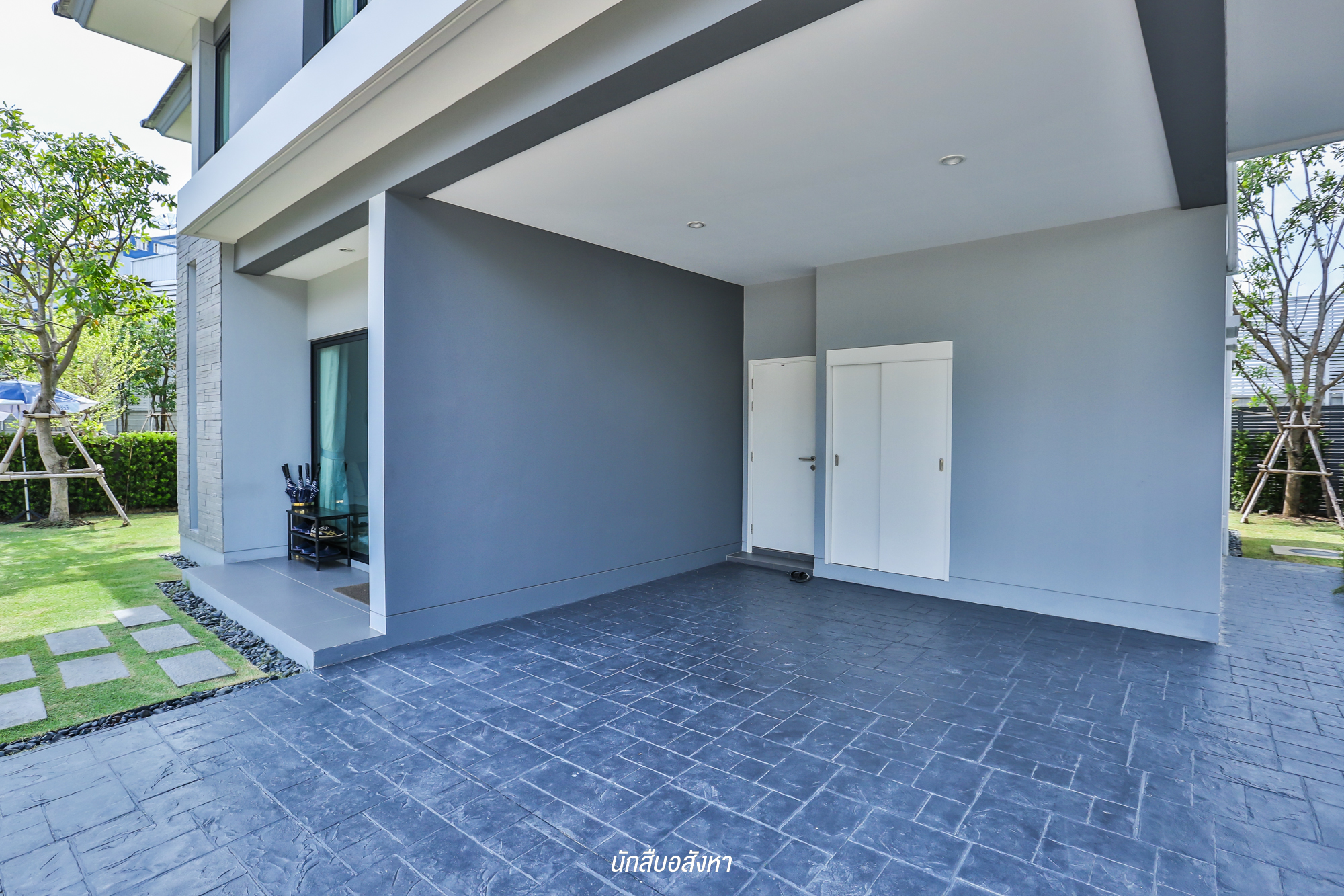 เริ่มกันที่พื้นที่จอดรถหน้าบ้านที่สามารถจอดได้ 2 คัน และยังมีพื้นที่รอบตัวบ้านเหลือให้สามารถตกแต่งเป็นสวนได้อีกด้วยครับ