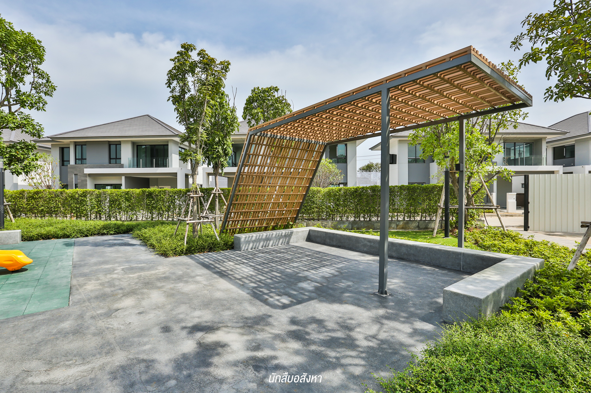 จะอยู่ตรงข้ามกับสนามเด็กเล่นเลยครับ ซึ่งมุมนี้สามารถใช้เป็นจุดนั่งพักผ่อนของคุณพ่อคุณแม่ที่มารอเฝ้าเด็กๆ เล่นก็ได้ครับ เราดูส่วนกลางของโครงการนี้กันแล้ว มาต่อที่ตัวบ้านของโครงการกันเลยครับ