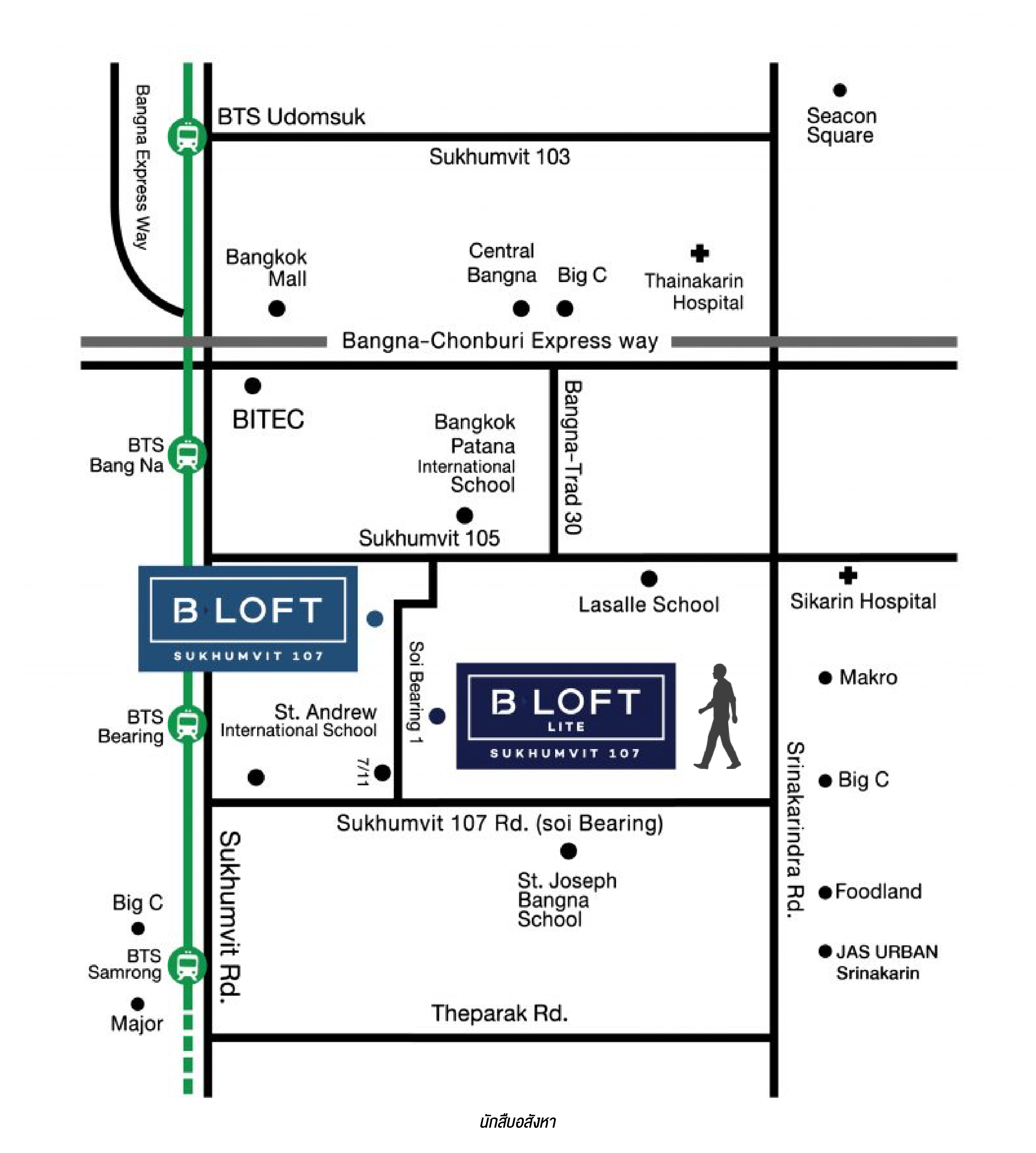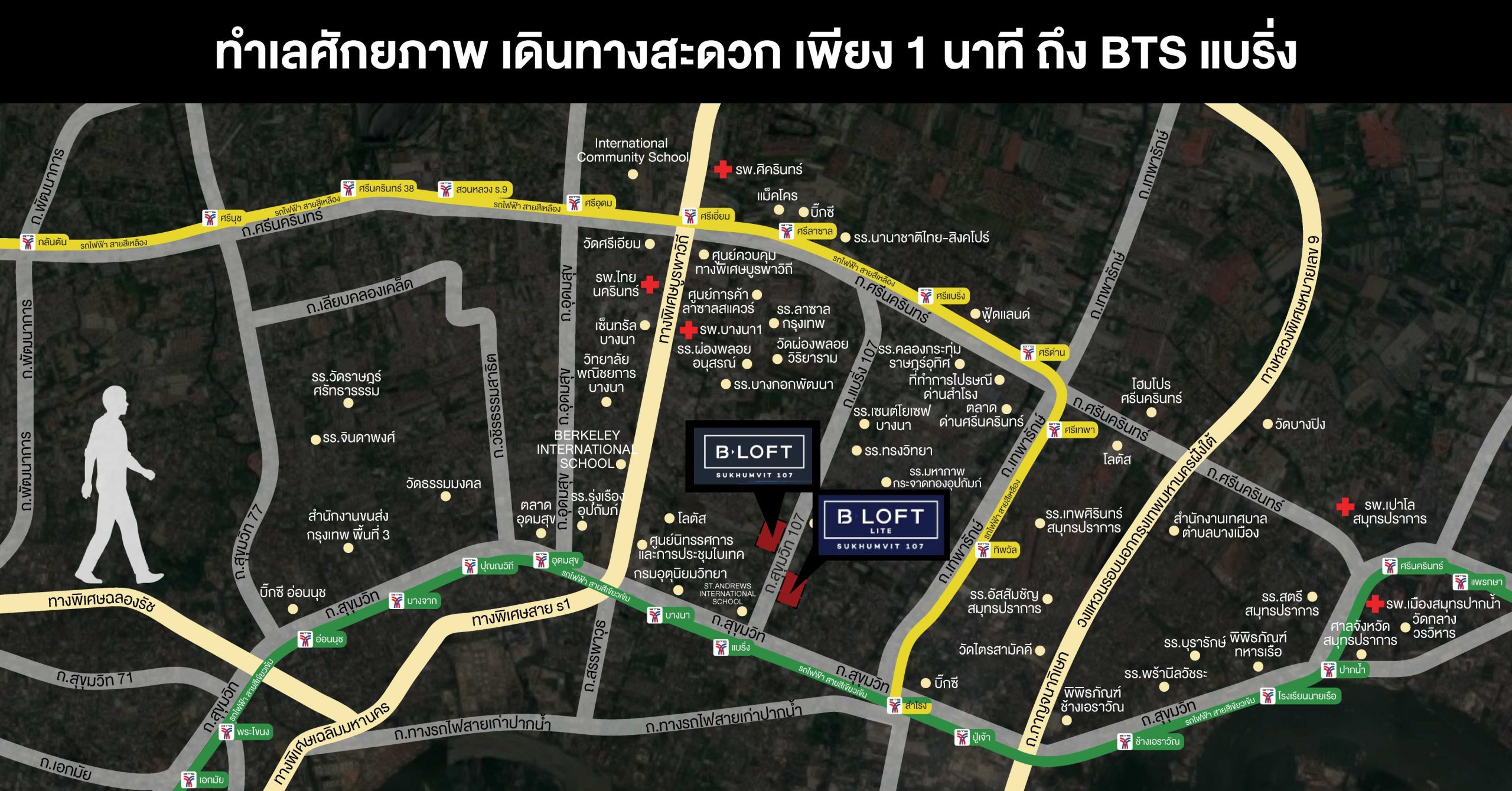 โครงการ “BLoft สุขุมวิท 107” ถือเป็นอีกโครงการที่ทาง Origin เลือกเจาะทำเลตามแนวรถไฟฟ้า ซึ่งศักยภาพของทำเลตามแนวรถไฟฟ้านั้นค่อนข้างได้เปรียบโครงการอื่นที่อยู่ไกลทั้งเรื่องของแหล่งอำนวยความสะดวก หรือจะเป็นเรื่องของการเดินทาง อย่างโครงการนี้ตั้งอยู่ในซอยแบริ่ง 1 สุขุมวิท 107 ซึ่งในซอยนี้ส่วนใหญ่เป็นที่พักอาศัยทั้งหมดเลยครับ ไม่ค่อยพลุกพล่านเท่าไร ซึ่งระยะทางจากตัวโครงการไปยังรถไฟฟ้าสายสีเขียว สถานีแบริ่ง ประมาณ 1 กม. เส้นนี้เดินทางสะดวกครับ อย่างตัวโครงการเองก็สามารถเข้าได้ 2 ทาง เพราะอยู่ระหว่างซอยแบริ่ง 1 และซอยลาซาล 12
