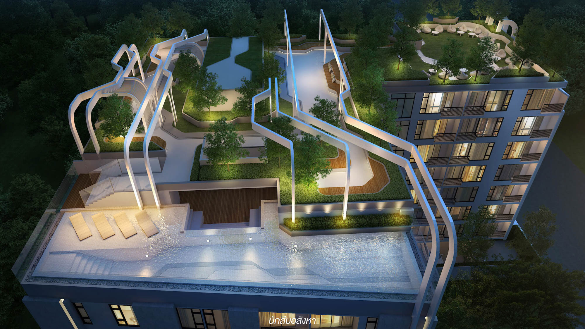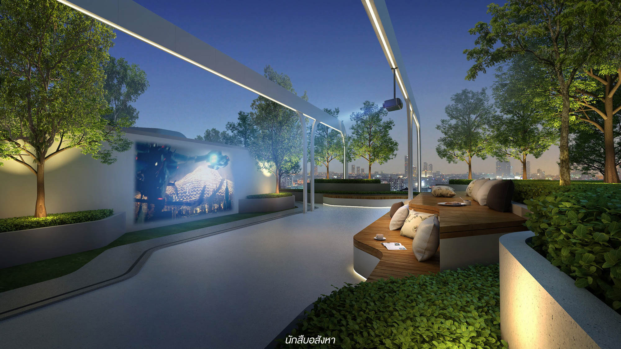 Amphi – Theater Space : มุมนี้ทำมาได้ค่อนข้างดีเลยครับ ปกติแล้วพื้นที่ดูหนังของแต่ละโครงการมักจะเป็นห้อง และมีโซฟาหรือเก้าอี้รองรับในระนาบเดียวกัน แต่ที่นี่เป็นที่นั่งแบบสเตป แถมอยู่กลางแจ้ง ก็จะได้บรรยากาศอีกแบบครับ