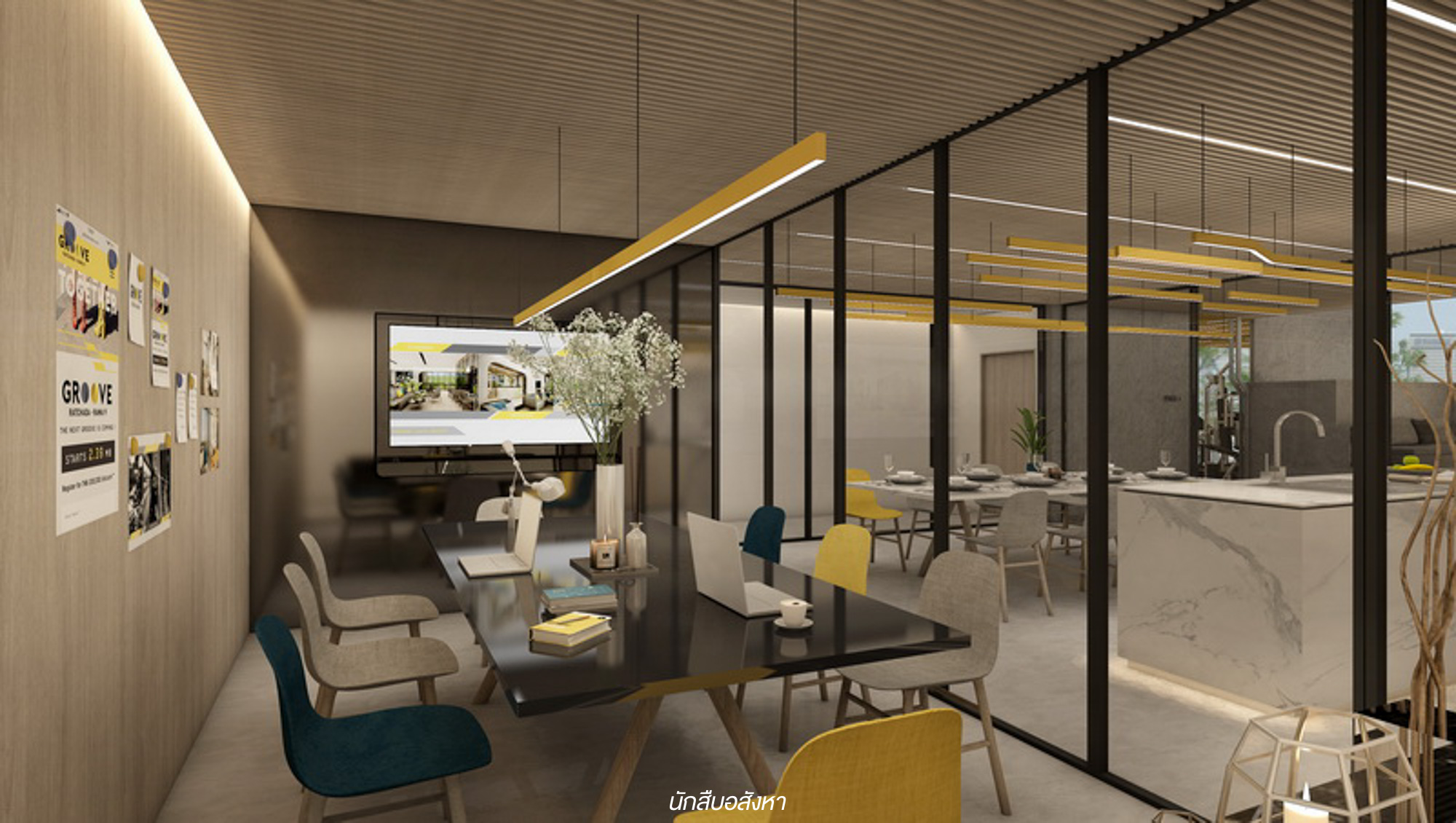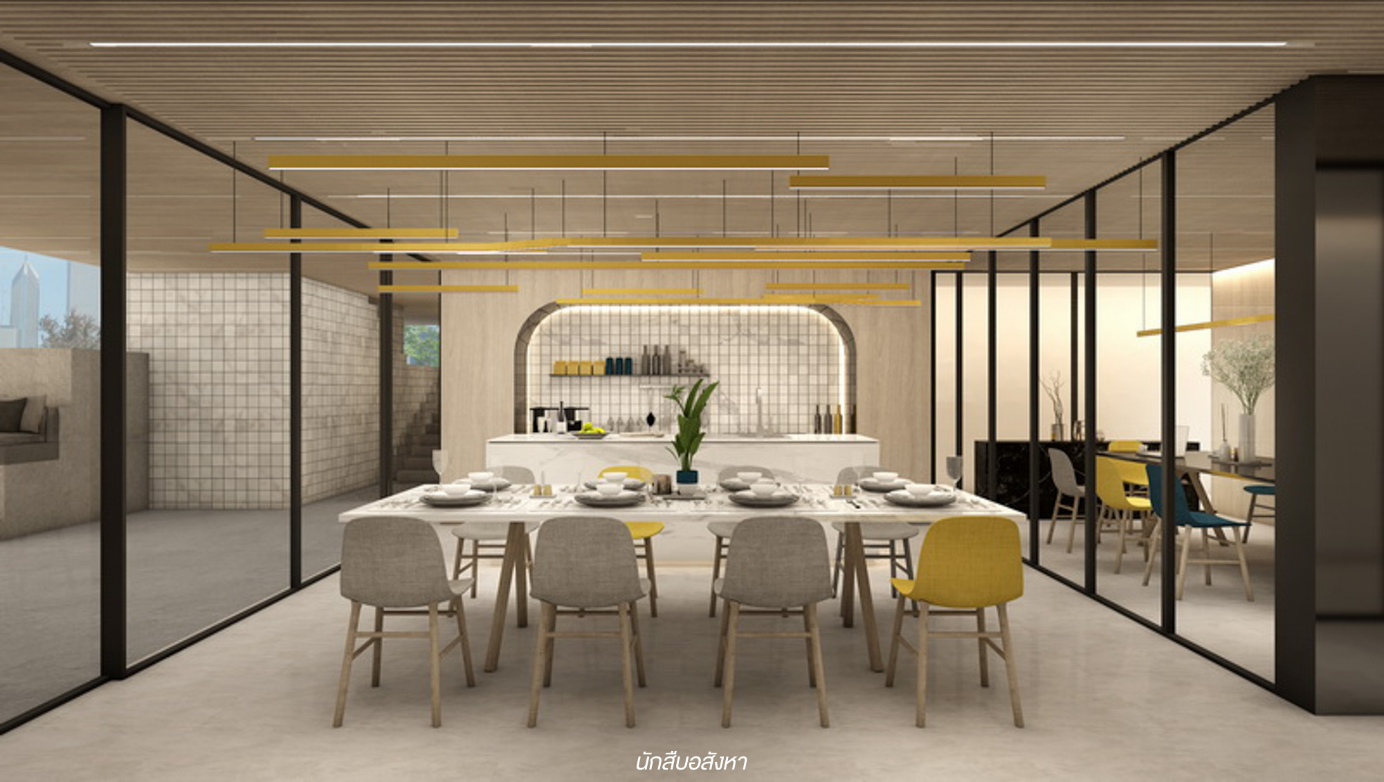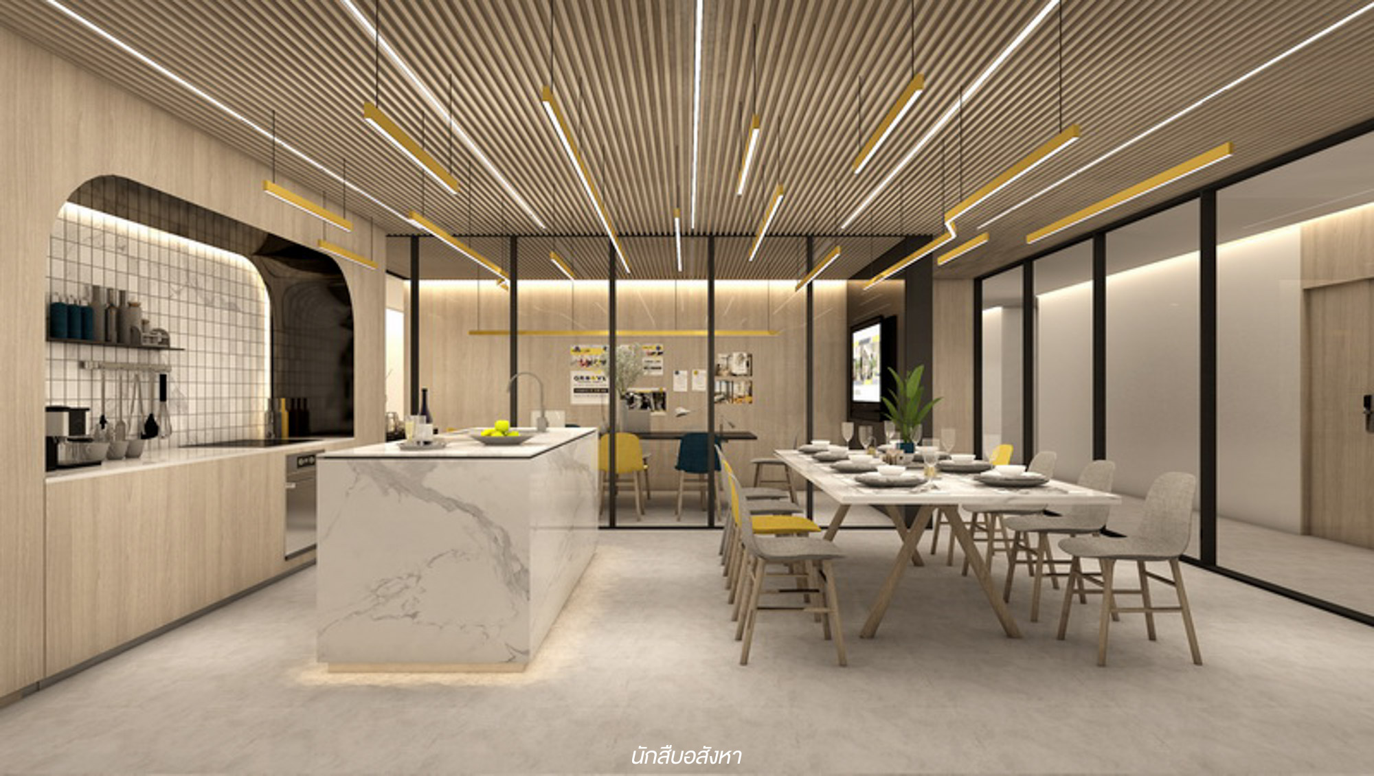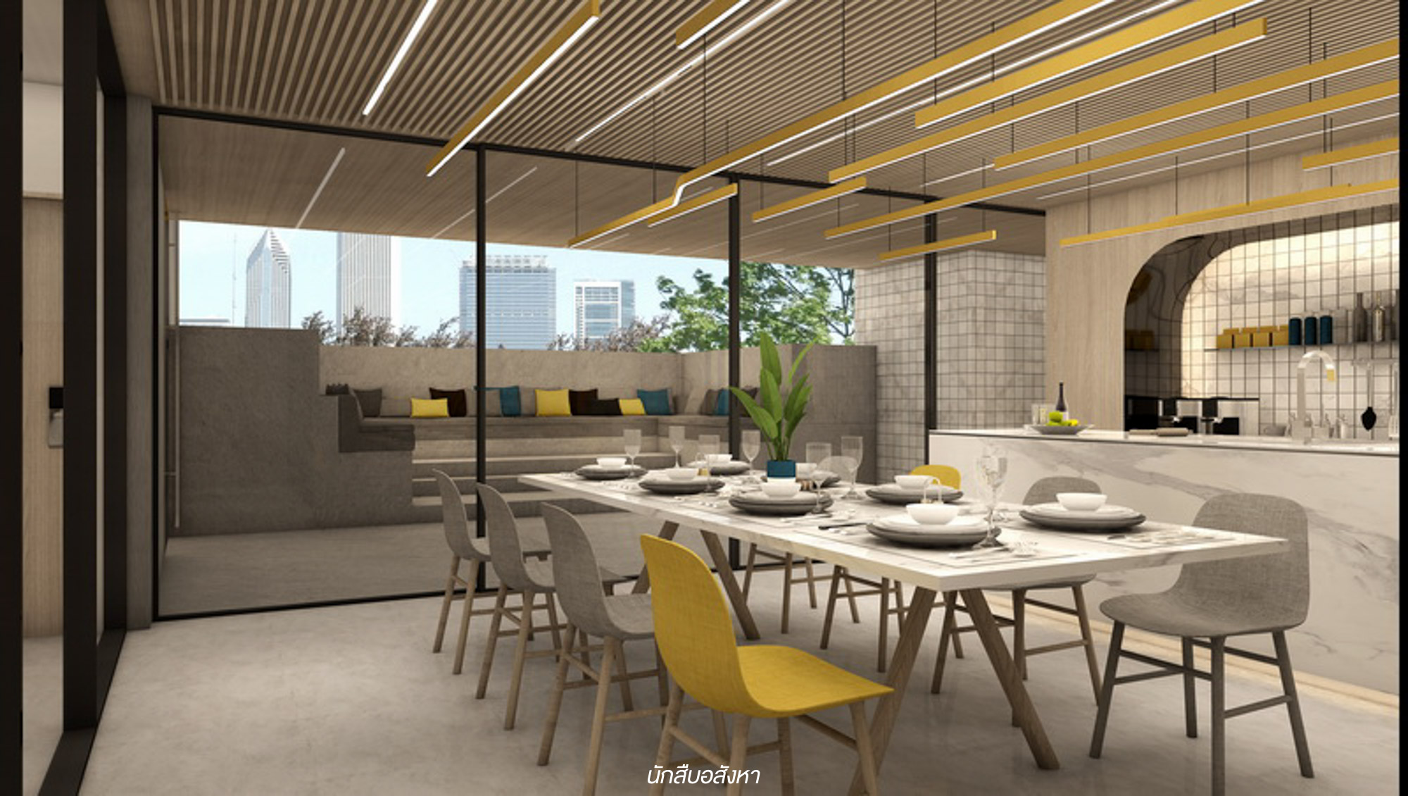 Co-Kitchen Space : ออกมาจากห้อง Meeting ก็จะเจอกับพื้นที่สำหรับทำอาหารเลยครับ ซึ่งพื้นที่นี้ค่อนข้างกว้างและมีโต๊ะรับประทานอาหารขนาดใหญ่เอาไว้รองรับลูกบ้านอย่างเพียงพอ ลูกบ้านสามารถใช้พื้นที่นี้สำหรับปาร์ตี้กับเพื่อนๆ ได้นะครับ ในขณะเดียวกันพื้นที่ด้านข้าง Co-Kitchen Space นั้นจะเห็นว่ามีมุม Sunken Seat บริเวณด้านหลังสระว่ายน้ำด้วยครับ
