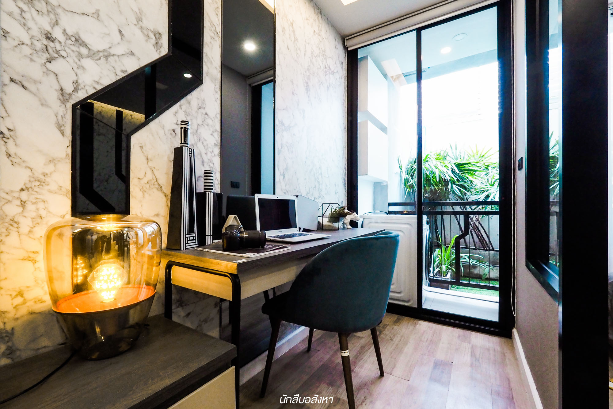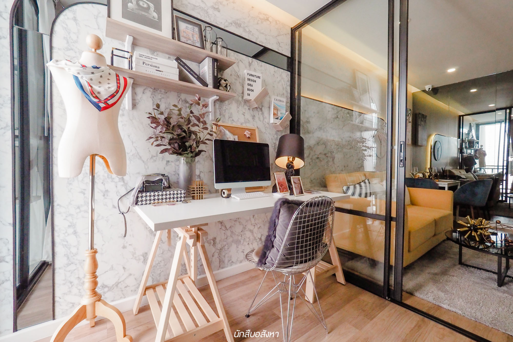 พื้นที่ของห้องอเนกประสงค์จะเชื่อมต่อกับส่วนของ Living Area ซึ่งจริงๆ แล้วห้องนี้เราสามารถทำเป็นห้องนอนเล็กได้ วางเตียงขนาด 3 ฟุตได้สบายๆ ครับ หรือใครที่ชอบไอเดียการตกแต่งเป็นห้องทำงานแบบที่โครงการแต่งมาให้ดูก็ได้เช่นกันครับ