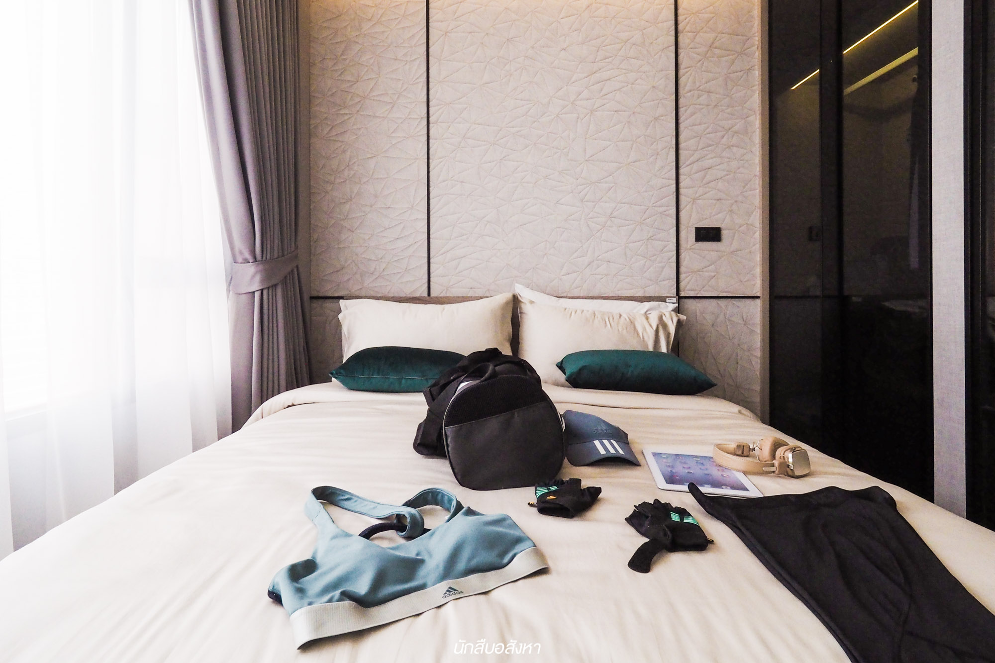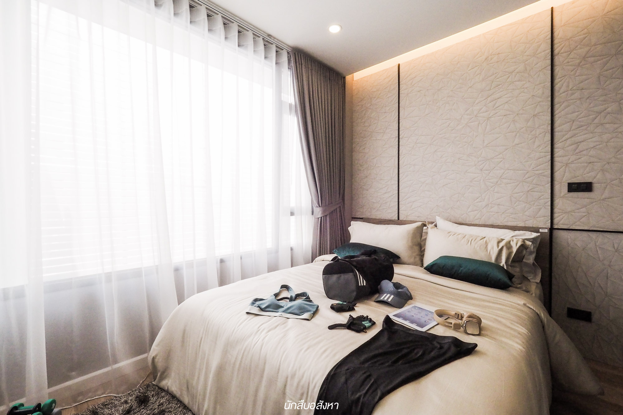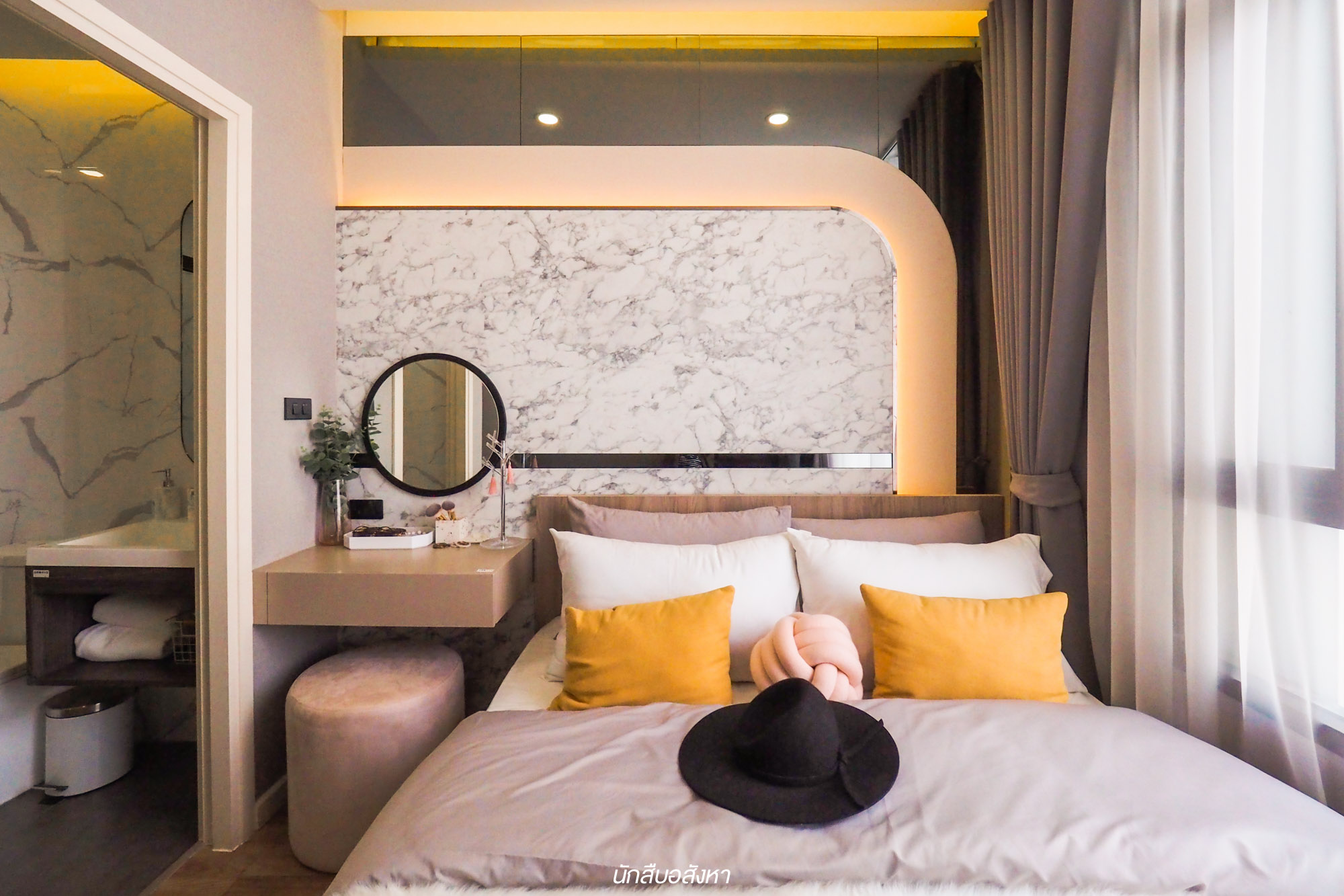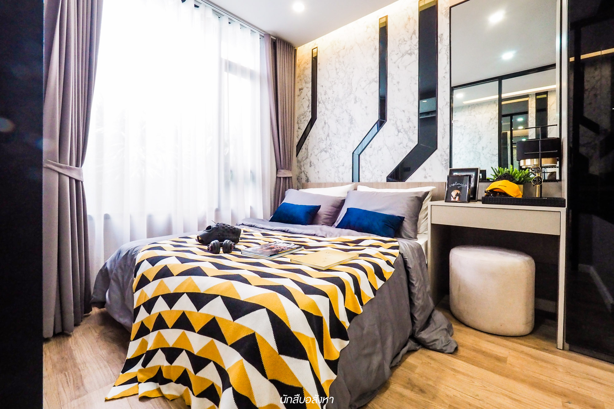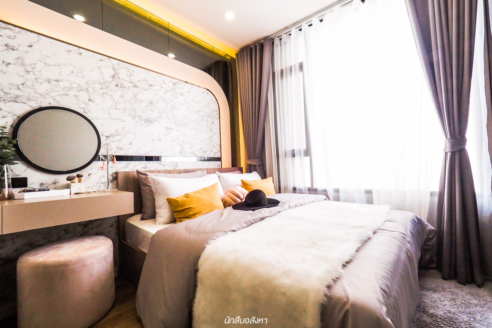 สำหรับห้องนอนนั้นทางโครงการตกแต่งด้วย Mood & Tone ที่ลงตัวกับผู้หญิงดีครับ วางเตียงขนาด 5 ฟุตได้ และมีพื้นที่ช่วงหัวเตียงจัดเป็นมุมแต่งตัวได้ครับ