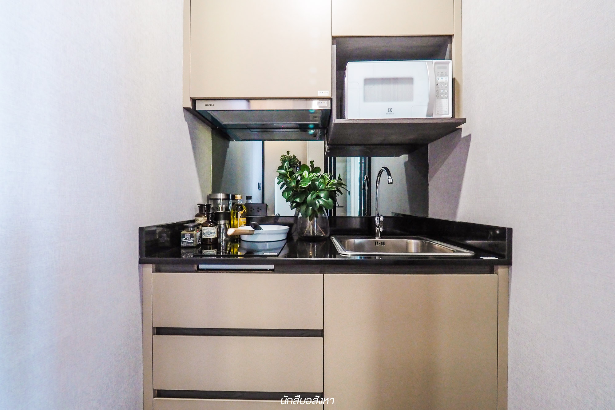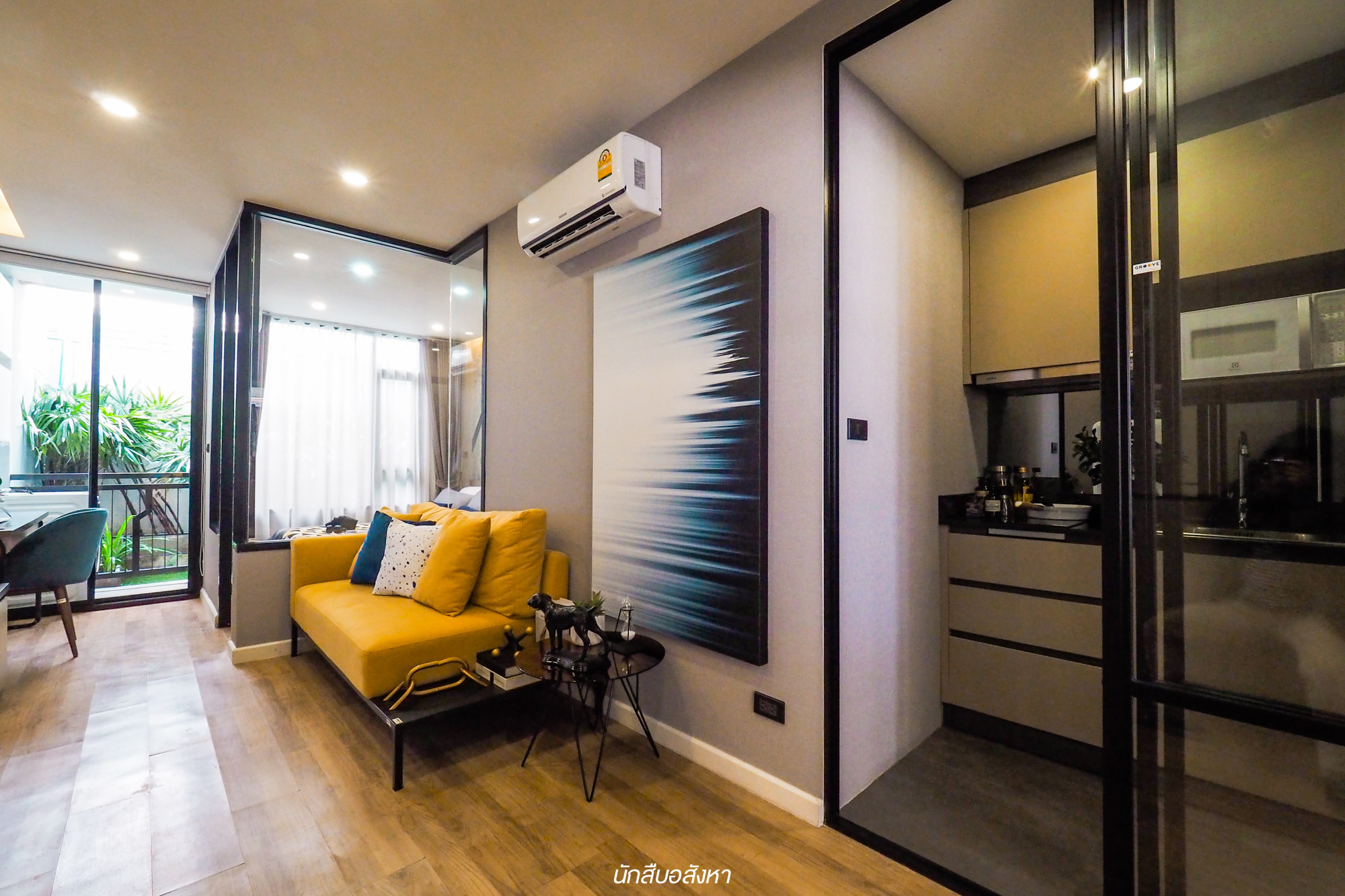 เริ่มกันที่ห้องตัวอย่างแรกอย่างห้อง 1 Bedroom ขนาด 23.81 ตร.ม. กันครับ ผมเริ่มจากประตูห้องซึ่งโครงการจะให้แบบ Smart Digital Door Lock ของ Home Shield แบบ 3 ฟังก์ชัน ทั้ง Bio Metric Fingerprint Sensor, Pass Code และ Mechanical Key มาให้เพื่อความปลอดภัย และทุกห้องของโครงการผมต้องบอกก่อนว่าทางโครงการตกแต่งให้แบบ Fully Furnished พร้อมได้ Furniture Package สามารถเข้าอยู่ได้เลย สะดวกสบายมากครับ ซึ่งโซนแรกที่จะเจอเมื่อเข้าห้องมาก็คือ Living Area ครับ ผมชอบ Mood & Tone ของห้องนี้นะครับ เหมาะกับคนรุ่นใหม่ดี ซึ่งห้องนี้ได้ฟังก์ชันครัวเปิดก็จริง แต่ว่าส่วนของห้องครัวอยู่ติดระเบียง สามารถเปิดระบายอากาศได้ อันนี้ผมว่าเป็นแปลนที่ดีครับ ส่วนตัวห้องน้ำนั้นก็จะเชื่อมต่อกับห้องครัวอีกที