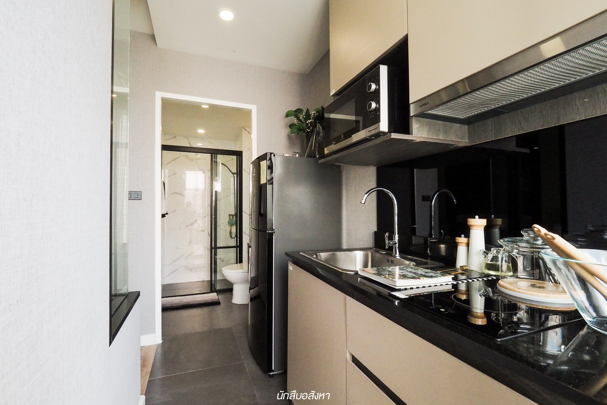 มาต่อกันที่ห้อง 1 Bedroom ขนาด 28.97 ตร.ม. กันบ้างครับ ซึ่งเมื่อเข้ามาภายในห้องแล้วจะเจอกับห้องครัวซึ่งเป็นครัวปิดก่อนเลยครับ แต่สิ่งที่ผมว้าวมากเป็นพิเศษก็คือความกว้างของบริเวณ Living Area ครับ ซึ่งการที่โครงการกั้นแต่ละห้องไว้เป็นสัดส่วนแบบนี้ทำให้เราได้ใช้พื้นที่ใช้สอยภายในห้องแบบจัดเต็มมากยิ่งขึ้นด้วย ซึ่งในส่วนของห้องน้ำนั้นจะสามารถเข้าได้จากห้องนอนครับ