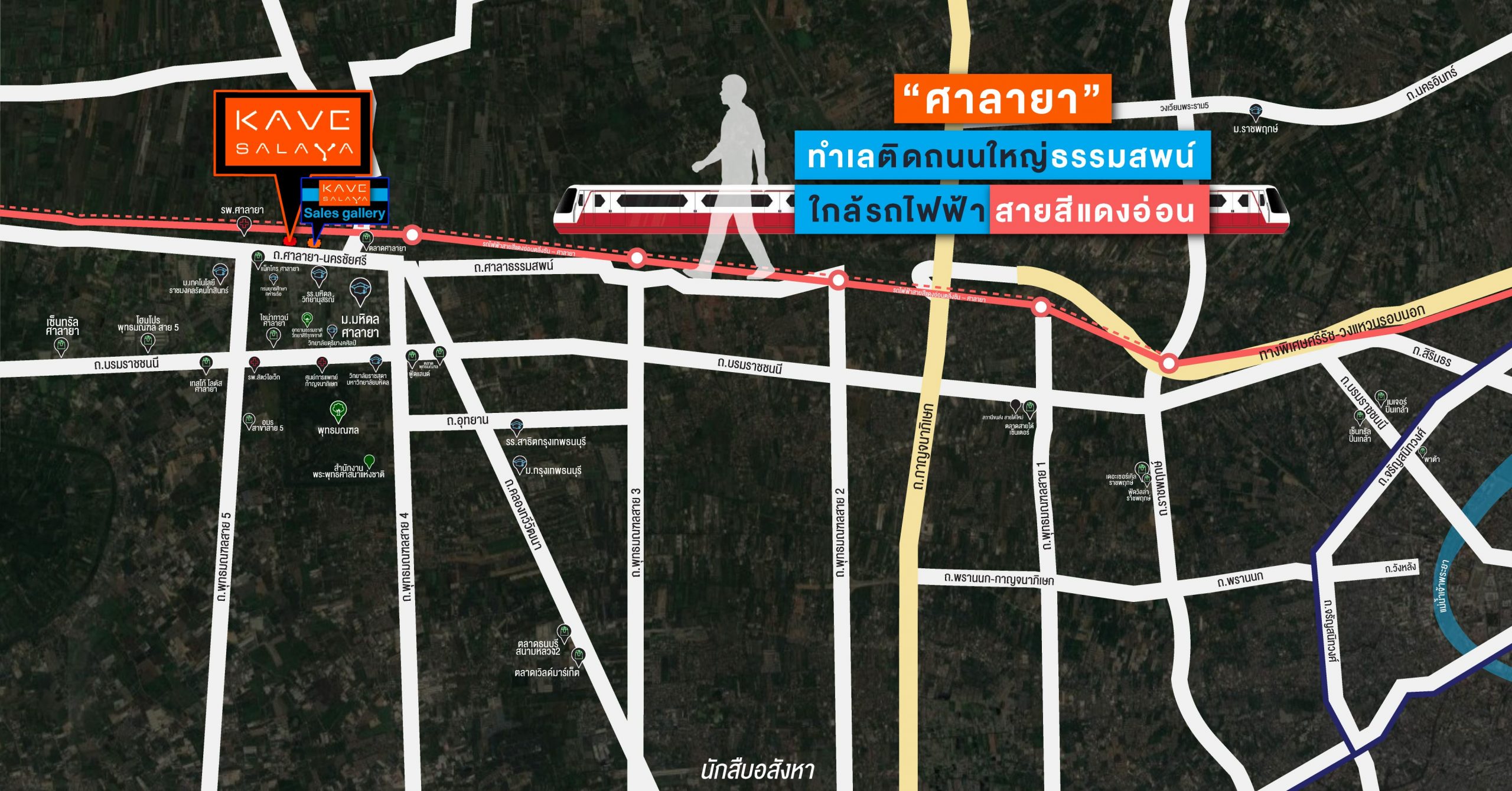 นอกจากการเดินทางด้วยถนนเส้นหลักหรือเส้นรองต่างๆ แล้ว ในอนาคตย่านนี้ก็ยังรองรับการเดินทางด้วยรถไฟฟ้าอีกด้วยครับ เพราะตัวโครงการอยู่ใกล้กับรถไฟฟ้าสายสีแดงอ่อน สถานีศาลายา ซึ่งแน่นอนครับว่าการเข้ามาของรถไฟฟ้าทำให้การเดินทางเข้า – ออกเมืองจะยิ่งสะดวกมากขึ้น และผู้คนในย่านสามารถเชื่อมต่อไลฟ์สไตล์ต่างๆ ได้ง่ายมากขึ้น ซึ่งพอได้พูดถึงเรื่องของไลฟ์สไตล์แล้ว ทำเลที่ตั้งของโครงการนั้นใกล้ทั้ง The Salaya, Tesco Lotus ศาลายา, Makro ศาลายา, China Town รวมถึง Central ศาลายา