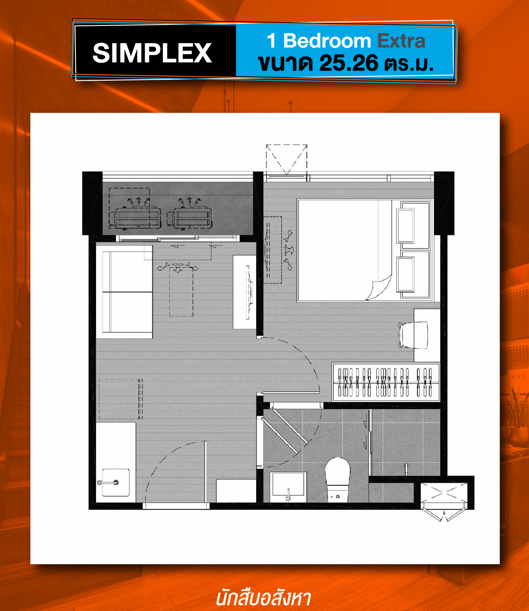 ห้องนี้จะเป็นห้อง 1 Bedroom Extra ขนาด 25.26 ตร.ม. พื้นที่ใช้สอยกว้างมากขึ้น ทำให้สามารถปรับเปลี่ยนฟังก์ชันได้ค่อนข้างหลากหลายมากยิ่งขึ้น และอีกอย่างคือ ห้องนี้อยู่กัน 2 คนได้สบายๆ เลยครับ