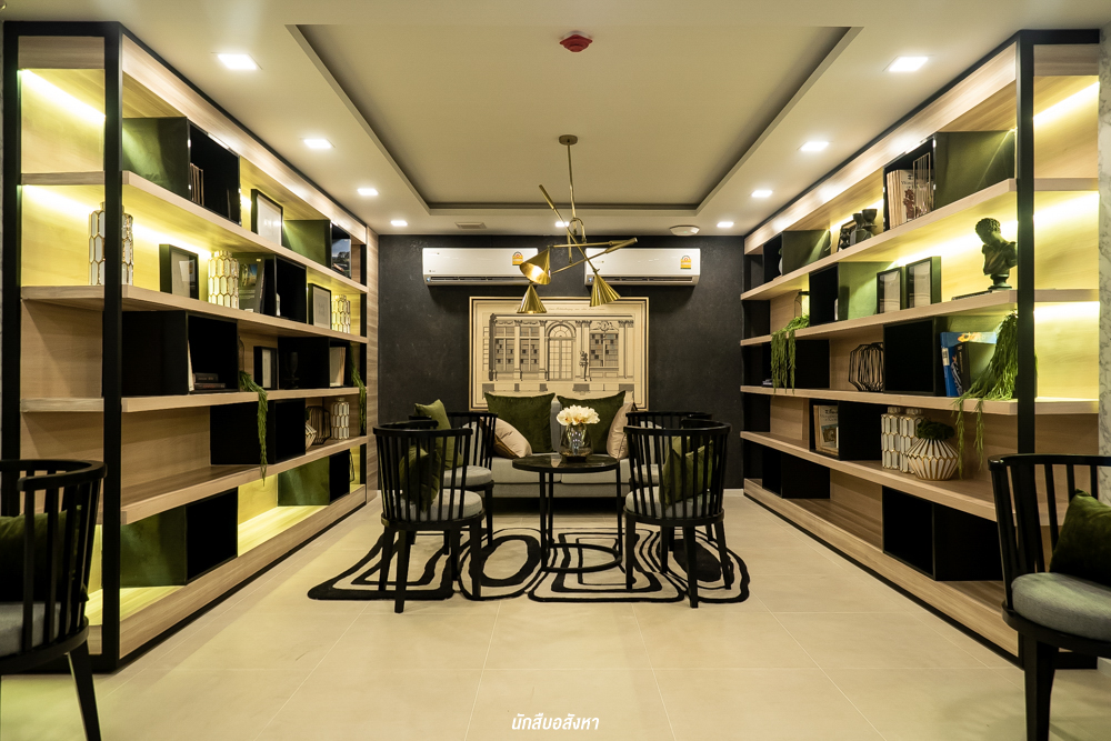 พื้นที่สำหรับการนั่งทำงาน คิดงาน และมีมุมห้อง Library ที่ดูกว้าง น่านั่งครับ ของจริงสวยกว่าในภาพ Perspective ครับ