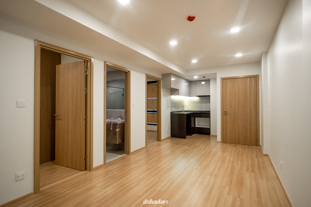 เนื่องจากโครงการขายหมดแล้วจึงไม่มีห้องตัวอย่างให้ผมดู แต่ก็มีห้องจริงที่โครงการพาผมชม แต่ก่อนจะไปชมห้อง ผมขอเล่ารายละเอียดก่อนว่าโครงการนี้มีห้องขนาดเท่าไหร่ แบบไหนบ้าง และแต่ละห้องมีข้อดีและข้อด้อยอย่างไรนะครับ ห้องของโครงการจะมีขนาดตั้งแต่ 27 ตร.ม. – 68 ตร.ม. และส่วนใหญ่จะเป็นห้อง 27-28 ตร.ม. ซึ่งโครงการวางห้องเล็ก แบบวิวดีครับ คือ หลายตำแหน่ง จะอยู่หน้าสระว่ายน้ำ ยิ่งเพิ่มความน่าสนใจเข้าไปอีก เพราะนอกจากราคาจะถูกเพราะขนาดห้องที่เล็กแล้ว ยังได้วิวส่วนกลางอย่าง สระว่ายน้ำอีกด้วย แต่ห้องใหญ่กลับวางไว้รอบนอก ซึ่งโดยรอบมีตึกด้านข้าง อันนี้ก็ถือว่าโครงการขายเก่งครับ เพราะราคาแพงกว่า วิวไม่ค่อยดีเท่าสระว่ายน้ำแต่ก็ขายหมด เอาเป็นว่ามาดูแต่ละห้องดีกว่าครับว่าฟังก์ชั่นและการจัดรูปแบบห้องจะเป็นอย่างไรบ้าง