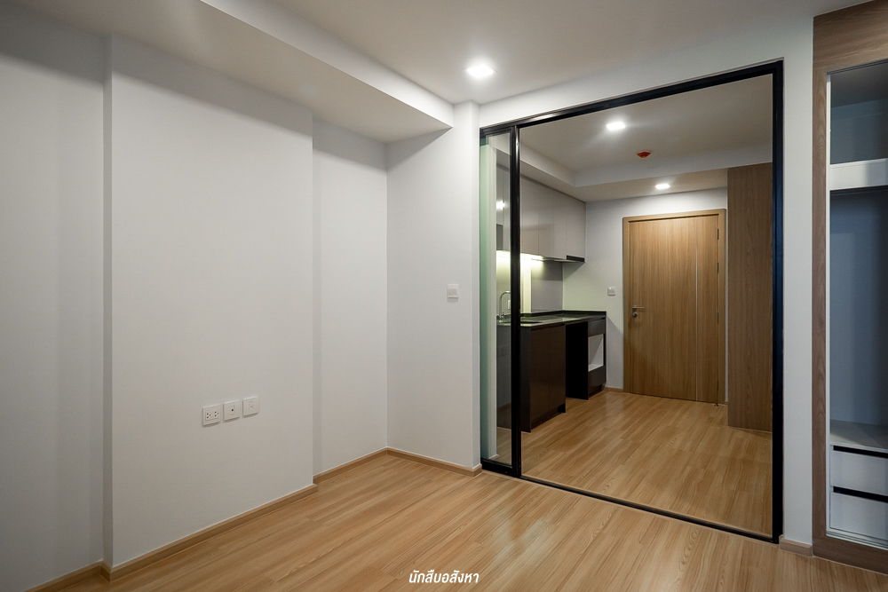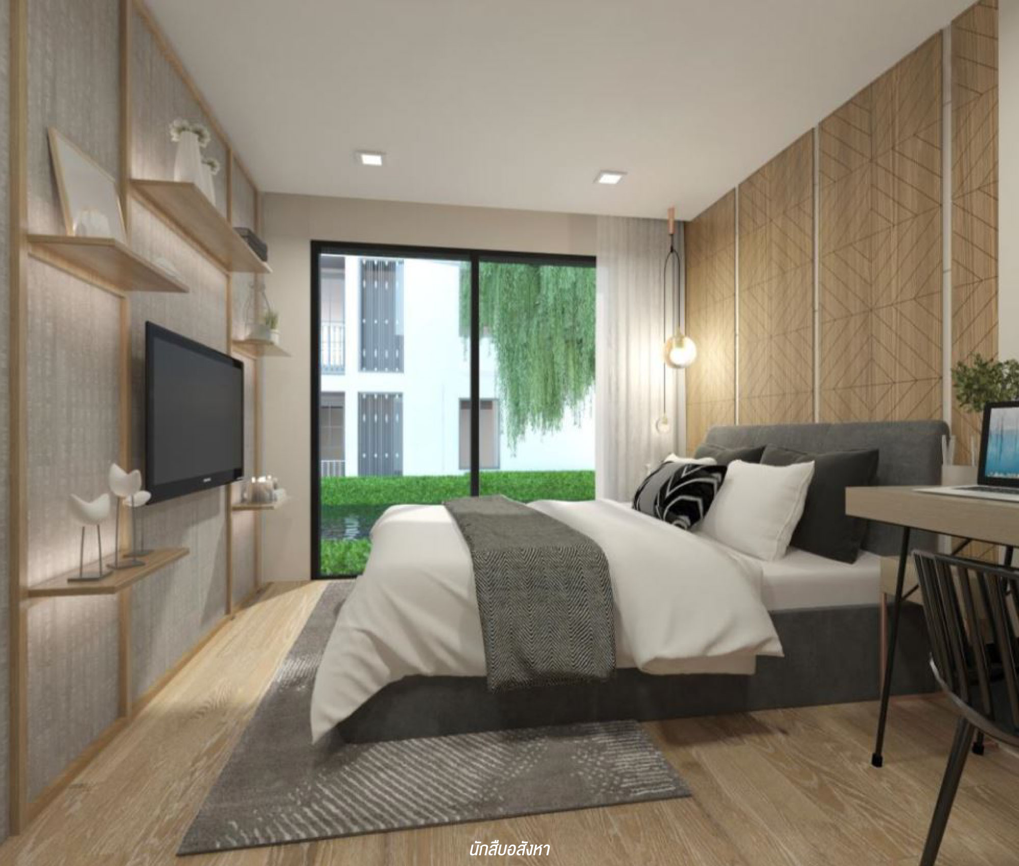 ห้องรูปแบบนี้ ส่วนตัวผมมองว่าแบ่งพื้นที่แบบง่ายๆ แต่ก็ชัดเจนครับ คือ แบ่งออกเป็นแค่ 2 ส่วน คือ ส่วนพื้นที่ครัว และพื้นที่ห้องนอน โดยใช้บานเลื่อนกั้นห้องให้ดูจัดสรรพื้นที่แต่ละส่วนชัดเจนขึ้น สิ่งที่ผมชอบ คือ การที่มีมุมโต๊ะทำงานไว้ในห้องนอนใกล้ระเบียง และห้องส่วนใหญ่ของห้องนี้ จะเป็นวิวสระว่ายน้ำ ทำให้เวลาทำงานก็สามารถที่สร้างสรรค์ความคิด โดยมองผ่านวิวได้ แต่ที่ผมไม่ชอบ คือ การที่นำพื้นที่นั่งเล่นมาไว้ตรงห้องนอนและอยู่ปลายเตียง ฟังก์ชันมันดูไม่ค่อยลงตัว แต่ก็แล้วแต่คนชอบ ถ้าใครชอบแบบนี้ คือ เพื่อนที่มาห้องต้องสนิทกันแบบมากๆ ครับ เพราะฟังก์ชันห้องแบบนี้ เหมาะกับคนที่อยู่คนเดียวหรือกับแฟนแค่ 2 คน เพราะมันดูส่วนตัว เนื่องจากฟังก์ชันทุกอย่างจะเอาไว้ที่ห้องนอนเป็นส่วนใหญ่ ส่วนครัวด้านหน้าและห้องน้ำ พื้นที่ก็อาจจะดูเล็กไปหน่อย เนี่ยก็คงเป็นข้อเสียของรูปแบบแปลนตอนลึกครับที่อาจจะวางฟังก์ชันไม่ค่อยลงตัวเท่าที่ควร
