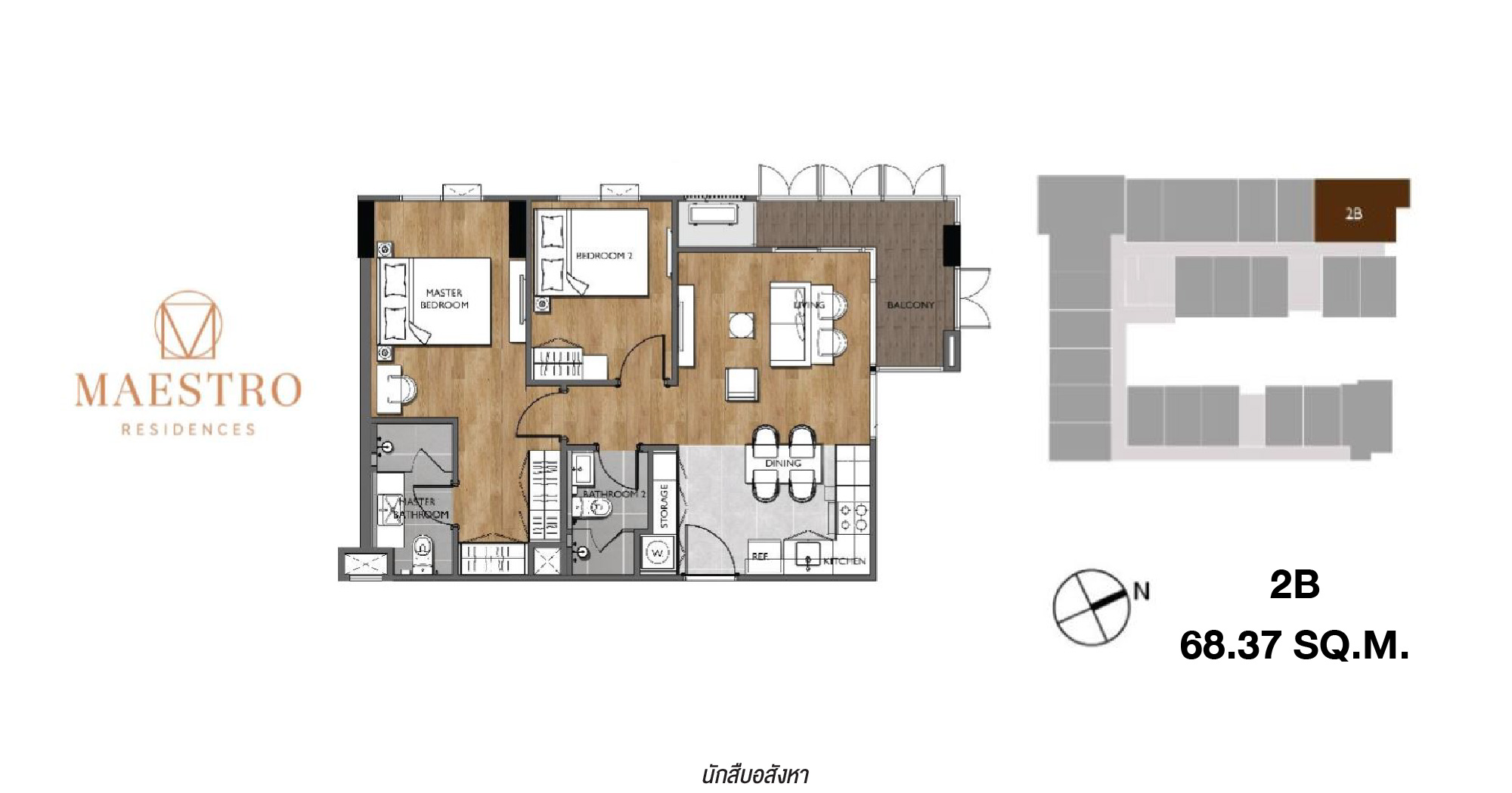 68.37 ตร.ม. 2 ห้องนอน แปลนหน้ากว้าง เพิ่ม Walk in Closet เน้นวิวตรงระเบียง