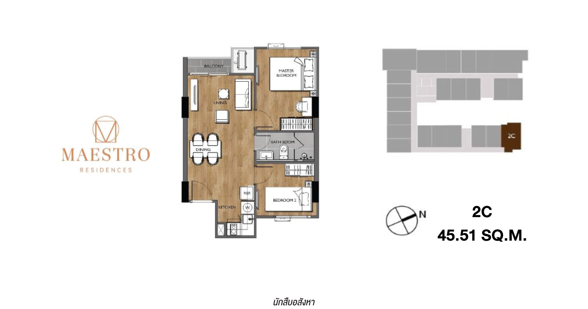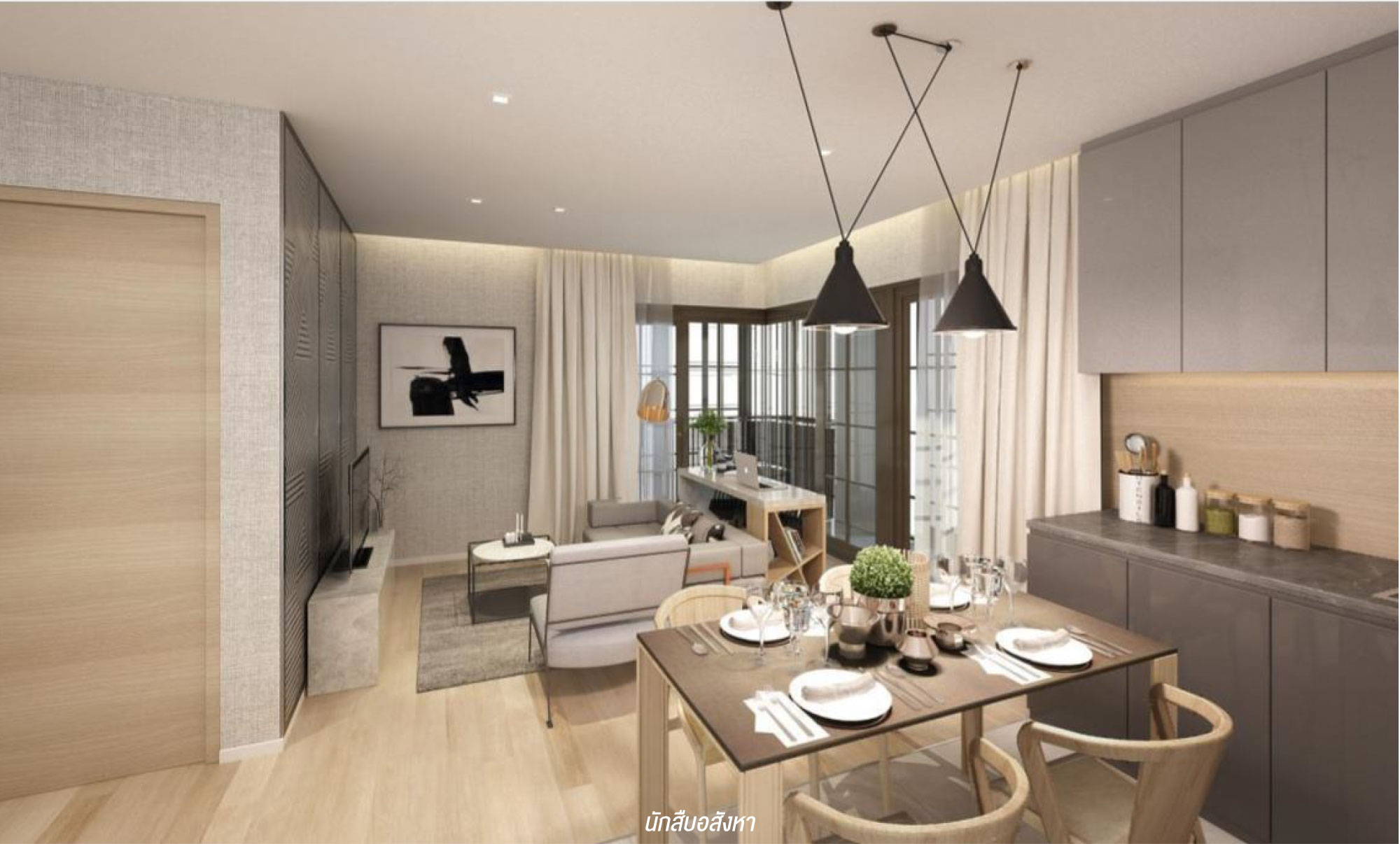 45.51 ตร.ม. 2 ห้องนอน แปลนตอนลึก เน้นห้องนั่งเล่น