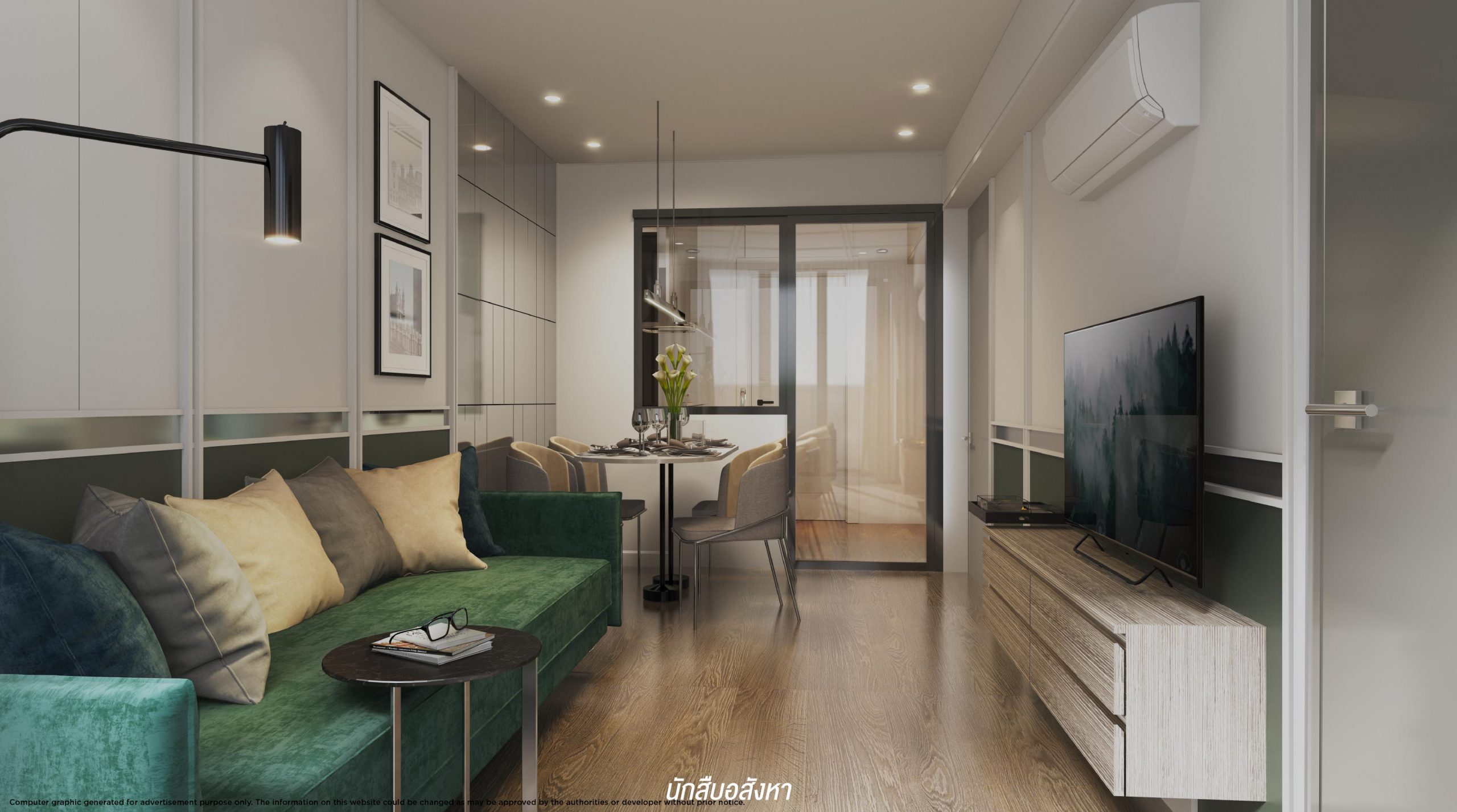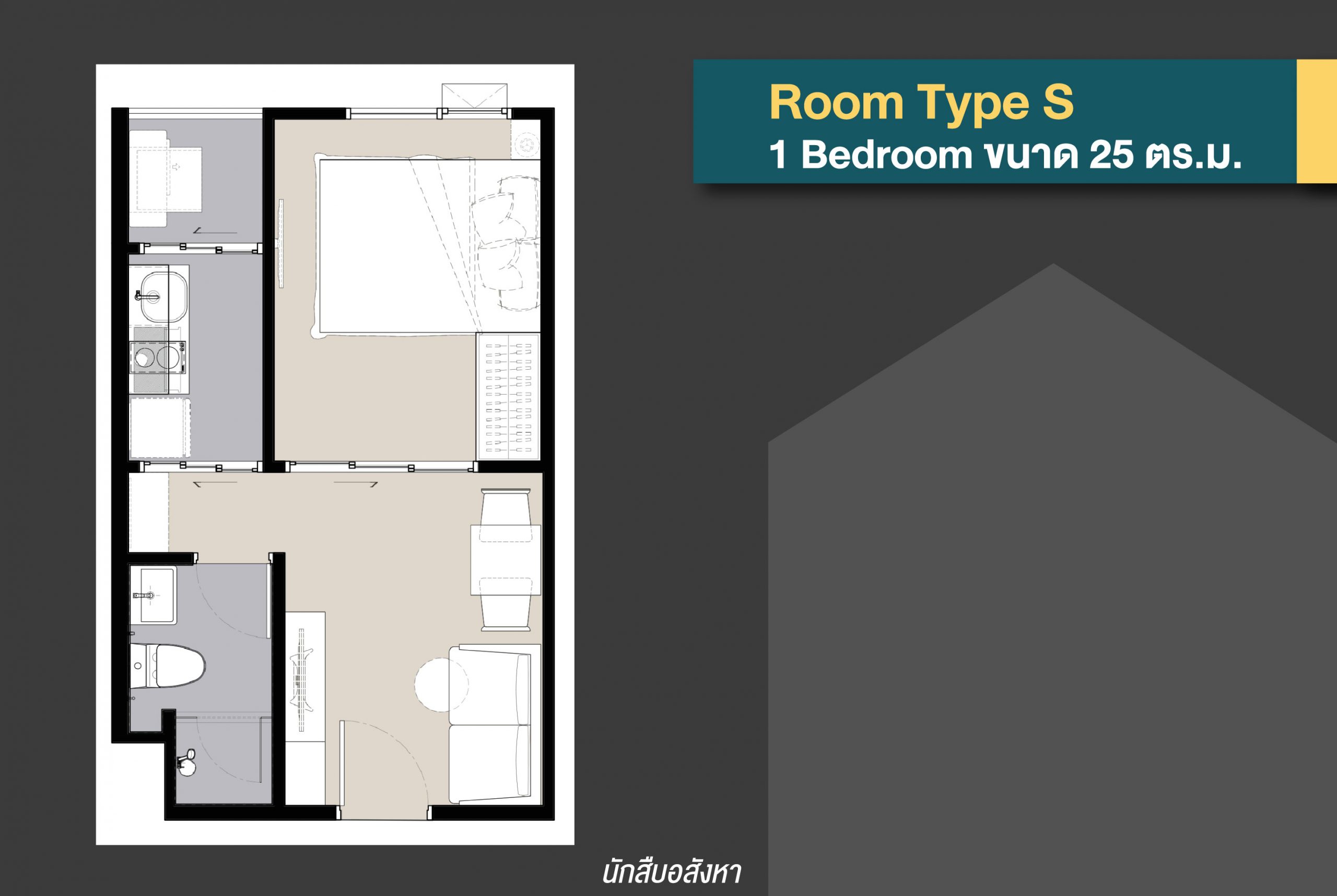 เริ่มจากห้อง Type ที่เรียกว่าเป็นไซส์ S ซึ่งจะเป็นห้องรูปแบบ 1 Bedroom ขนาด 25 ตร.ม. ครับ ห้องรูปแบบนี้ทางโครงการวางให้ลงตัวกับกลุ่มคนโสดที่เริ่มต้นออกเดินทางตามหาความฝัน ตามความถนัด และมี Passion ที่หลากหลาย โดยตัวห้องจะค่อนข้างตอบโจทย์การเป็นที่พักระหว่างการเดินทางสู่ความสำเร็จ จะมีการแบ่งฟังก์ชันการใช้งานภายในห้องเป็นสัดส่วนพอดีกับการใช้ชีวิต และมี Package Price ที่ไม่สูง ทำให้ยังสามารถบริหารรายได้ไปต่อเติมความฝันส่วนอื่นๆ ได้ หลักๆ แล้วจะลงตัวกับกลุ่ม First Jobber ที่เพิ่งต้นชีวิตในวัยทำงานนั่นเองครับ