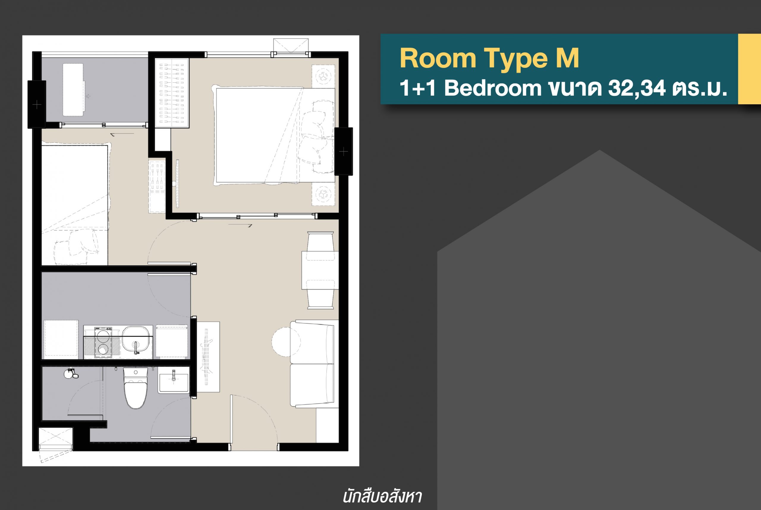 มาต่อกันที่ห้อง Type ที่ 2 หรือห้องไซส์ M กันครับ สำหรับห้อง Type นี้จะเป็นห้อง 1 + 1 Bedroom ขนาด 32, 34 ตร.ม. ด้วยพื้นที่ใช้สอยที่ขยายมากขึ้น ห้อง Type จึงเหมาะกับกลุ่มคนที่เพิ่งเริ่มต้นชีวิตครอบครัว มีลูกเล็ก และมีเป้าหมายเพื่อตัวเองและครอบครัวเป็นหลัก ซึ่งตัวห้องจะแบ่งเป็นสัดส่วนที่ค่อนข้างตอบสนองการใช้ชีวิต โดยห้องขนาด 34 ตร.ม.จะมี Home Automation ที่ควบคุมระบบเครื่องปรับอากาศ และแสงสว่างผ่าน APPLICATION ที่จะเข้ามาช่วยอำนวยความสะดวกในการใช้ชีวิตมากยิ่งขึ้นอีกด้วยครับ