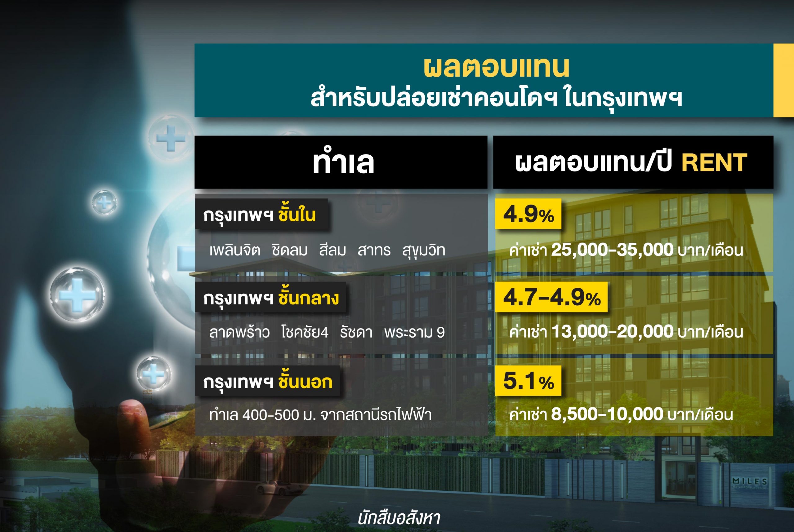 ซึ่งข้อมูลจากฝ่ายวิจัยและพัฒนา พลัส พร็อพเพอร์ตี้ ที่ได้ทำการสำรวจพื้นที่กรุงเทพฯ เกี่ยวกับผลตอบแทนในการปล่อยเช่าคอนโดฯ นั้น จะเห็นได้ว่าทำเลกรุงเทพฯ ชั้นกลางอย่างโซนลาดพร้าว โชคชัย 4 รัชดา และพระราม 9 นั้นให้ผลตอบแทนที่ค่อนข้างน่าสนใจ 4.7 – 4.9% และค่าเช่าเฉลี่ยอยู่ที่ 25,000 – 35,000 บาท/เดือน ถือว่าเป็นตัวเลขที่น่าสนใจสำหรับกลุ่มนักลงทุน หรือแม้แต่คนที่กำลังมองหา Passive Income ในอนาคต เพราะผมเองกล้าพูดเลยครับว่าทำเลกรุงเทพฯ ชั้นกลางในอนาคตจะกลายเป็นทำเลแห่งที่อยู่อาศัยและการลงทุนที่น่าจับตามองอย่างแน่นอน