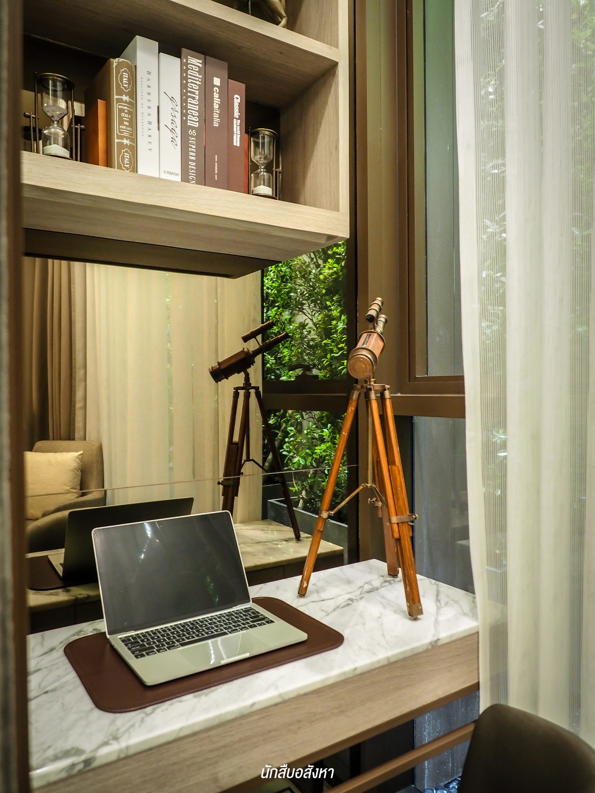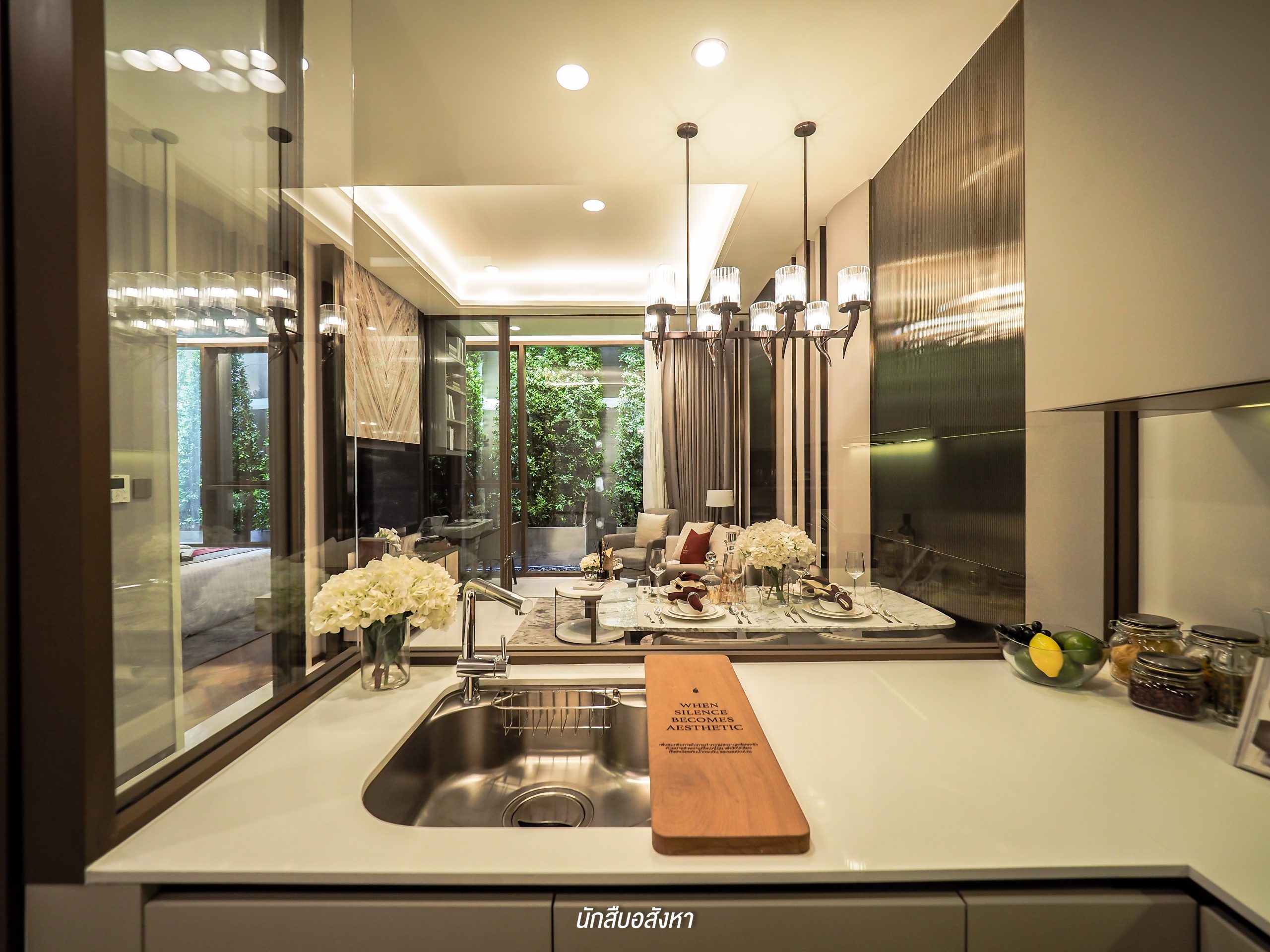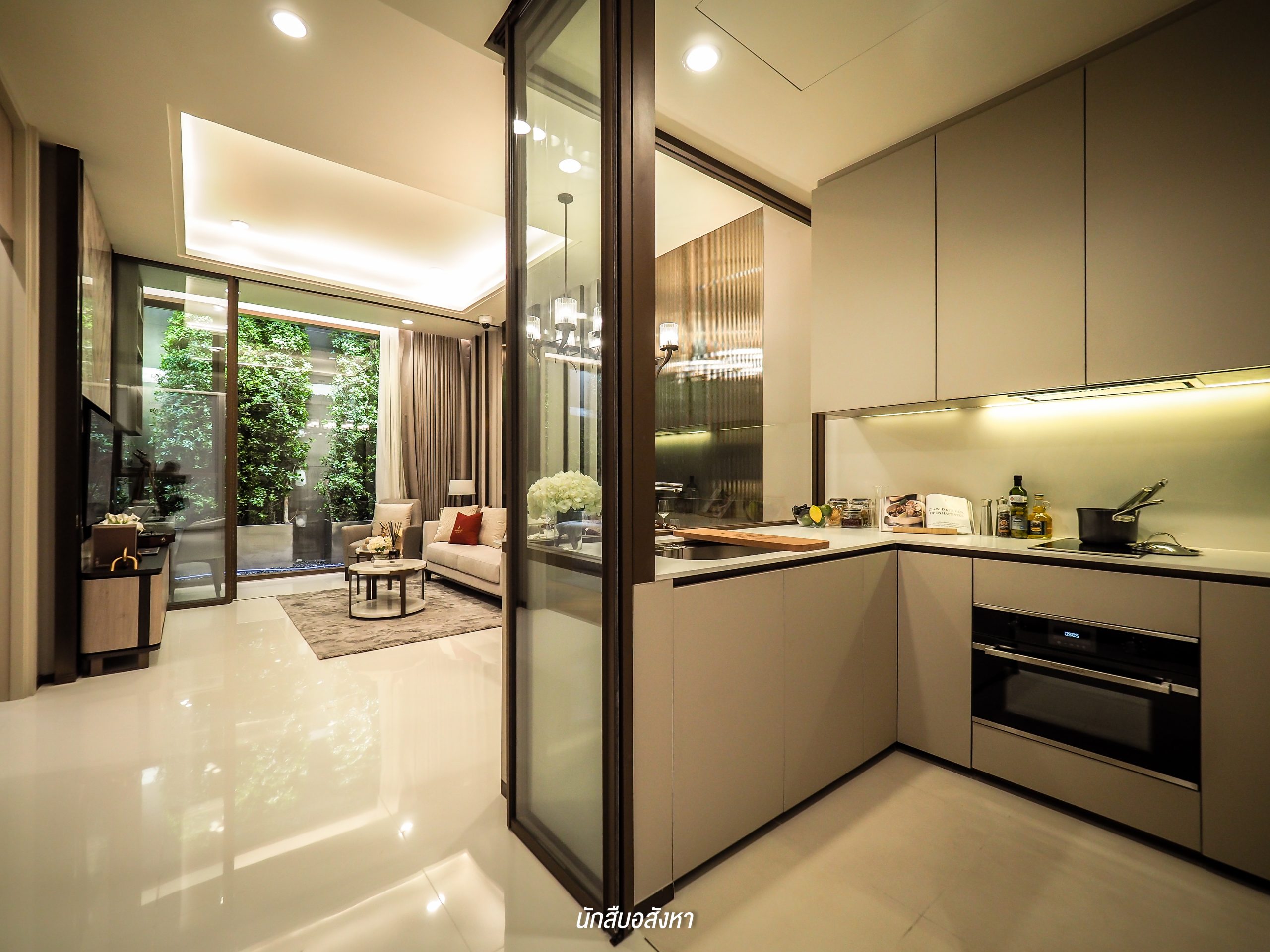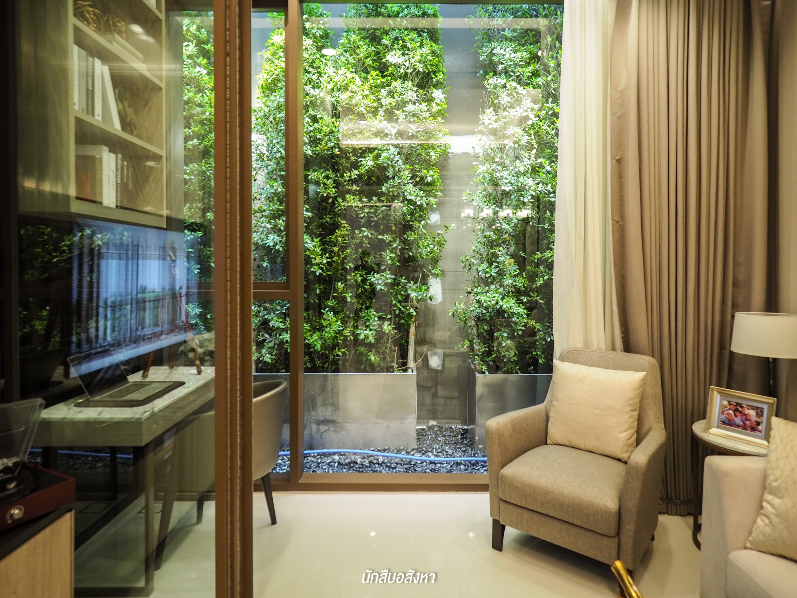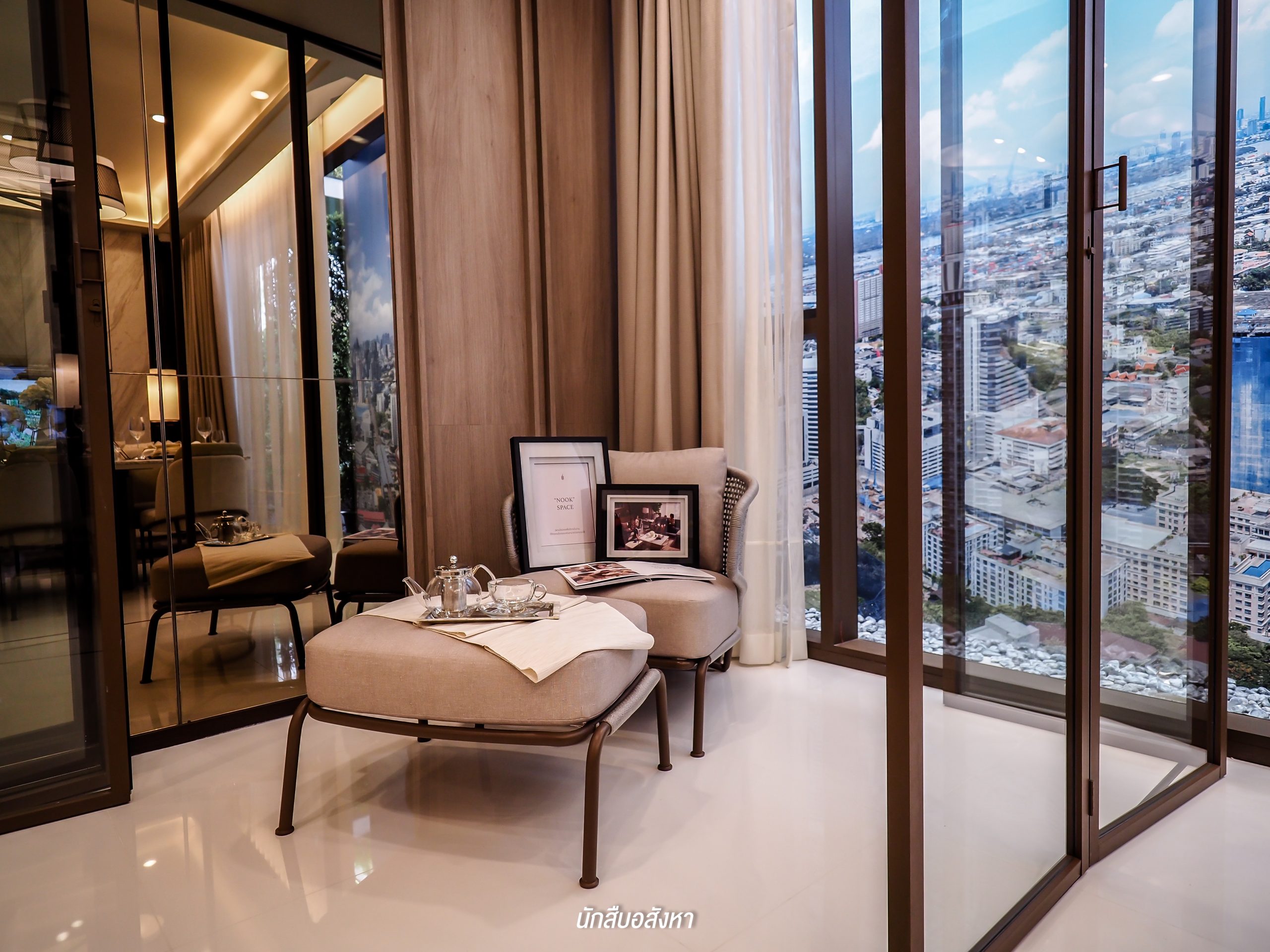ห้องนี้ไม่มีระเบียงนะครับ ซึ่งอีกมุมที่เห็นแล้วผมชอบก็คือ Multipurpose Space หรือฟังก์ชัน “Nook” ซึ่งมุมนี้ผมว่าทดแทนระเบียงได้เลยครับ เพราะสามารถใช้งานได้ไม่ต่างกันนัก ลูกบ้านเองสามารถทำเป็นมุมสำหรับทำงาน หรือจิบน้ำชาสำหรับผู้สูงอายุก็ได้ โดยด้านข้างจะเป็นกระจกทรงสูงที่สามารถเปิดรับแสงจากธรรมชาติและเทควิวด้านนอกได้เช่นกัน