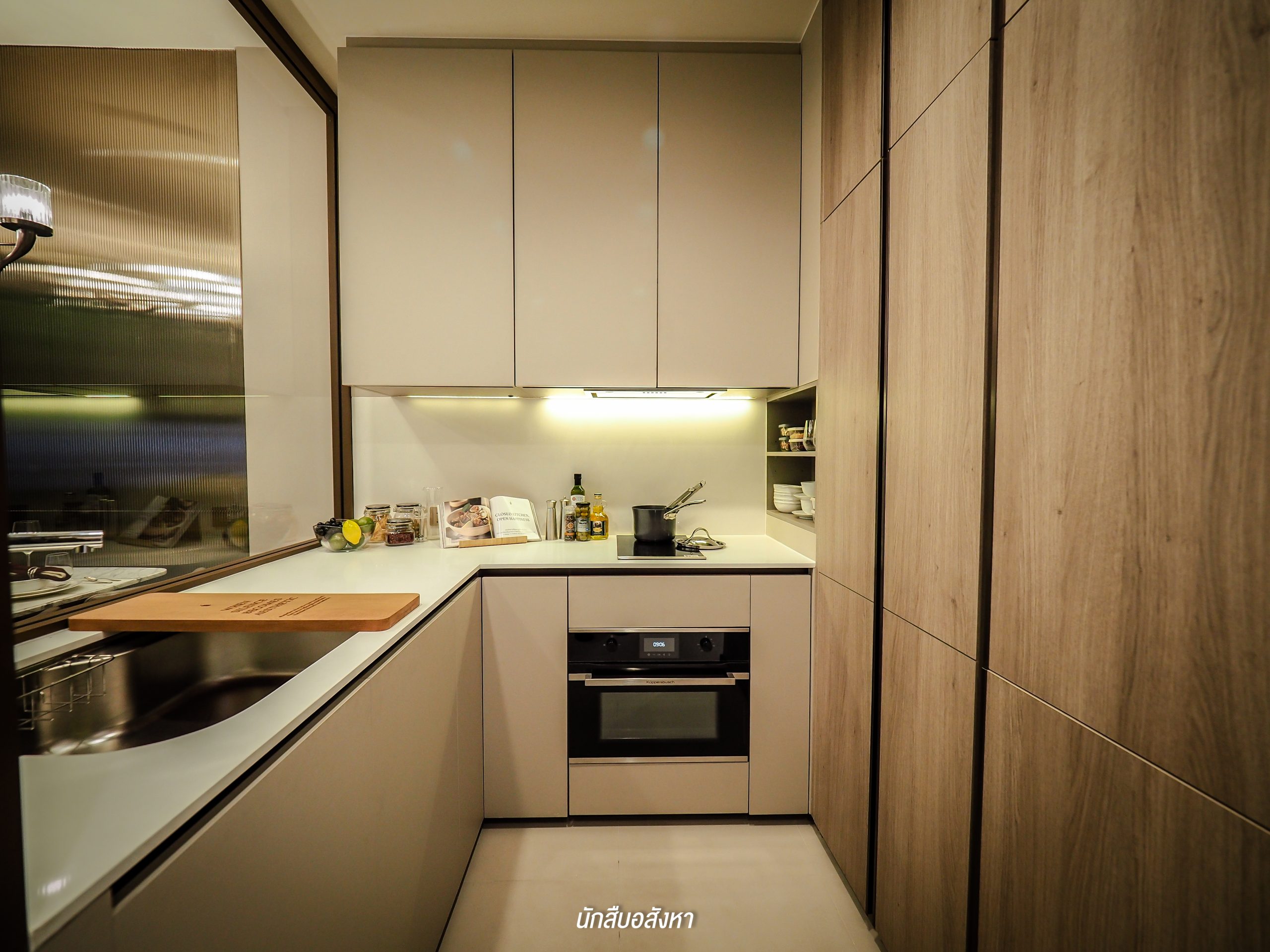 สำหรับประตูห้องของทางโครงการทุก Type จะได้เป็นประตูแบบ Digital Door Lock และเมื่อเปิดประตูเข้ามาจะเจอกับพื้นที่ของห้องครัวด้านขวามือก่อนเลยครับ โดยฟังก์ชันครัวของของ Type นี้จะเป็นฟังก์ชันครัวปิด ซึ่งทางโครงการตกแต่งครัวมาเป็นรูปแบบ L – Shaped Kitchen อุปกรณ์ภายในครัวนั้นทางโครงการให้มาครบครับ อย่างเครื่องดูดควันและตู้เย็นทางโครงการก็มีมาให้เลย ส่วนมุม Laundry นั้นจะอยู่ในห้องครัว โดยโครงการจะ Built-in เป็นชั้นสำหรับใส่เครื่องซักผ้าไว้ให้ ช่วยประหยัดพื้นที่ใช้สอยภายในห้องได้ดีเลยครับ
