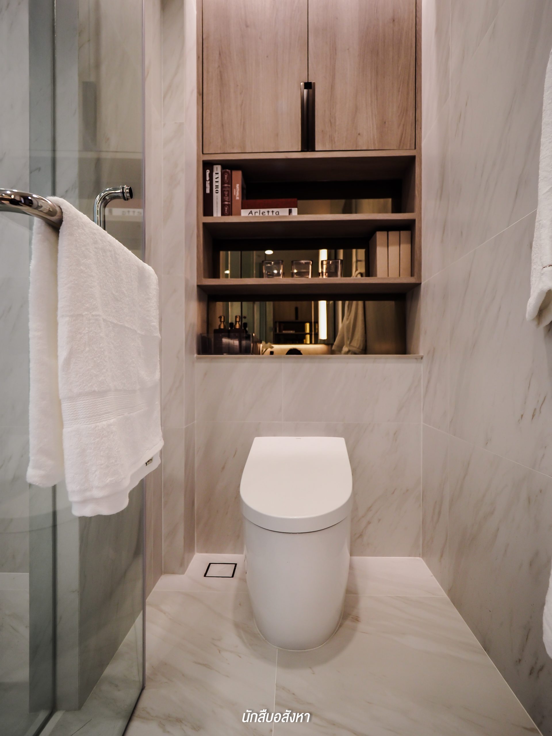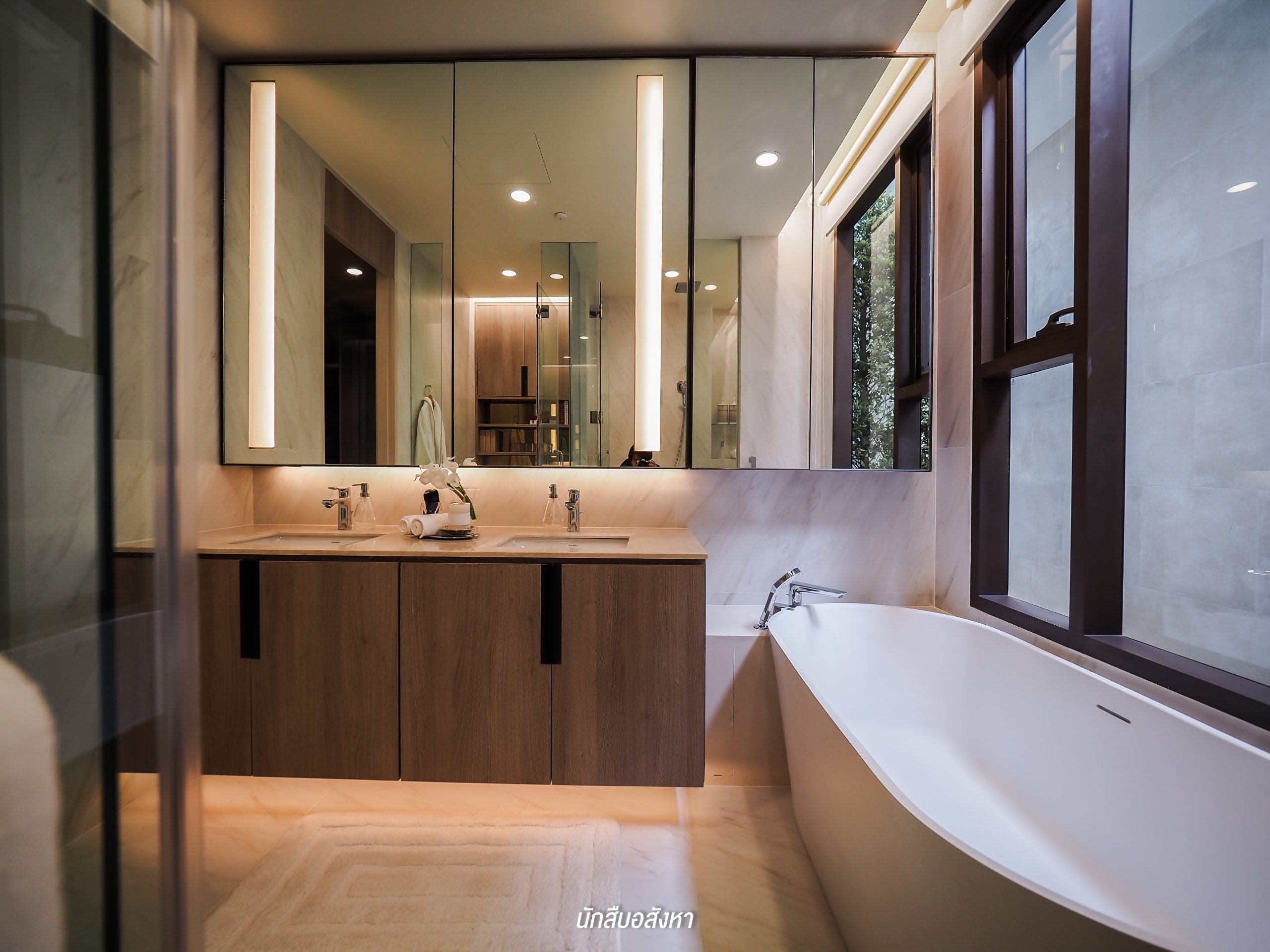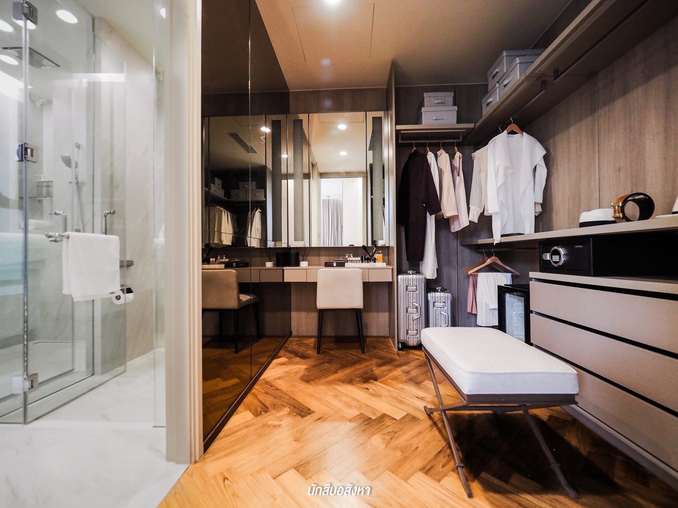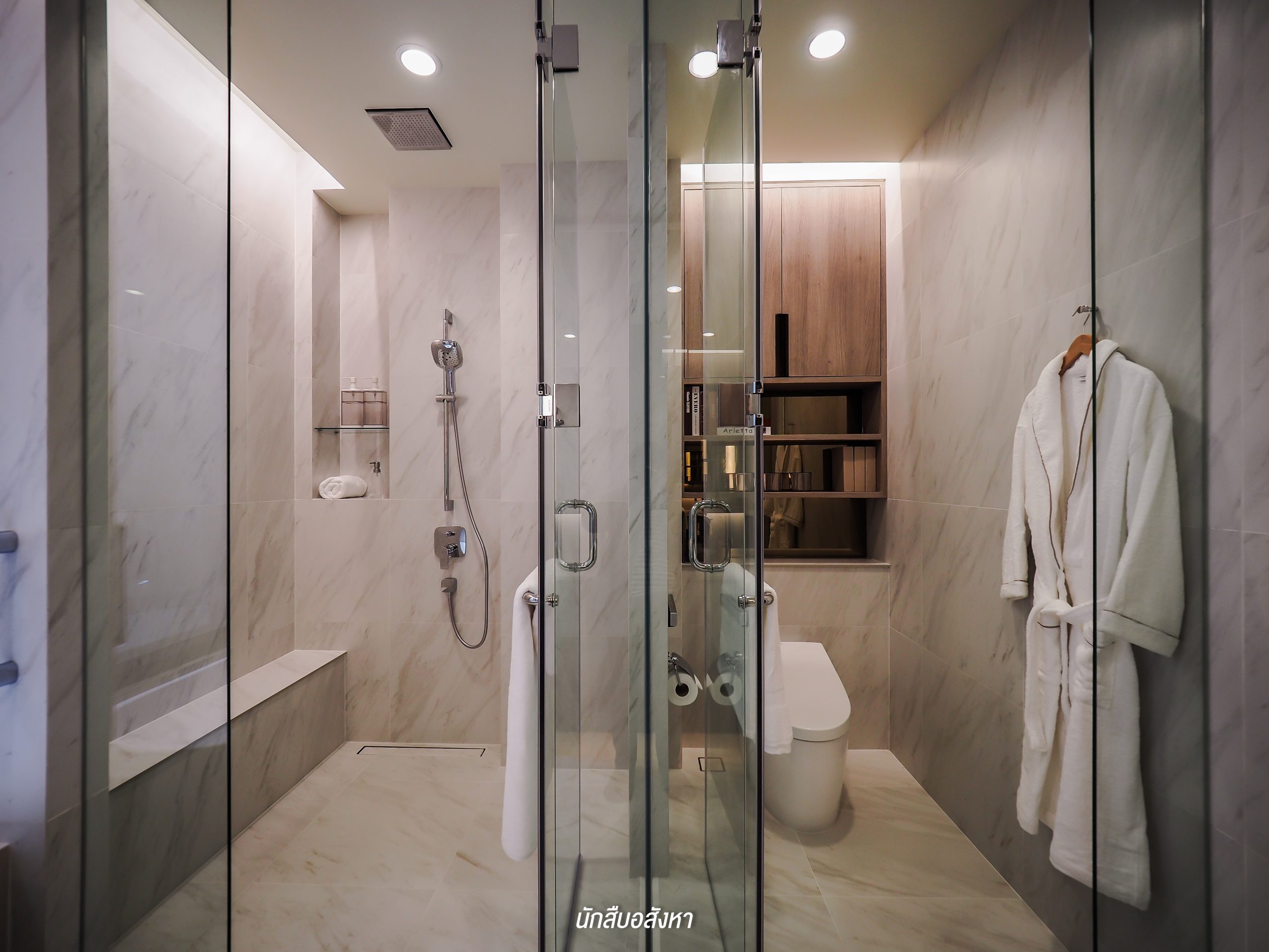 โดยตัวของ Walk-in Closet นั้นจะเชื่อมต่อกับห้องน้ำ ค่อนข้างสะดวกในการใช้งานในชีวิตประจำวัน ซึ่งห้องน้ำจะได้แบบนี้เลยครับ มีอ่างล้างหน้าให้ 2 ชุด ตัวก๊อกน้ำจะเป็นแบบร้อน/เย็น พื้นที่ภายในจะแยกโซนเป็นสัดส่วนทั้งแห้งและเปียก โซนอาบน้ำนั้นมี Rain Shower พร้อมที่นั่งสำหรับผู้สูงอายุด้วยครับ ส่วนตัวสุขภัณฑ์ของอีกโซนนั้นก็เป็นแบรนด์มาตรฐานระบบ Auto แต่สำหรับชั้นวางของด้านหลังสุขภัณฑ์นั้นทางโครงการไม่ได้ให้มาพร้อม แต่ลูกบ้านเองก็สามารถตกแต่งตามไอเดียของห้องตัวอย่างได้ครับ
