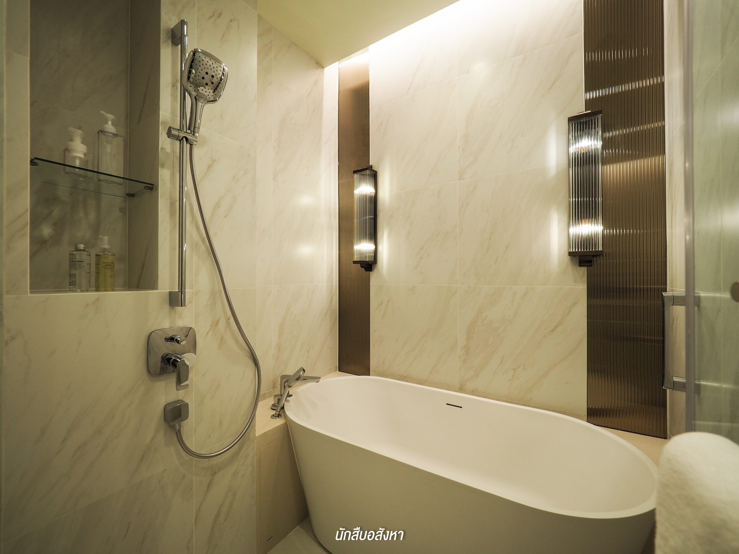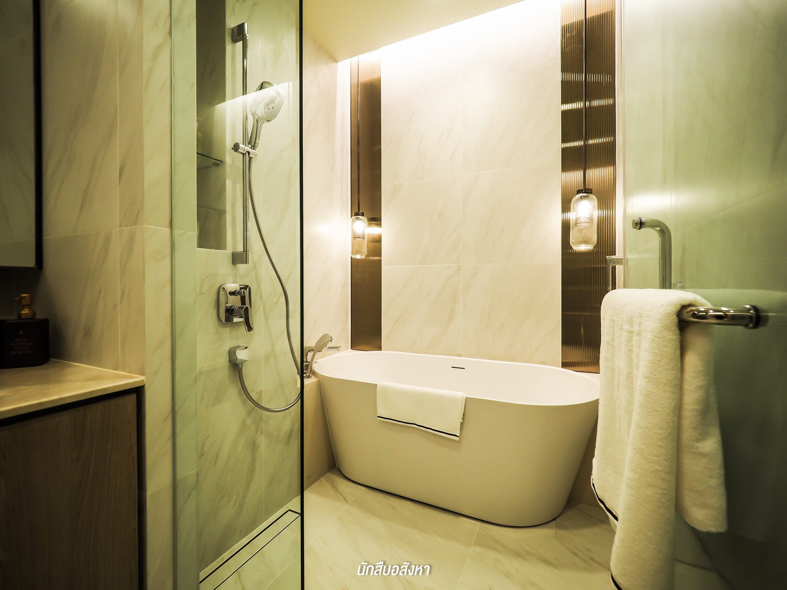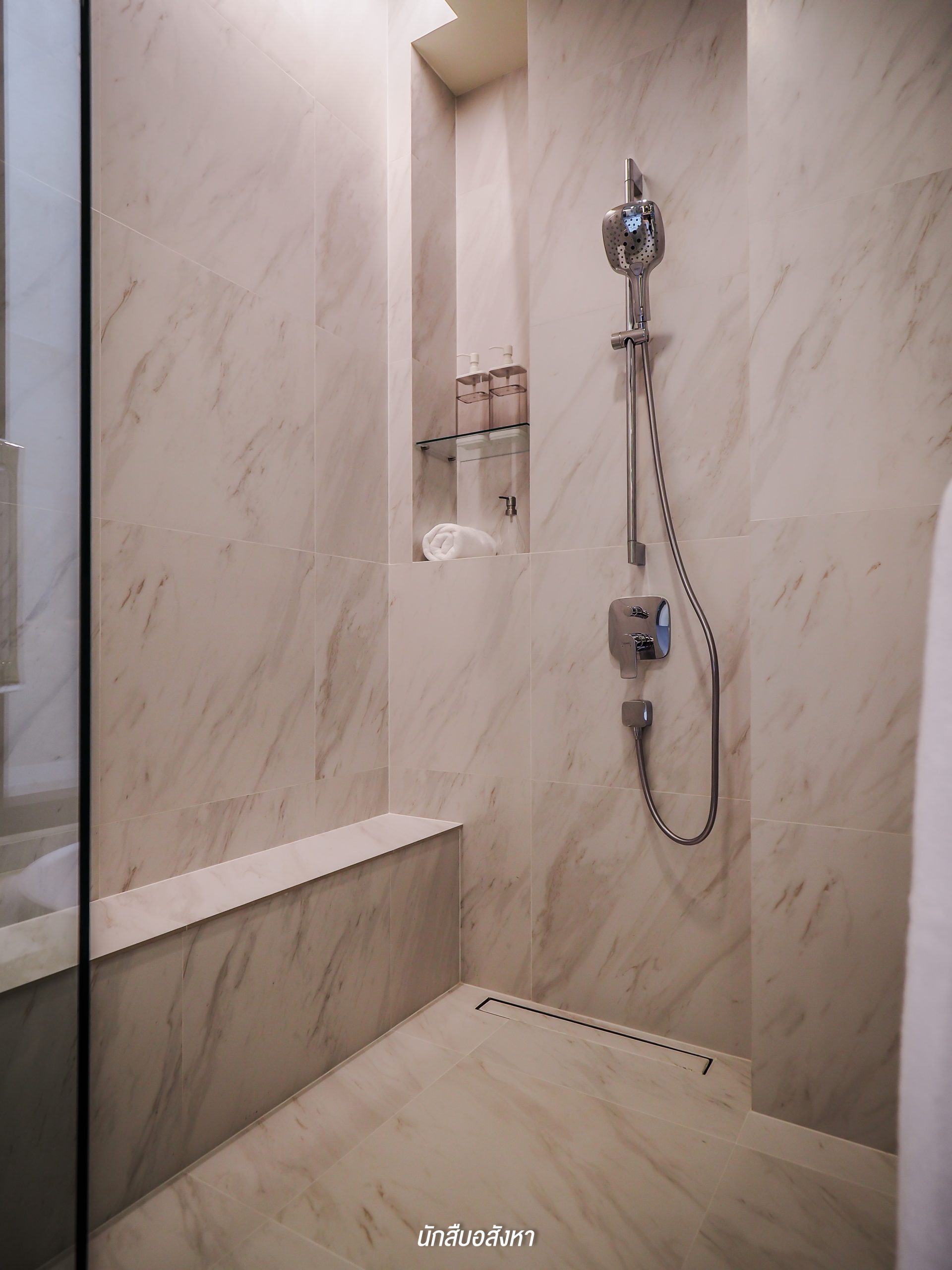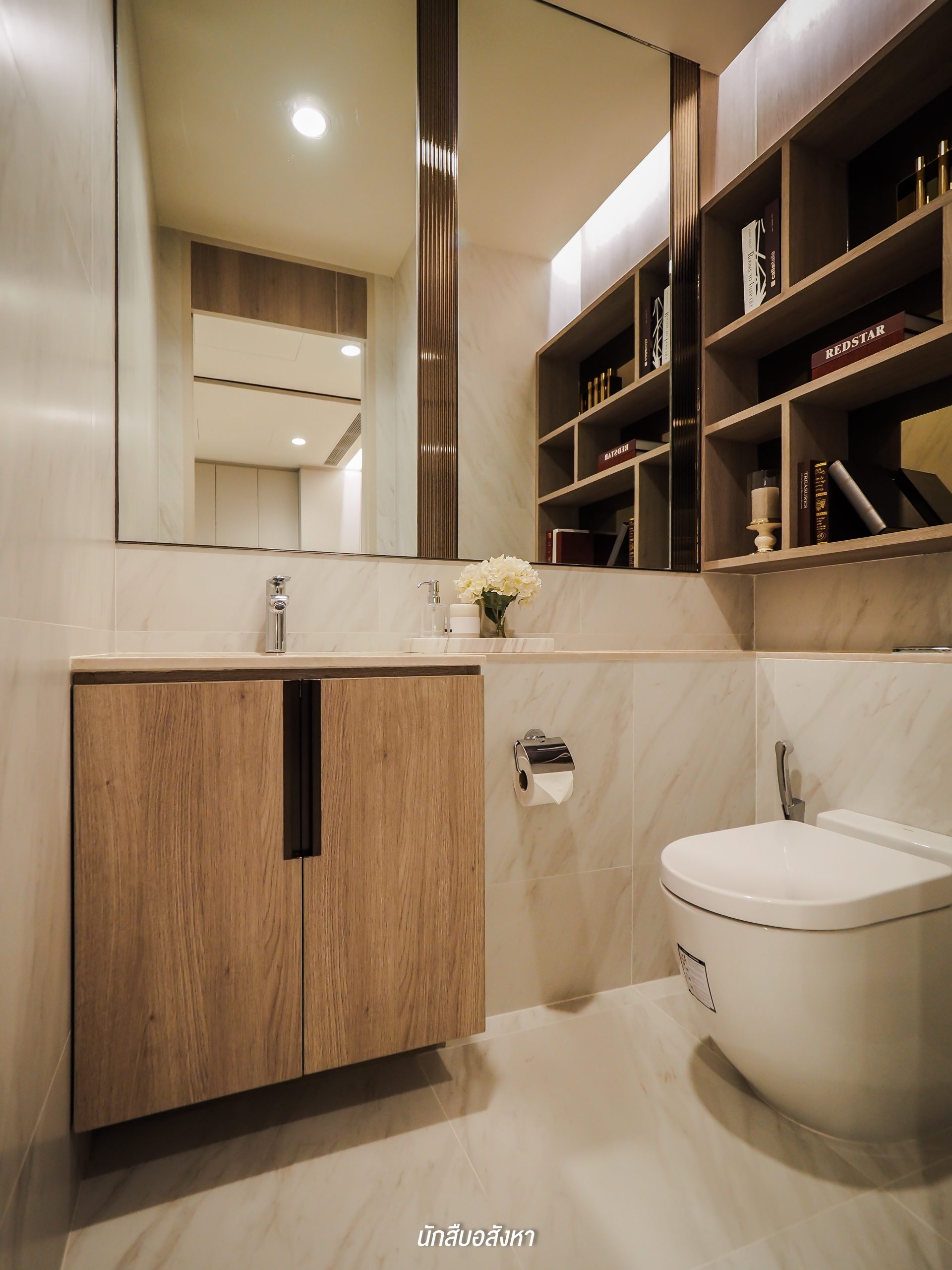 โดยตัวของ Walk-in Closet นั้นจะเชื่อมต่อกับห้องน้ำ ค่อนข้างสะดวกในการใช้งานในชีวิตประจำวัน ซึ่งห้องน้ำจะได้แบบนี้เลยครับ มีอ่างล้างหน้าให้ 2 ชุด ตัวก๊อกน้ำจะเป็นแบบร้อน/เย็น พื้นที่ภายในจะแยกโซนเป็นสัดส่วนทั้งแห้งและเปียก โซนอาบน้ำนั้นมี Rain Shower พร้อมที่นั่งสำหรับผู้สูงอายุด้วยครับ ส่วนตัวสุขภัณฑ์ของอีกโซนนั้นก็เป็นแบรนด์มาตรฐานระบบ Auto แต่สำหรับชั้นวางของด้านหลังสุขภัณฑ์นั้นทางโครงการไม่ได้ให้มาพร้อม แต่ลูกบ้านเองก็สามารถตกแต่งตามไอเดียของห้องตัวอย่างได้ครับ